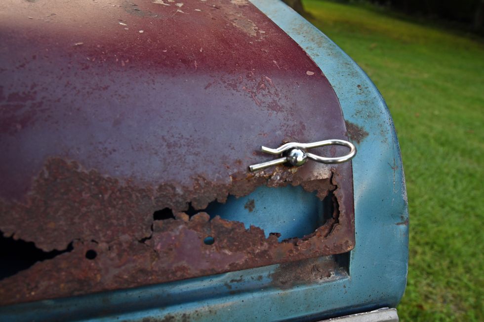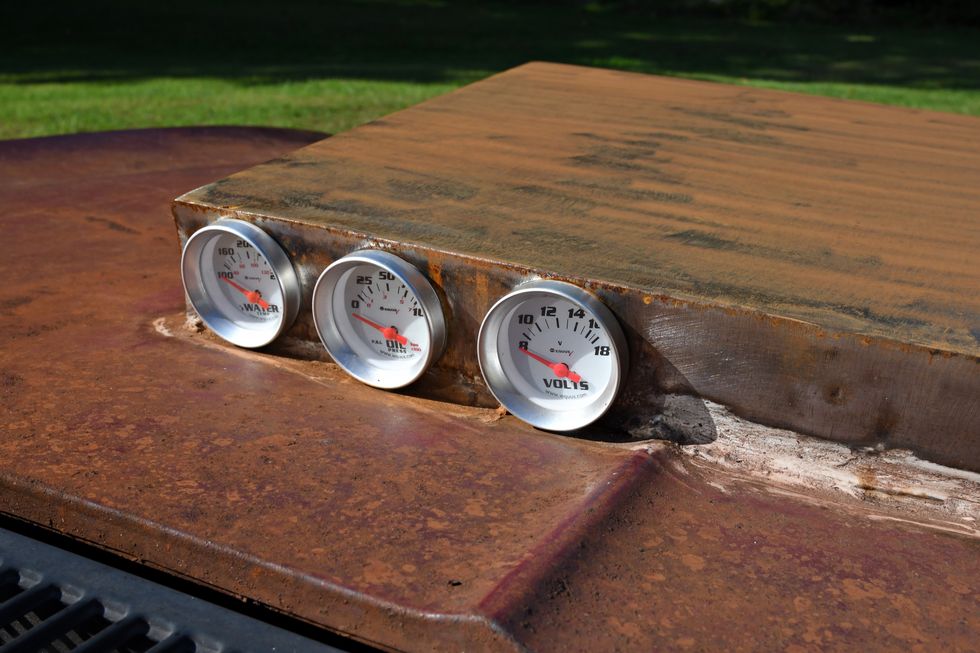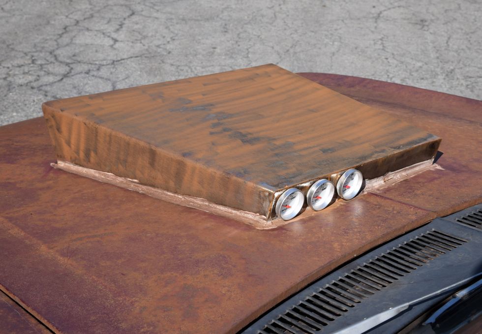 Dan’s Nova has had a hard life over the past couple of decades. It sat out for years, obtaining this rough patina in the process. The hoodscoop is built out of steel and incorporates a set of aftermarket gauges for the old-school look he was after. As for the front bumper? “I put the bumper on and didn’t like the way it looked. I prefer it this way, and so do my kids.”Photo: Scott Lachenauer