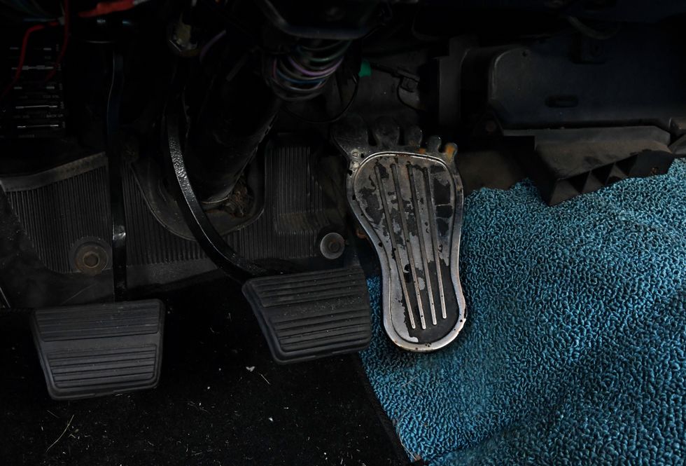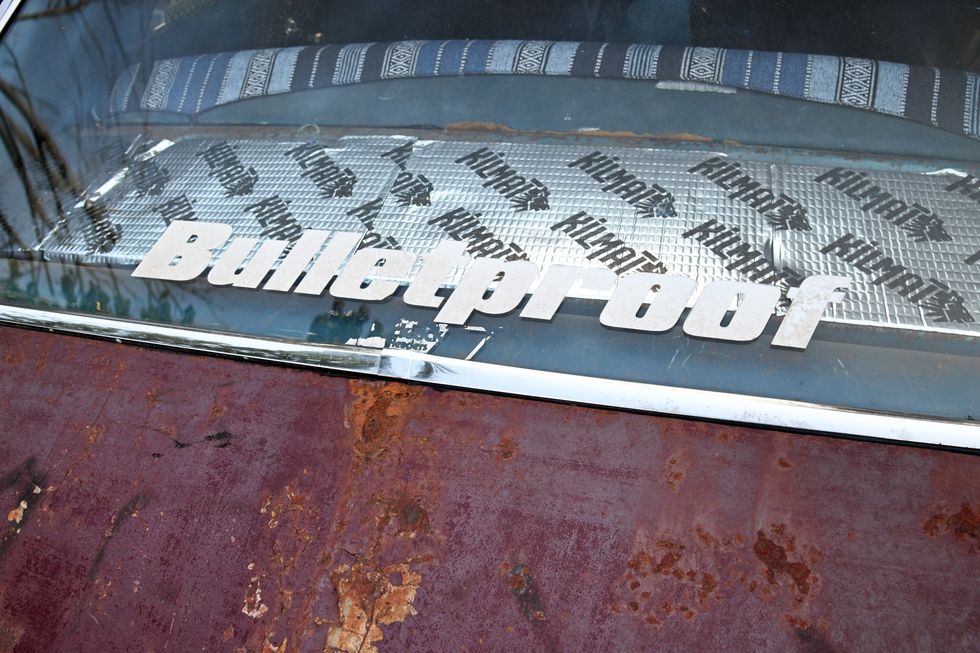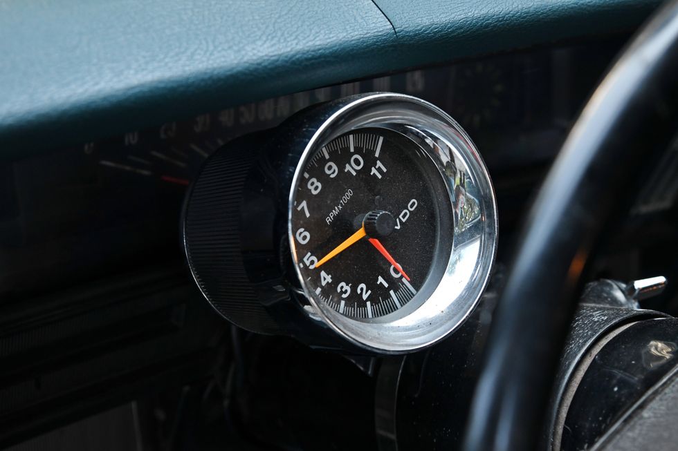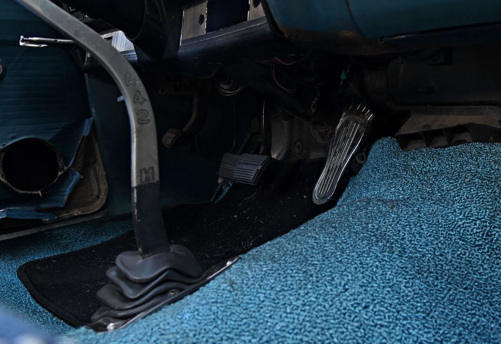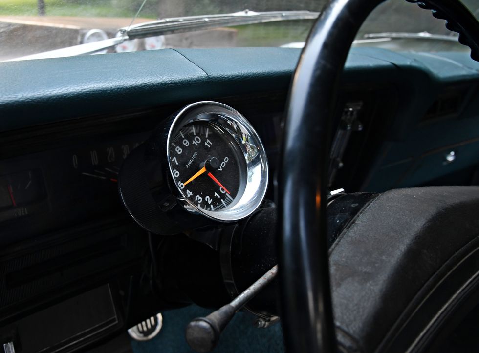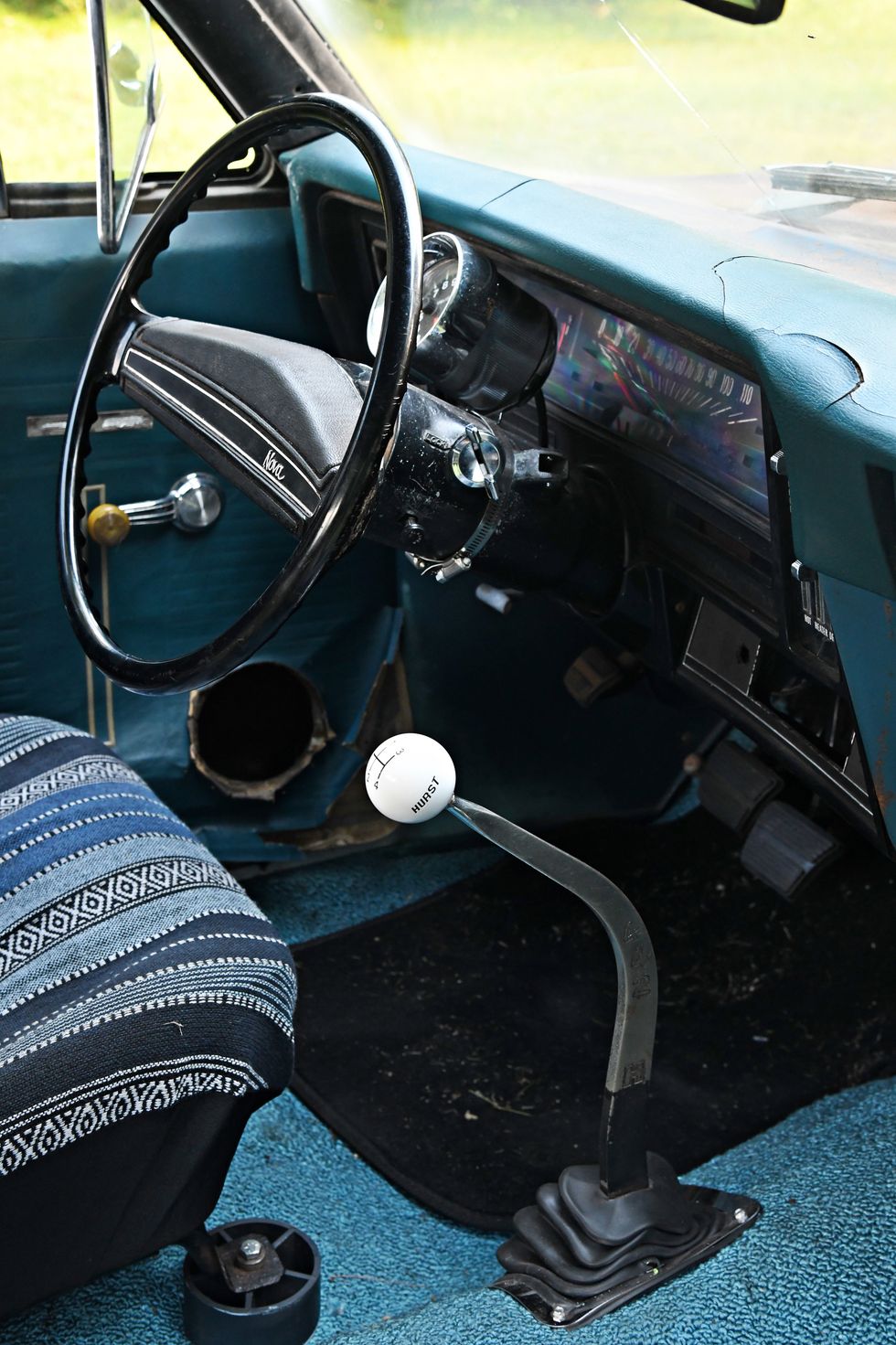 Nothing but bare bones here. Dan sourced some cheap junkyard seats and then “upholstered” them in Mexican blankets he bought off of Amazon. One cool piece here is the original Hurst 442 bench shifter.Photo: Scott Lachenauer