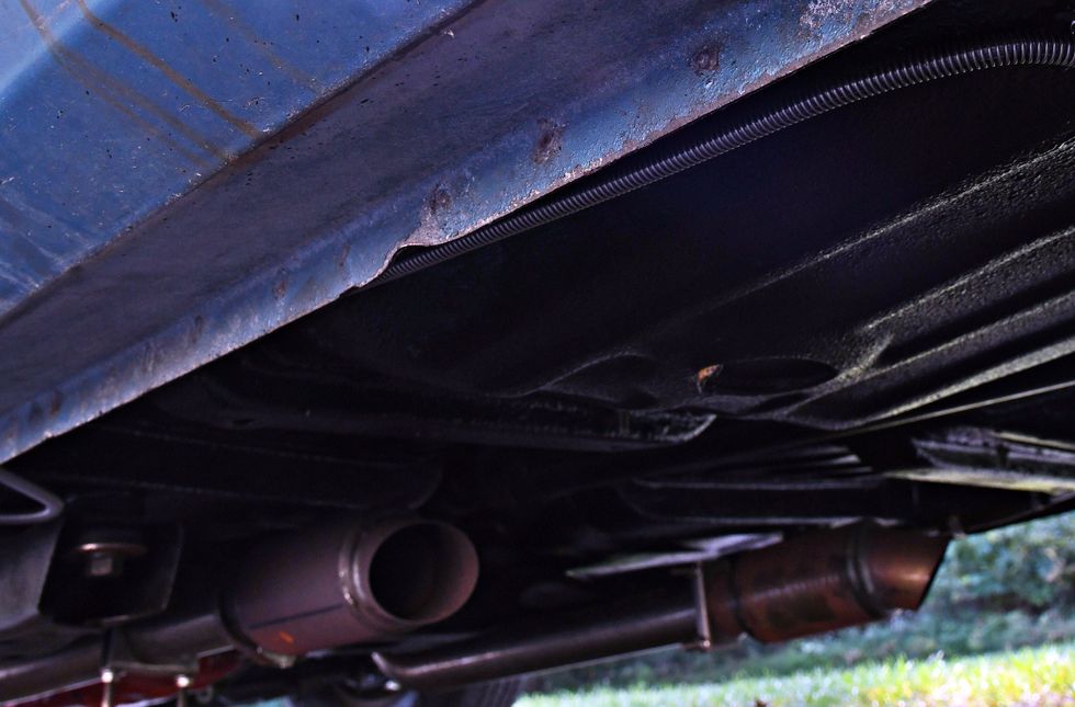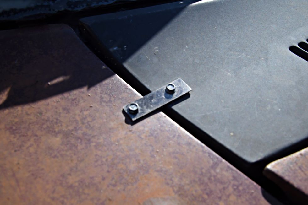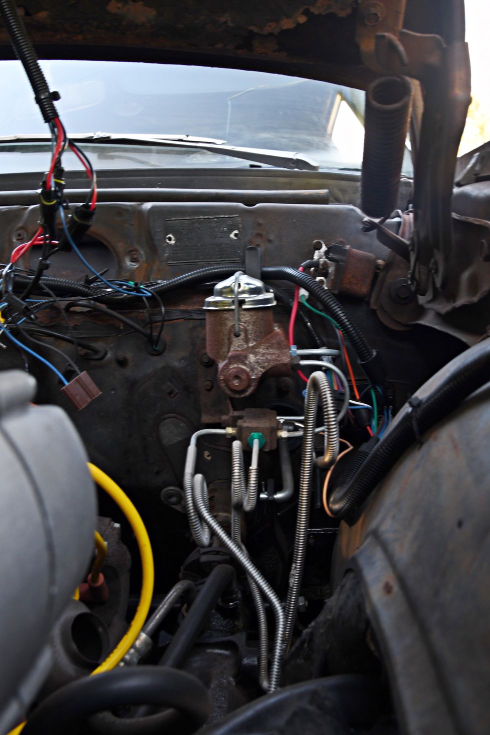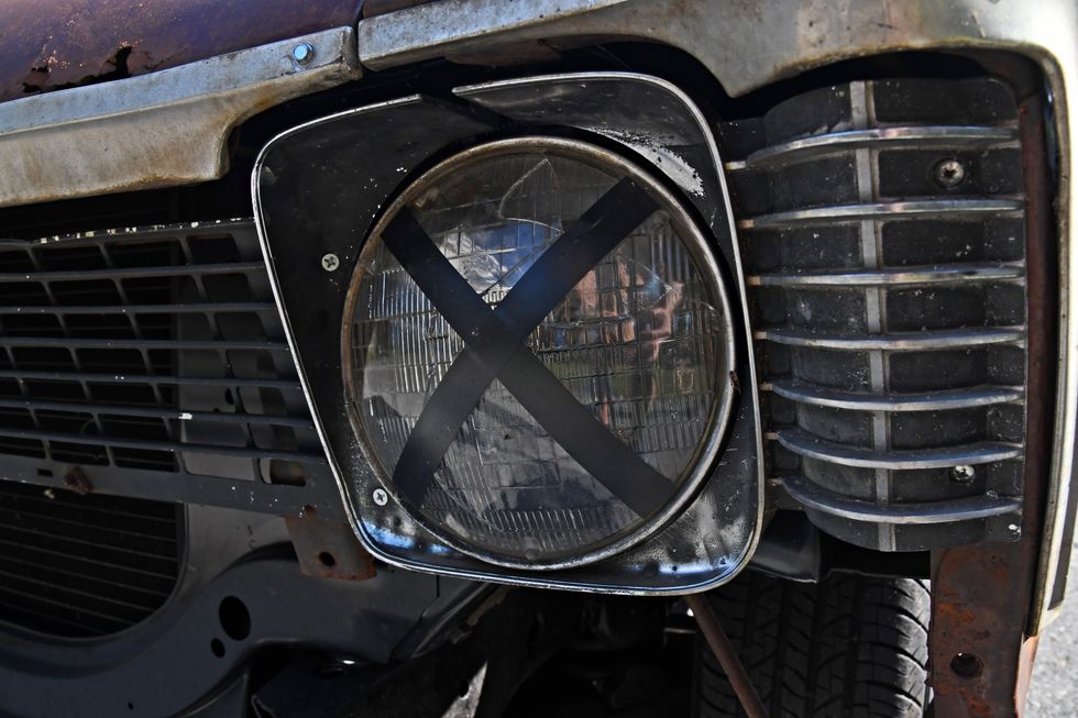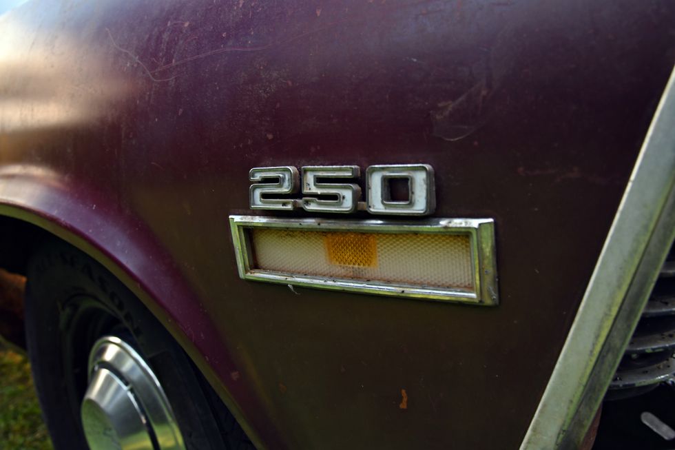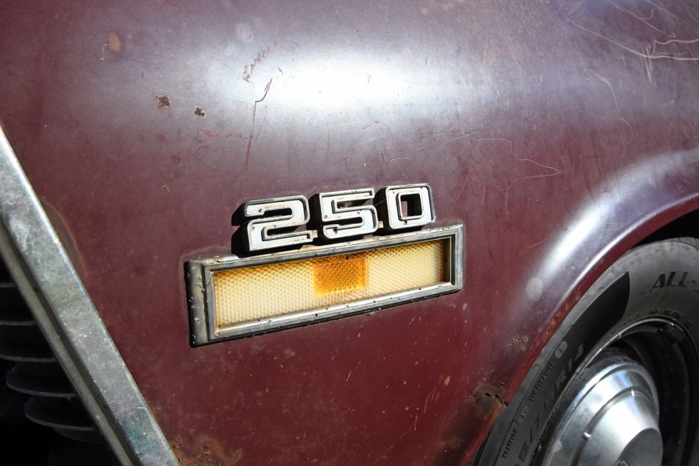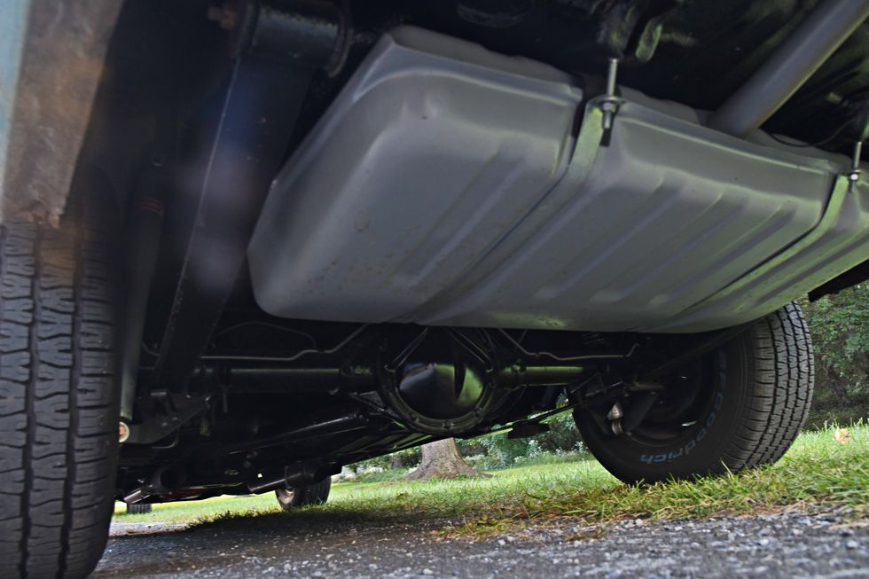 Nothing but bare bones here. Dan sourced some cheap junkyard seats and then “upholstered” them in Mexican blankets he bought off of Amazon. One cool piece here is the original Hurst 442 bench shifter.Photo: Scott Lachenauer