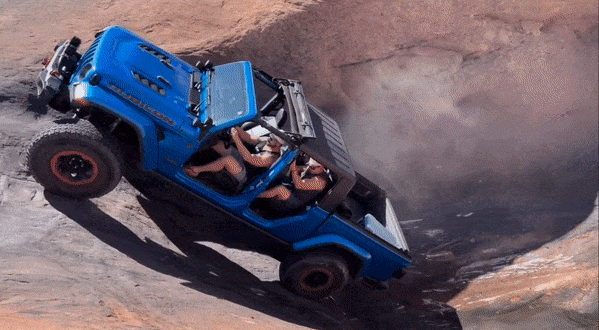As the name implies, Devil’s Hot Tub is a bathtub-shaped rut in the rocky landscape that off-road enthusiasts frequently attempt to drive down into and then throttle out. It’s a test for even the most credentialed off-roader and recently proved to be far too much for a modified Jeep Gladiator Rubicon.
