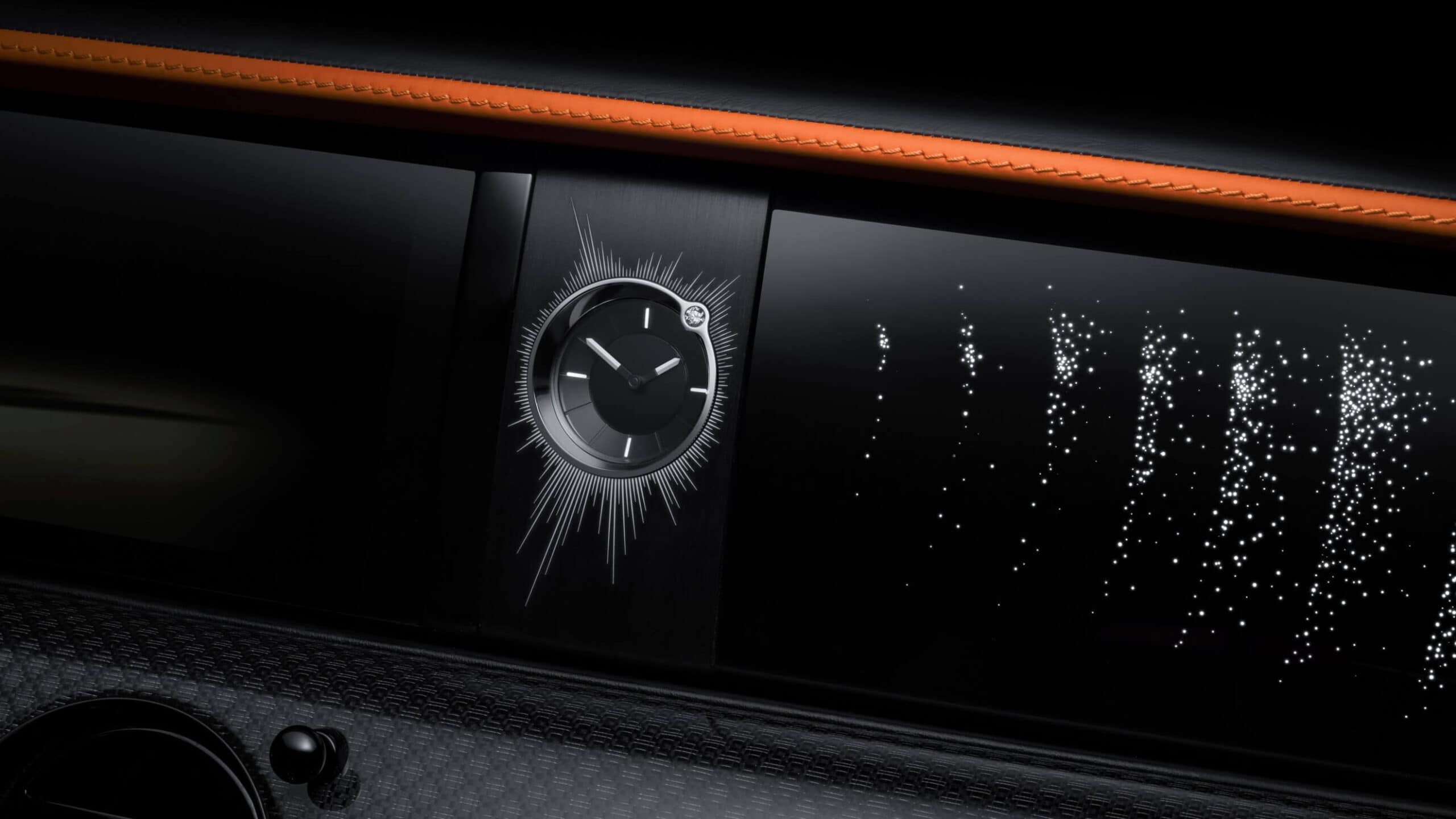 A further laser-etched 1,846 stars adorn the illuminated dashboard on the passenger side. A single Rolls-Royce specialist was tasked to position each and every star during a process that required more than 100 hours. Those Mandarin accents on the outside continue in the lavish cabin where RR has installed two-tone seats with a whopping 200,000+ individual perforations. The finishing touch is a bespoke watch featuring a 0.5-carat diamond with a design that was finalized after 14 attempts.