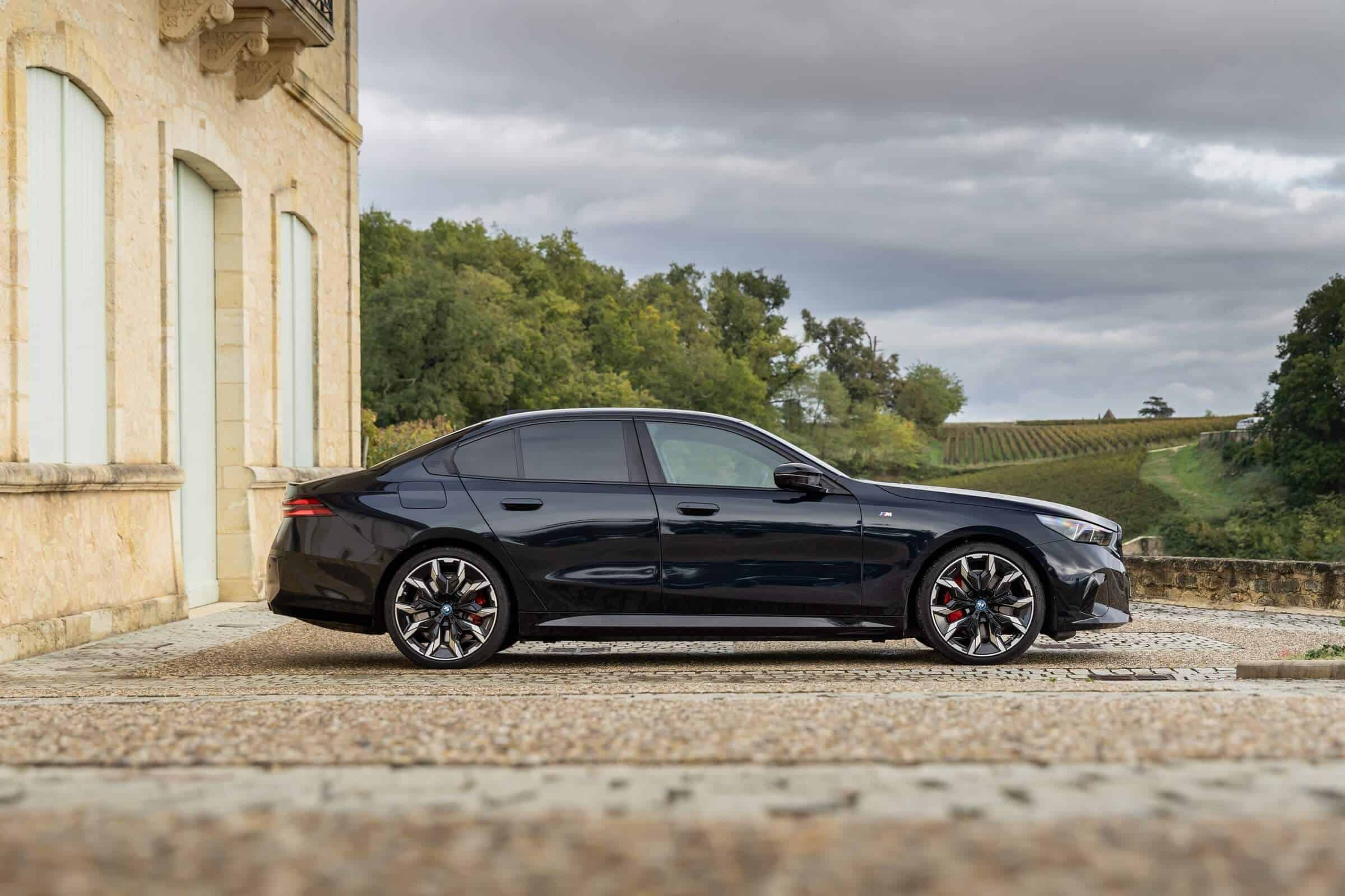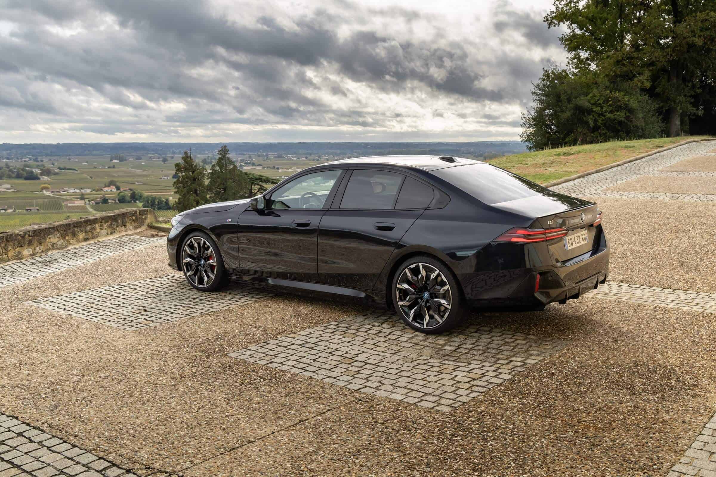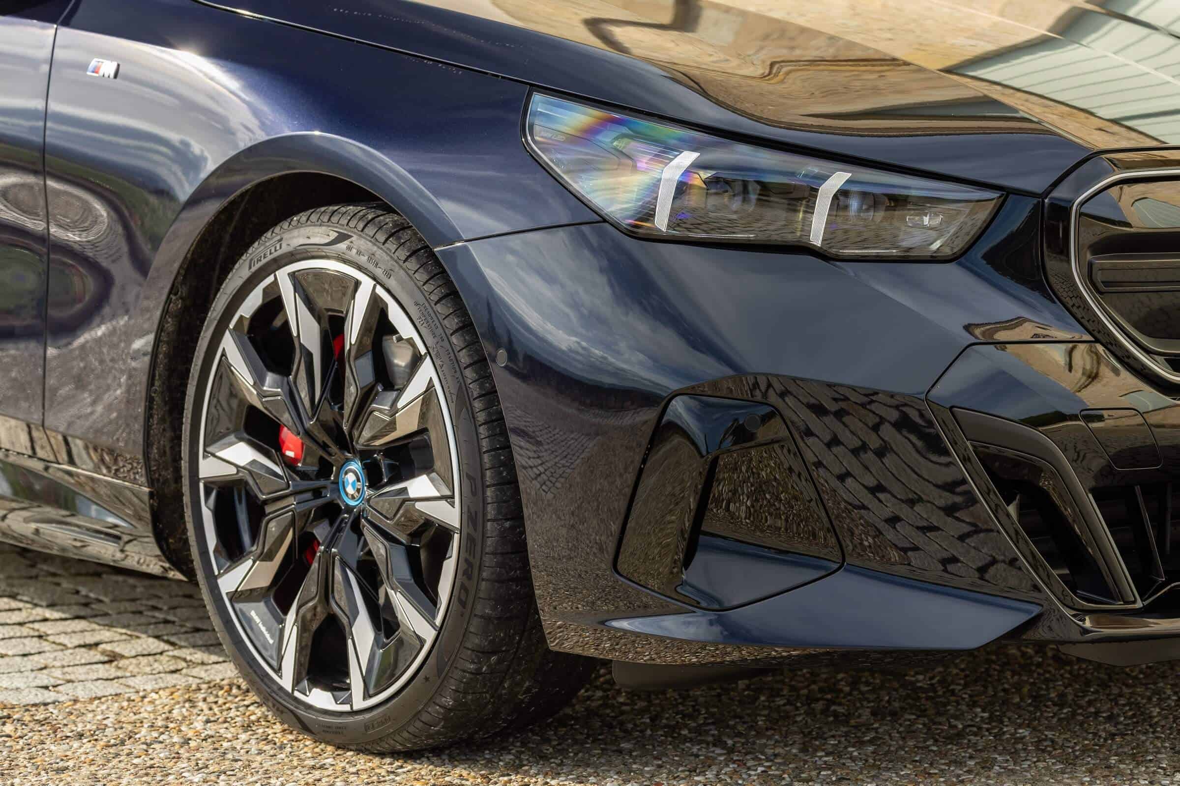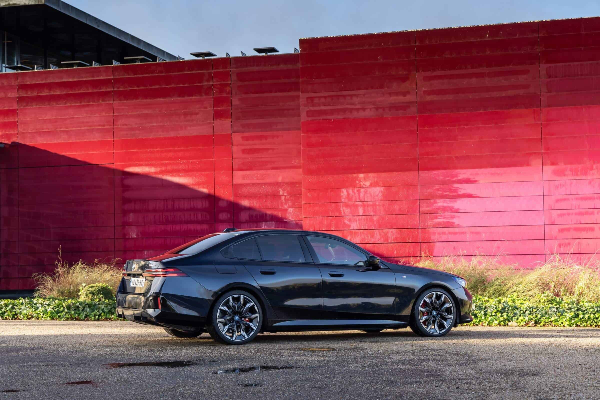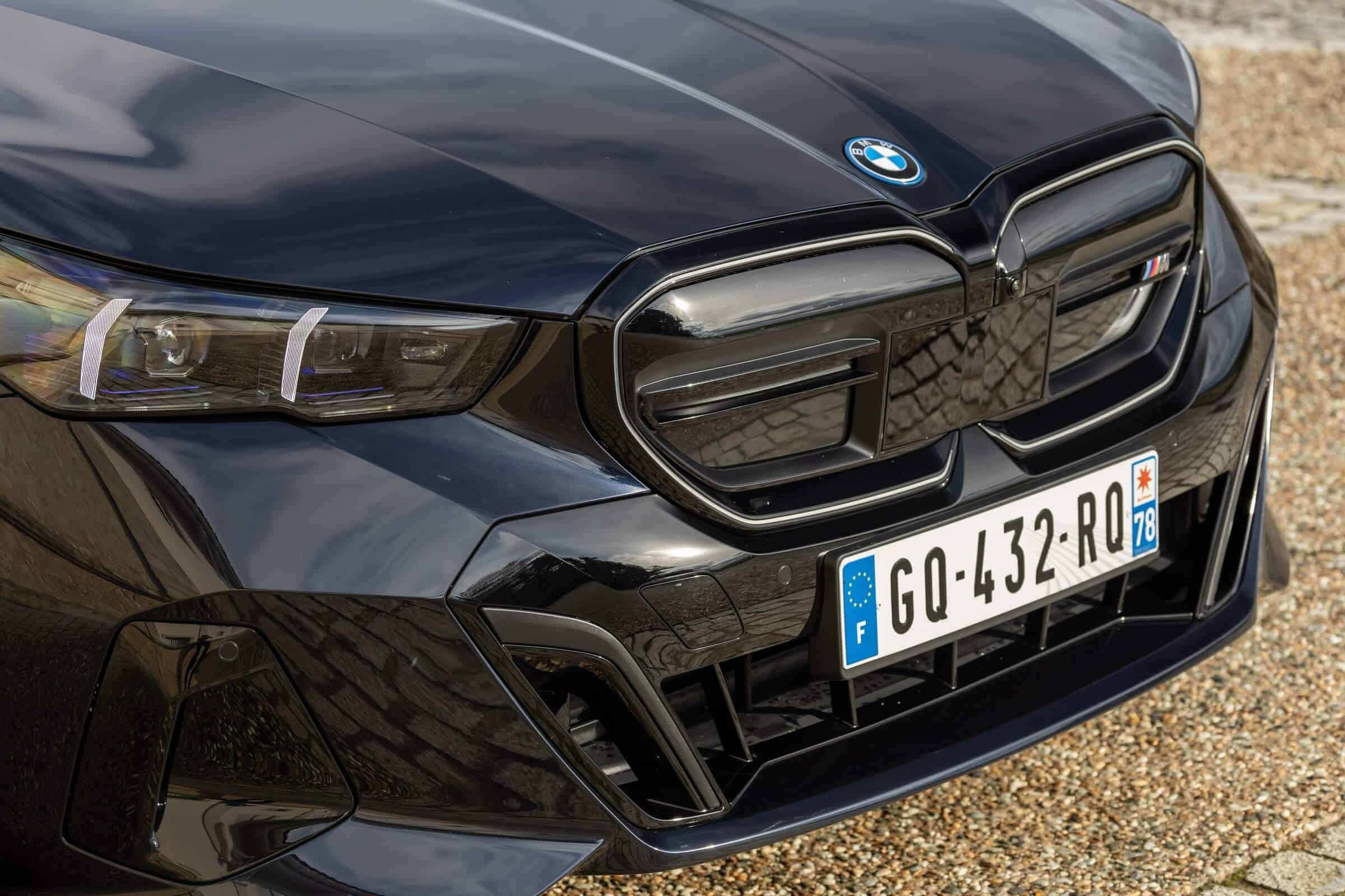 We’re being given the opportunity to see the electric M Performance variant from just about every angle with an M Carbon Black paint. The color looks a bit blue from some angles, depending on how the light hits the body, making it harder to distinguish it from Individual Tanzanite Blue. The latter is a lot more expensive though as BMW France is charging €2,500 whereas M Carbon Black can be had for less than half, at €1,200. This car also happens to have 21-inch wheels – the largest set ever offered from the factory on a 5er.