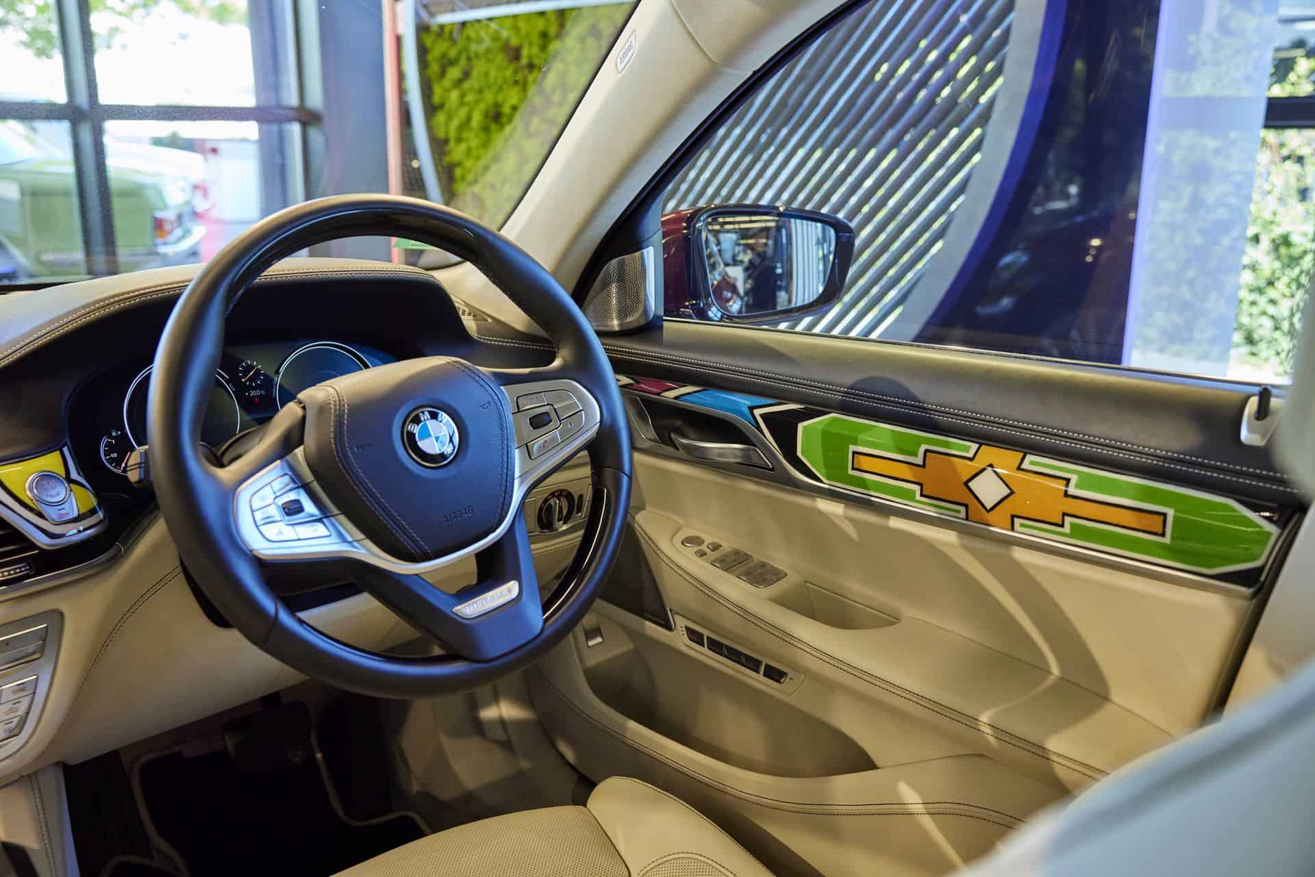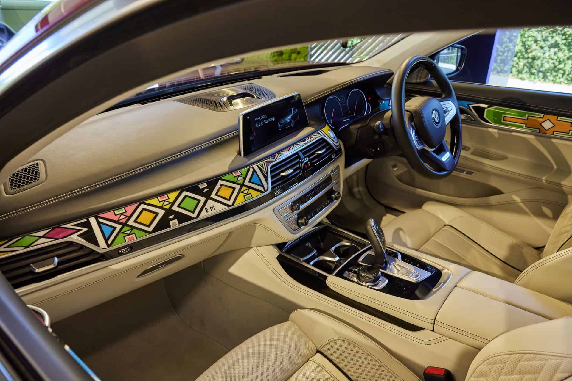 In a collaborative effort with the BMW Individual Manufaktur, Mahlangu has turned this luxury sedan into a dynamic masterpiece by adorning the real wood interior trims with her characteristic motifs. The folks at BMW Individual developed a special white-colored fine-wood trim, which Esther Mahlangu then painted with her unique images. These works of art were sealed to ensure their longevity before being skillfully integrated into the vehicle.
