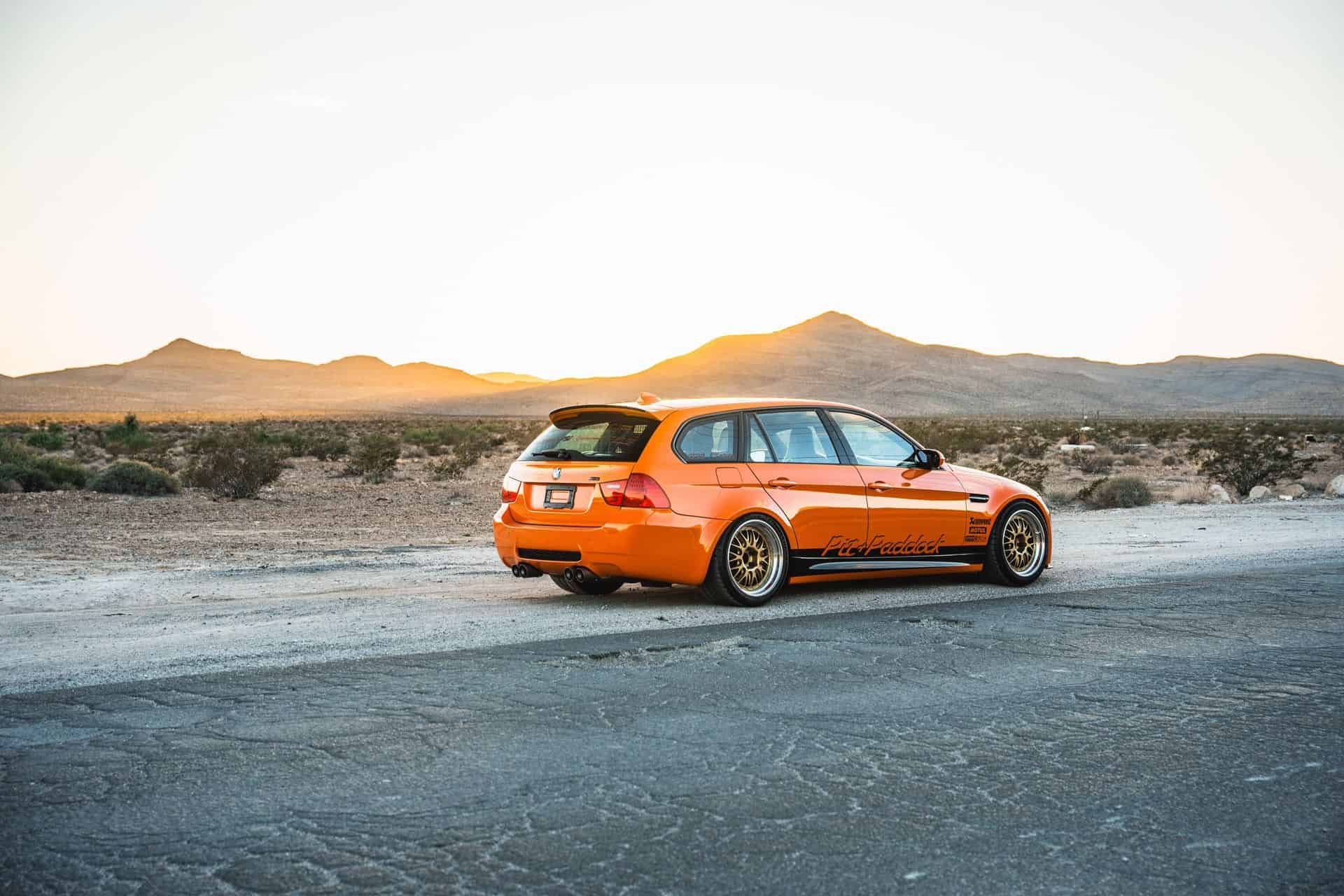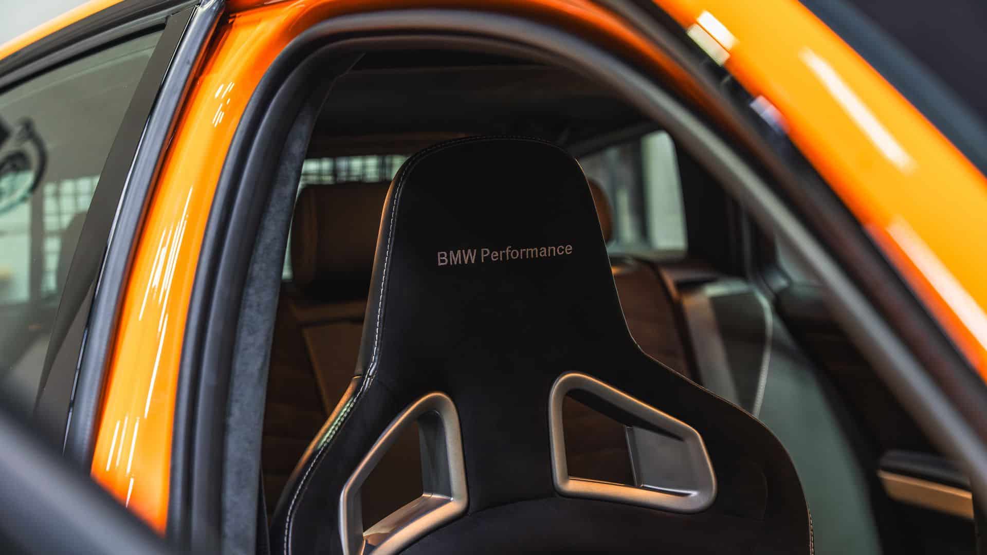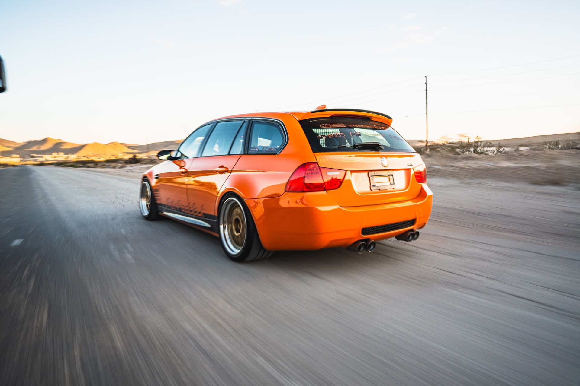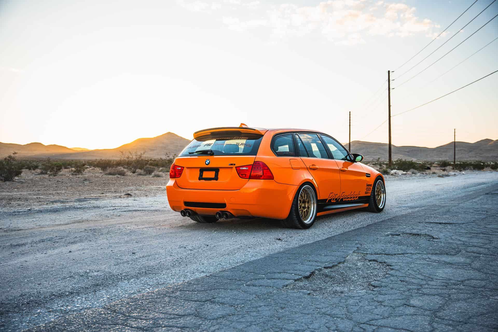 Exterior enhancements include 3D Design roof spoiler, Alpha N carbon fiber front lip, and BBS three-piece E88 wheels with Michelin Pilot Sport Cup 2 tires. Future Classic M12x1.5 wheel studs are added for strength and quick wheel changes. The bodywork involves meticulous adjustments to fit M3 components, such as widening the rear quarters and combining the M3 and wagon bumpers. The car is painted in Fire Orange, reminiscent of the M3 GTS. The interior receives a makeover with rare lightweight M Performance seats, Alcantara trim, and an Alcantara-wrapped steering wheel.