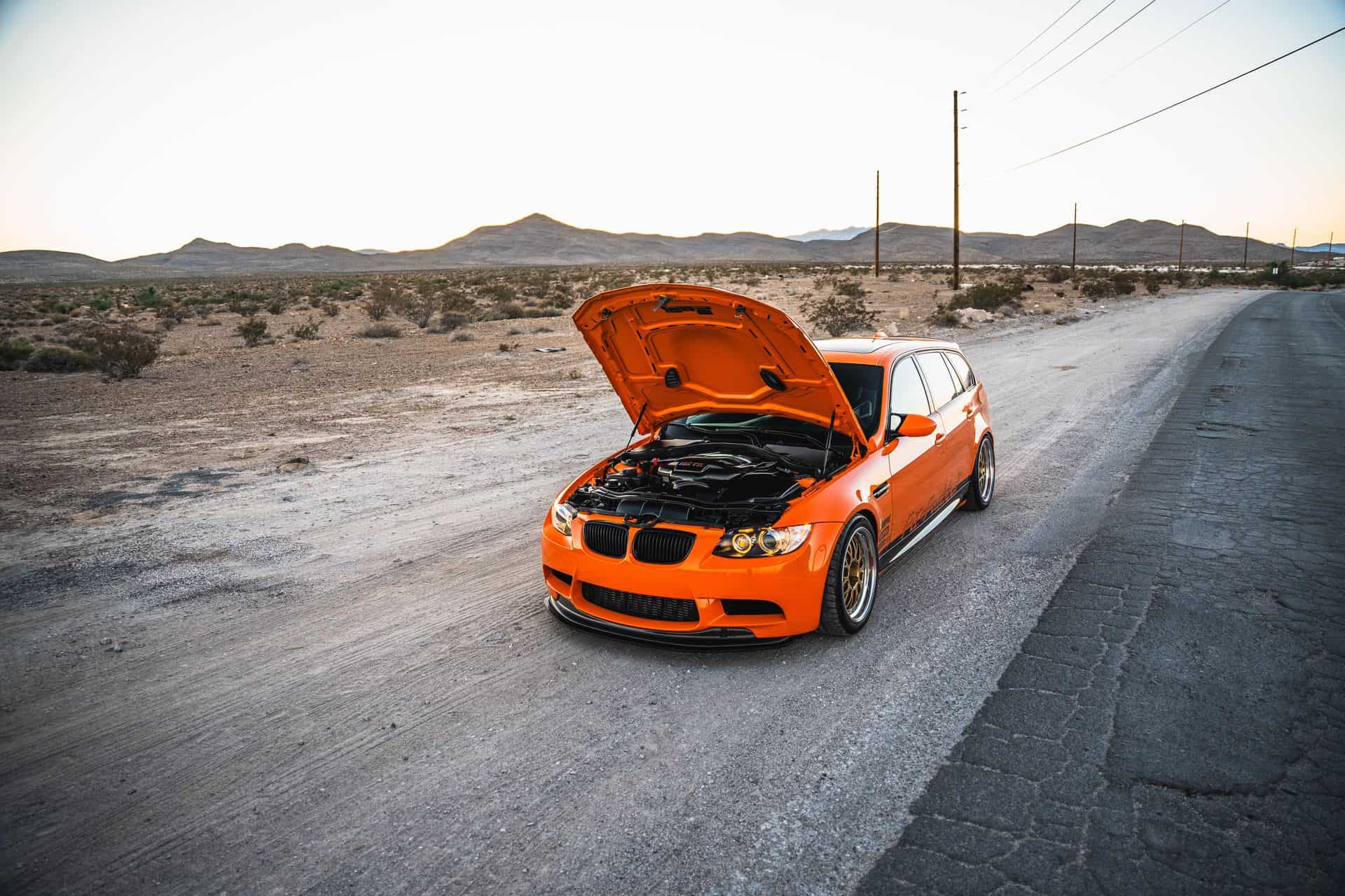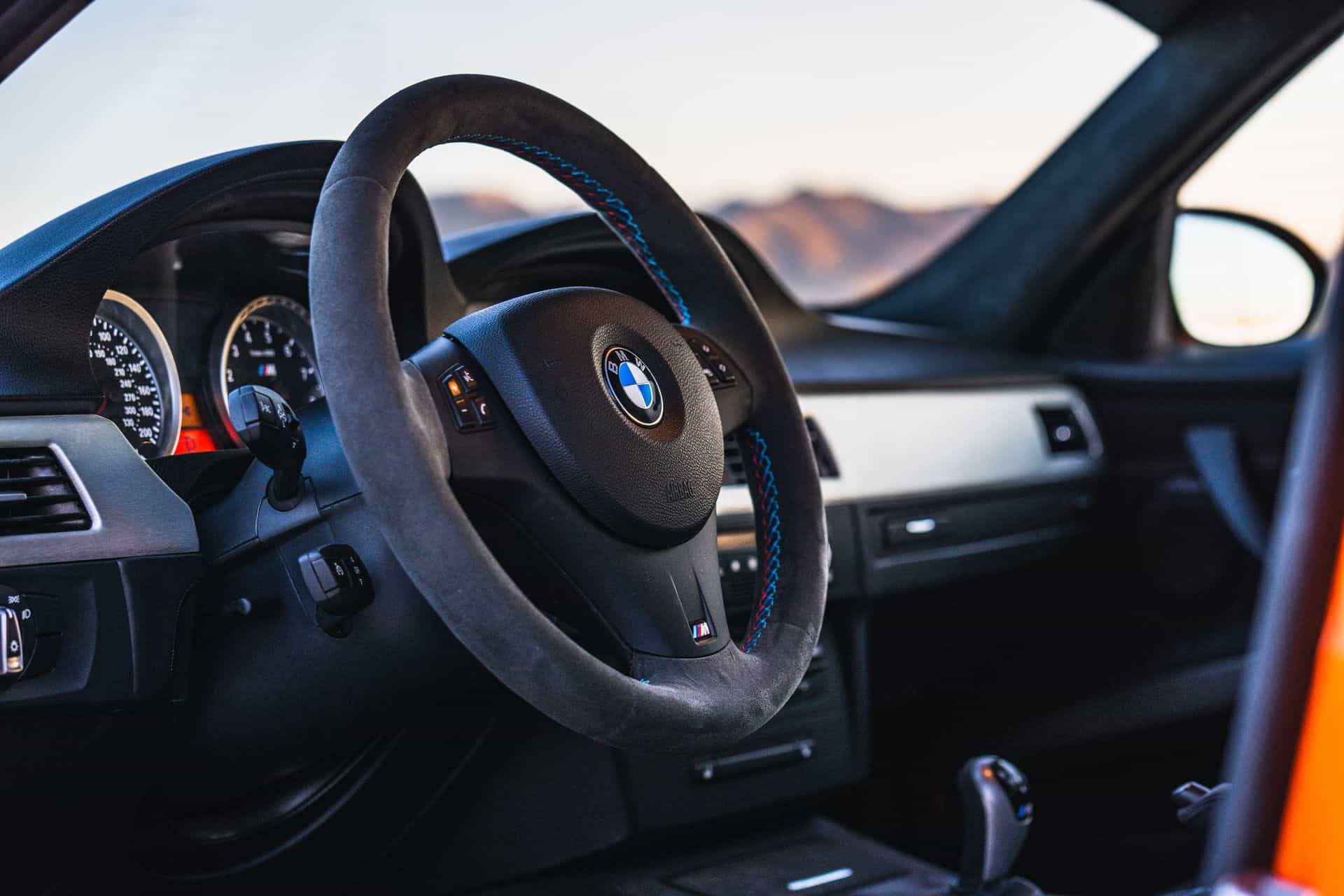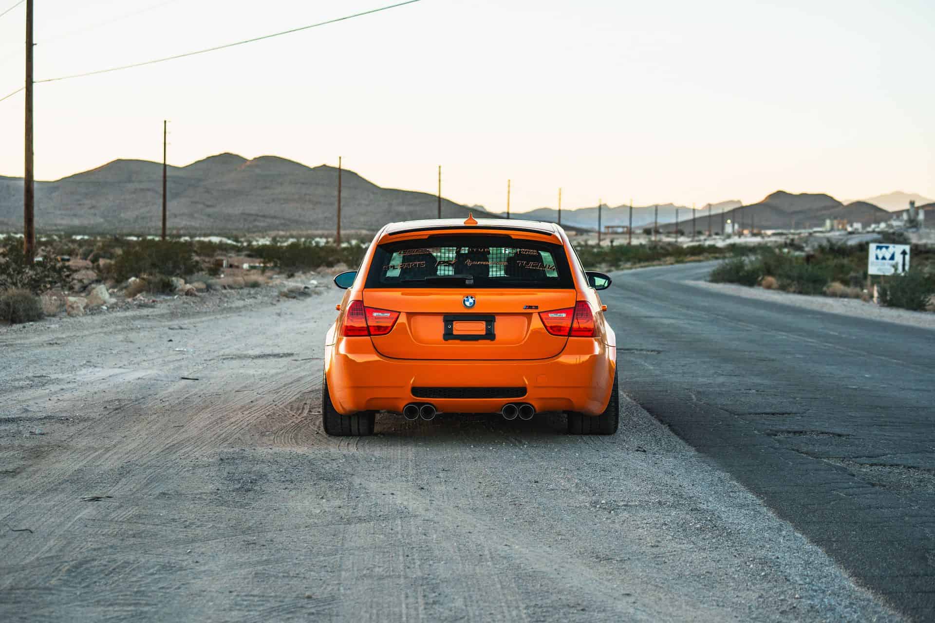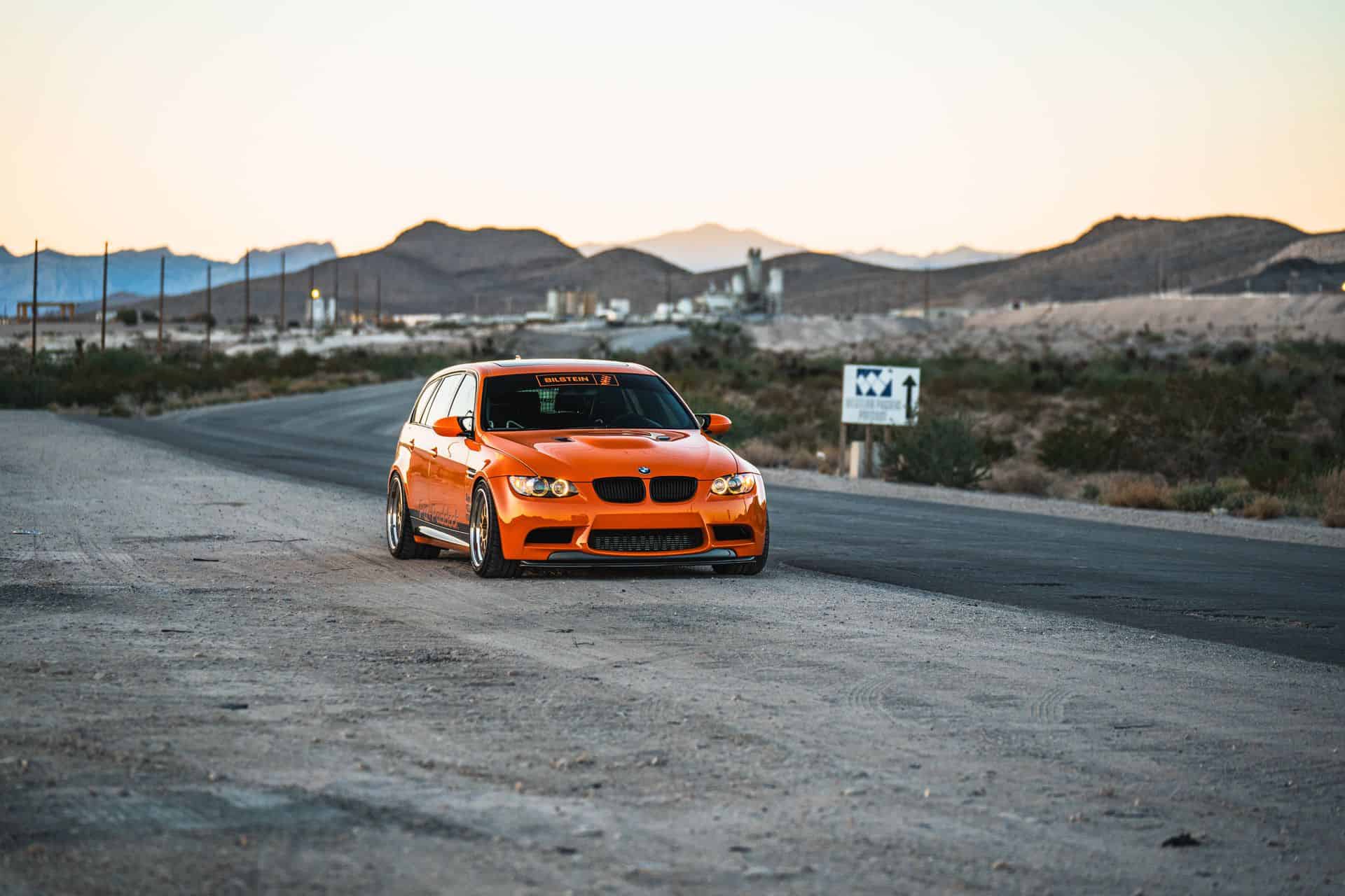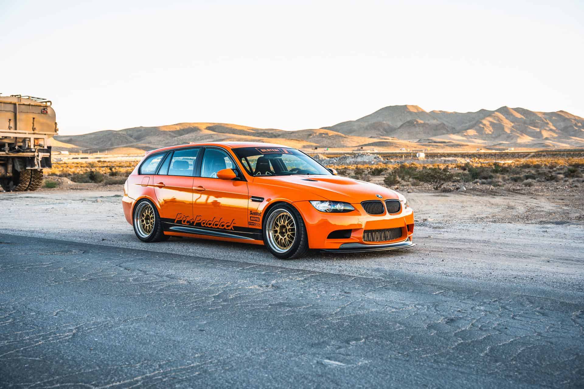 Exterior enhancements include 3D Design roof spoiler, Alpha N carbon fiber front lip, and BBS three-piece E88 wheels with Michelin Pilot Sport Cup 2 tires. Future Classic M12x1.5 wheel studs are added for strength and quick wheel changes. The bodywork involves meticulous adjustments to fit M3 components, such as widening the rear quarters and combining the M3 and wagon bumpers. The car is painted in Fire Orange, reminiscent of the M3 GTS. The interior receives a makeover with rare lightweight M Performance seats, Alcantara trim, and an Alcantara-wrapped steering wheel.