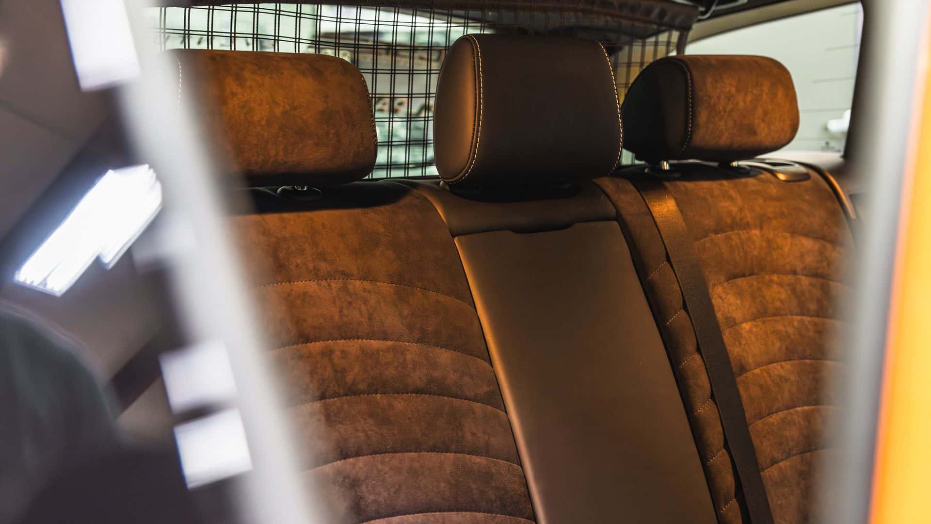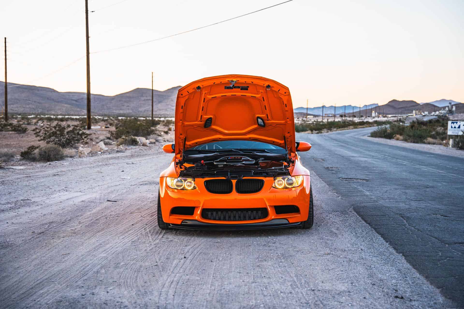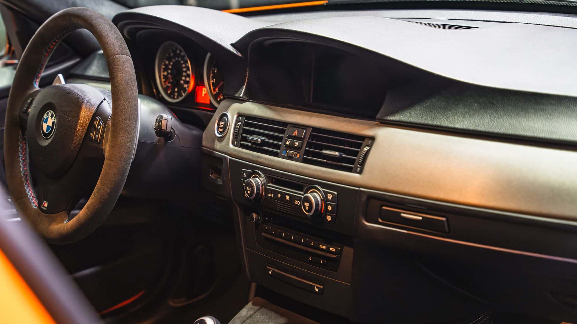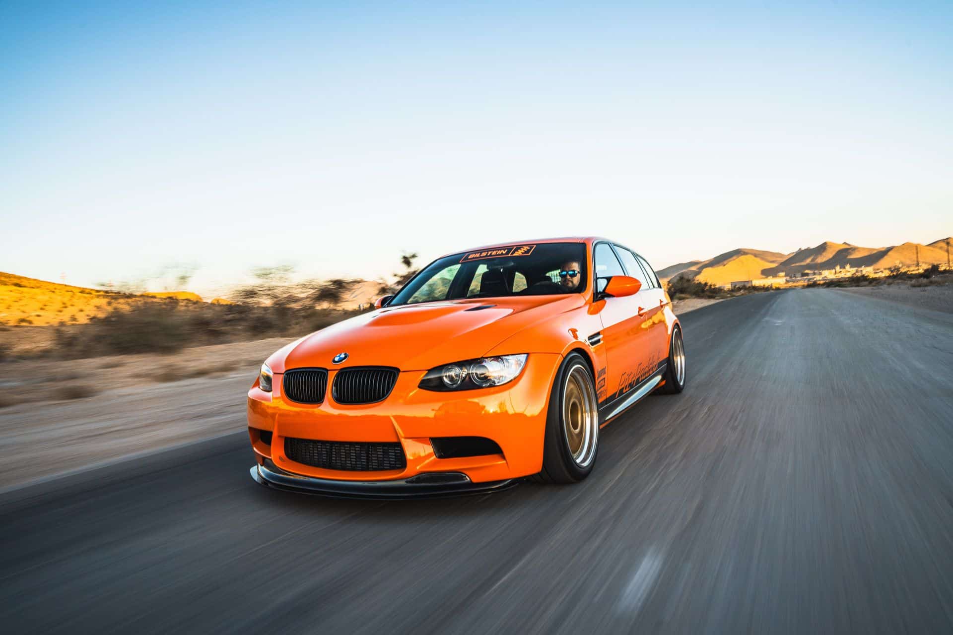 Exterior enhancements include 3D Design roof spoiler, Alpha N carbon fiber front lip, and BBS three-piece E88 wheels with Michelin Pilot Sport Cup 2 tires. Future Classic M12x1.5 wheel studs are added for strength and quick wheel changes. The bodywork involves meticulous adjustments to fit M3 components, such as widening the rear quarters and combining the M3 and wagon bumpers. The car is painted in Fire Orange, reminiscent of the M3 GTS. The interior receives a makeover with rare lightweight M Performance seats, Alcantara trim, and an Alcantara-wrapped steering wheel.