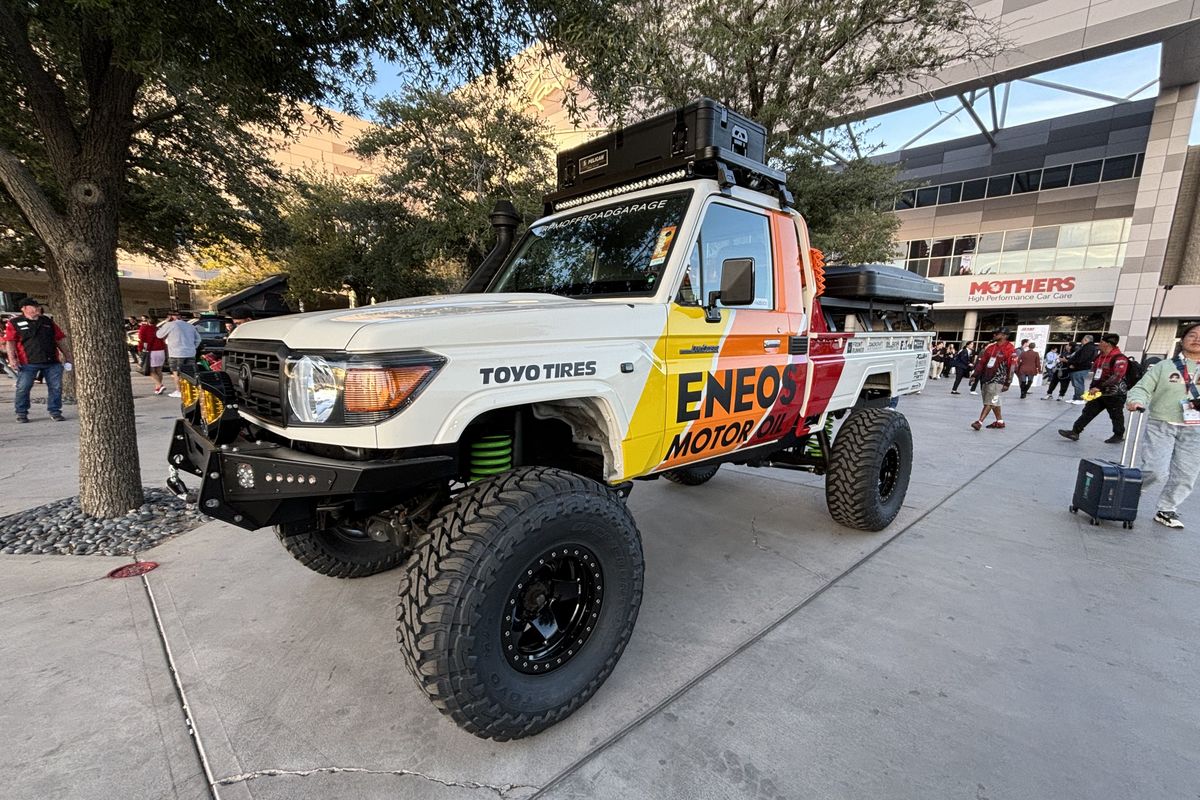 The pickup is powered by a Toyota 1FZ-FE 4.5-liter DOHC 24-valve inline-six engine, lubricated with ENEOS 5W-40 motor oil and paired with a four-speed automatic transmission. Double carbon fiber front and rear driveshafts from Driveshaft Pro deliver the power to the front and rear axles. On-demand traction is provided by front and rear Eaton Performance electronic locking differentials, which when activated, engages all four 17 by 9-inch HDR forged beadlock wheels wrapped with 37×13.50 R17 Toyo Open Country M/T tires.