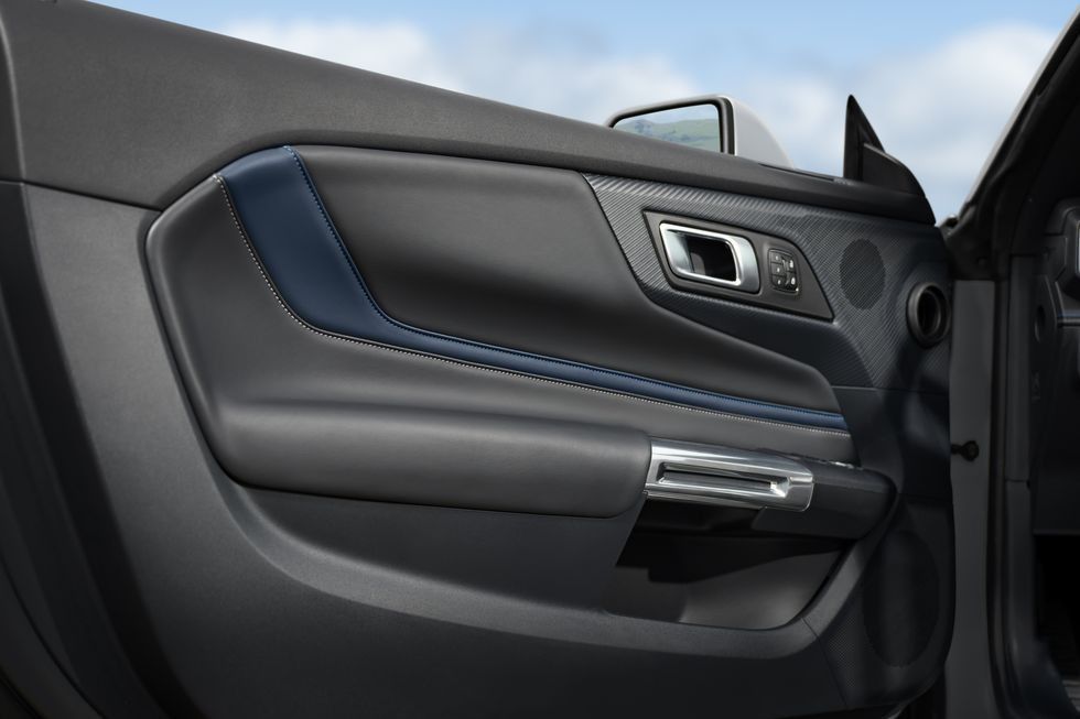 The history of the California Special Mustang continues: It remains as an appearance package available only on the Mustang GT. The 2024 Mustang GT/CS, available as a coupe or convertible, includes a choice of two 19-inch wheel styles, one being a more subtle grey color and the other highlighted with Rave Blue. Blue and black striping down each door and rear fender gives the appearance of speed. The blue accents also adorn the grille “nostril” intake surrounds and the GT/CS badging throughout.
