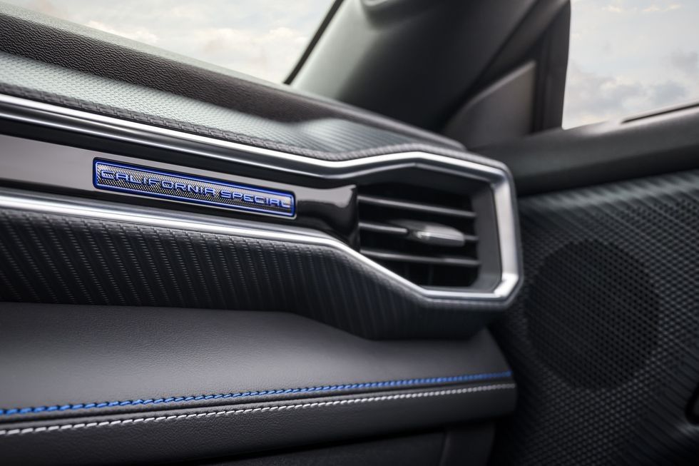 Inside, the interior features blue accent stitching on the seats and dashboard and Rave Blue “California Special” lettering on the dashboard. Other interior gadgets and appearance attributes depend on what options are selected for the GT.