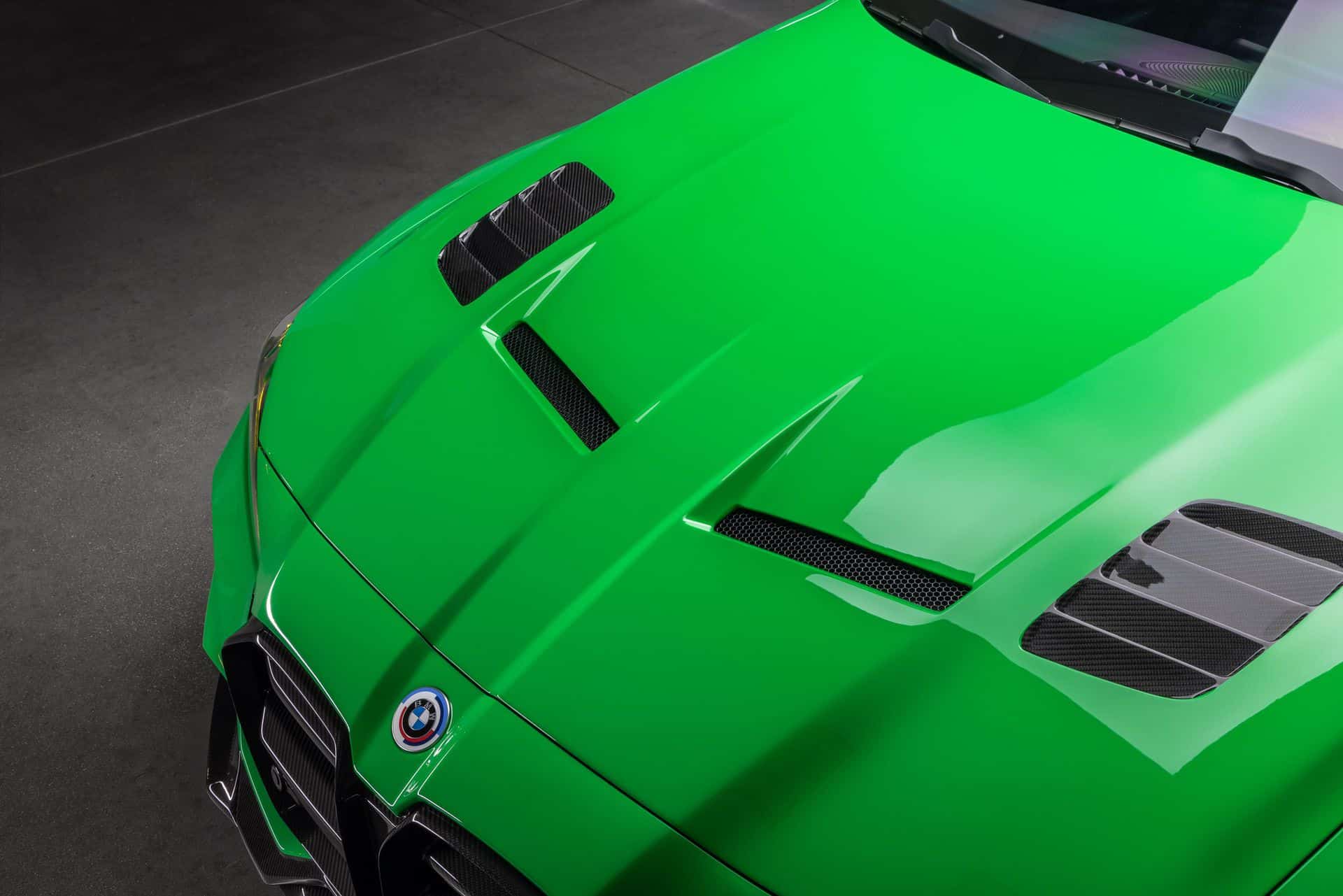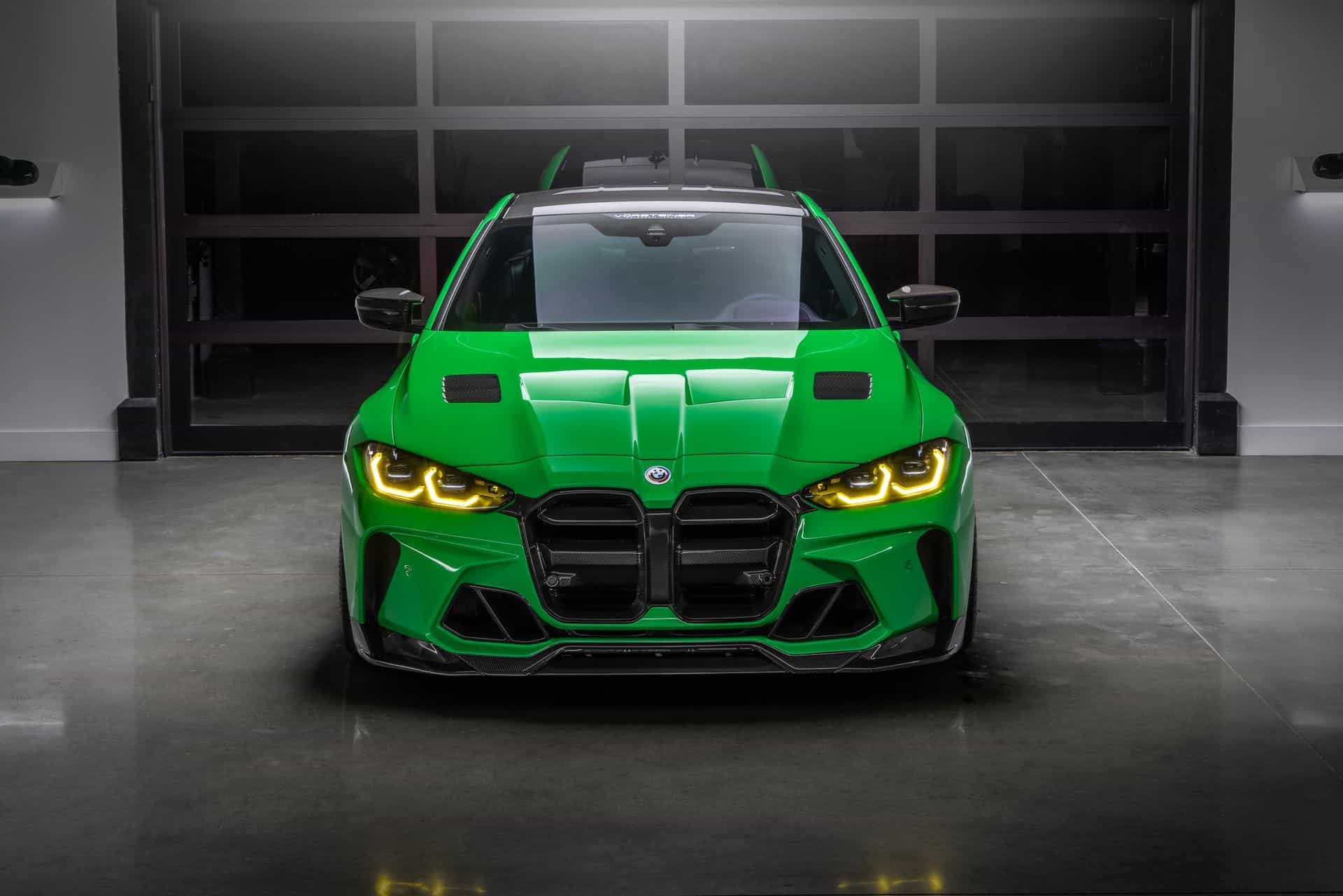 A new photoshoot puts the spotlight on the M4 with the full body kit, including a vented hood and a massive rear wing. These custom pieces are made from carbon fiber to keep weight low and add visual drama to an already aggressive design. Vorsteiner has also come up with a new look for the controversial grille by giving the kidneys a pair of thick horizontal bars. It’s flanked by modified headlights with yellow daytime running lights to echo the M4 CSL and 3.0 CSL we mentioned earlier.