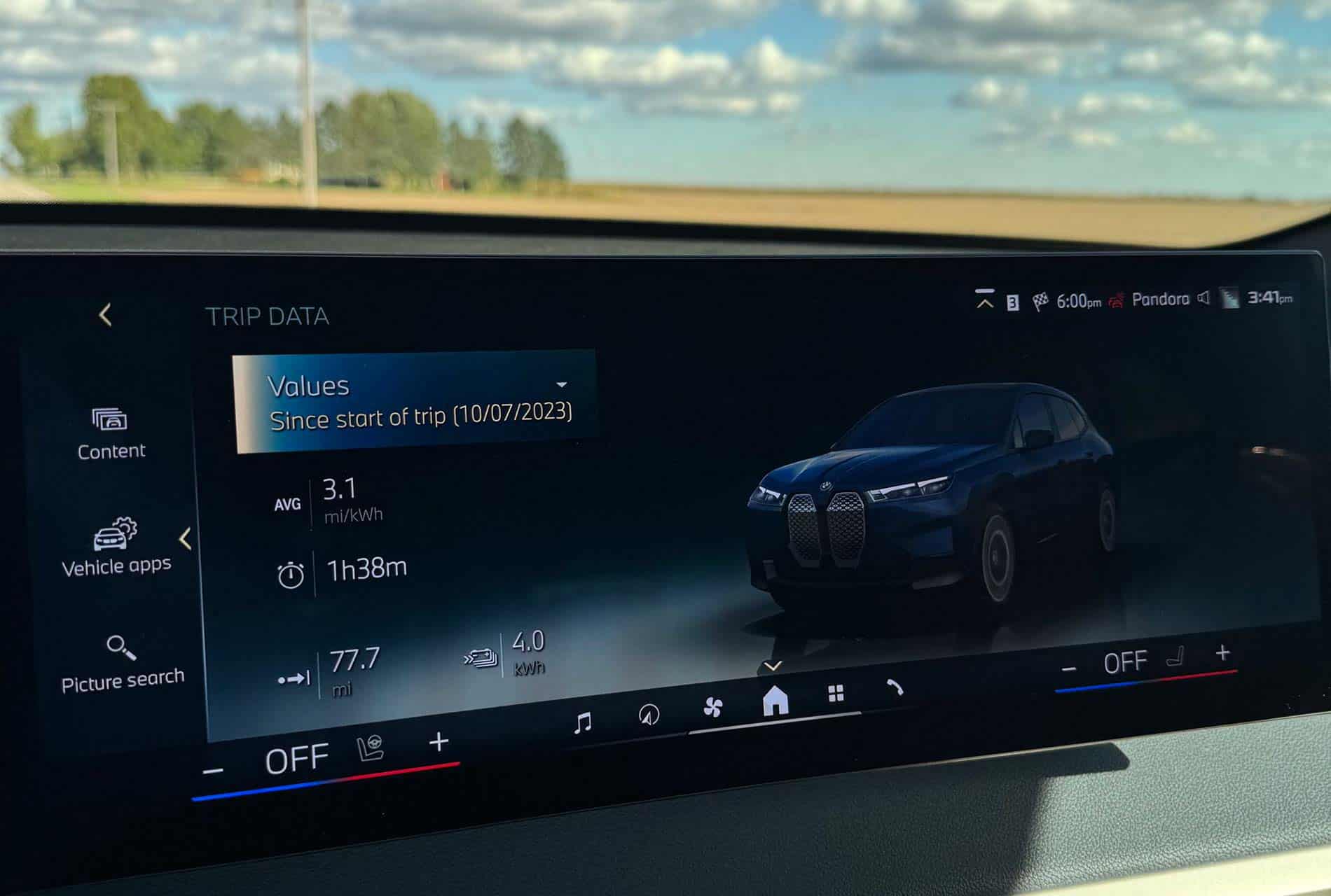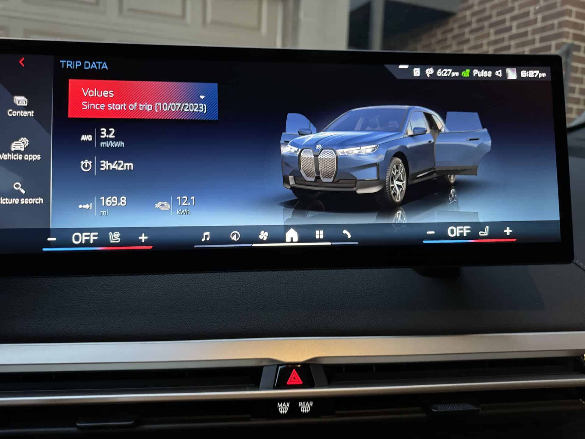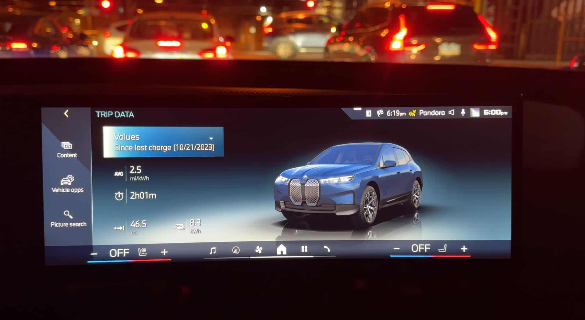 In city driving, we observed an average energy consumption of 2.5 kWh per mile, with mostly stop-and-go traffic. Chicago is quite famous for that. This relatively high figure can be attributed to the iX M60’s weight and the energy demands of stop-and-go driving, despite trying to maximize the brake regen by using as much as possible the B Mode (one-pedal driving). Adopting a conscious driving approach, we used the Efficient Mode for half the time, alternated between adaptive D and B modes, and minimized air conditioning usage unless necessary. While Efficient Mode limits the performance of the climate control system, we found it essential to maintain cabin comfort, especially during warmer months.