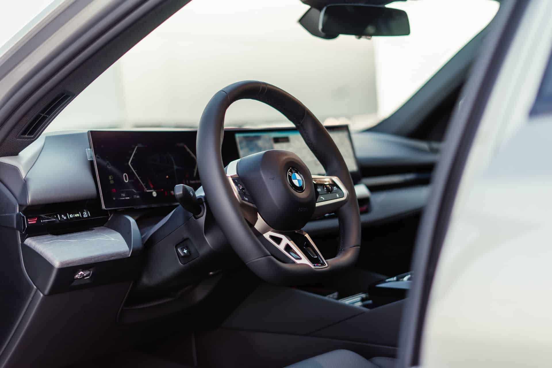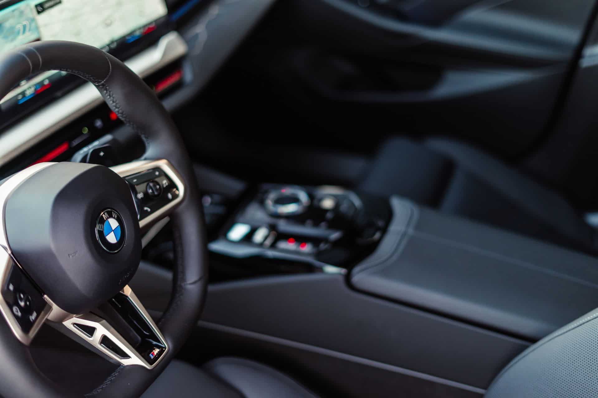 Seen here is the 2024 BMW 520d xDrive, adorned with the M Sport package and massive 21-inch BMW Individual aerodynamic wheels 954 in Jet Black. The exterior radiates sophistication, with the Oxide Grey seamlessly complementing the M Sport Package and the imposing wheels. The kidney’s edges, painted in satin aluminum, adds a classic touch to the new 5 Series business sedan.