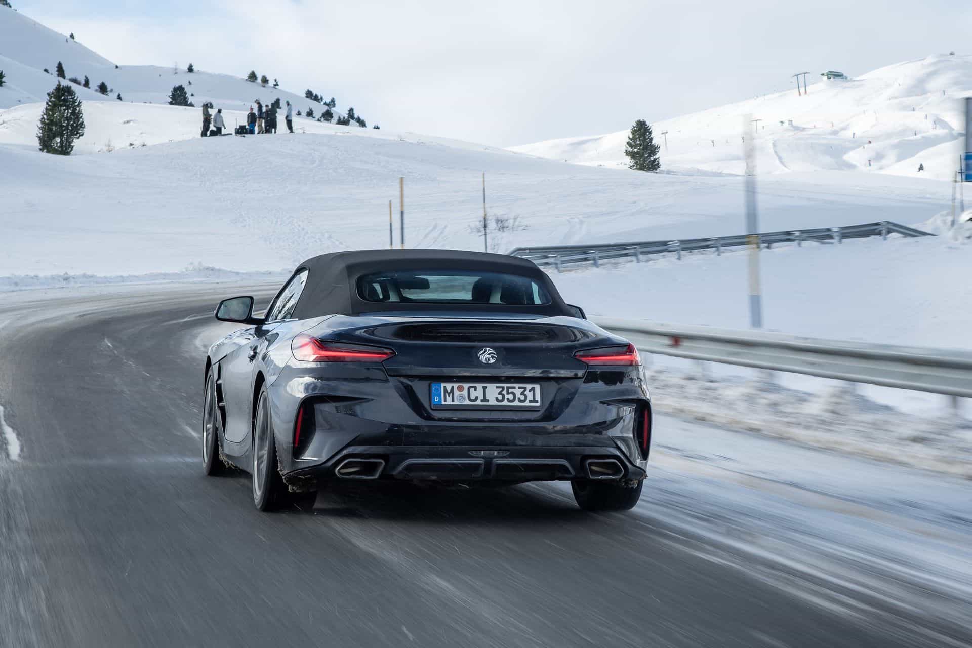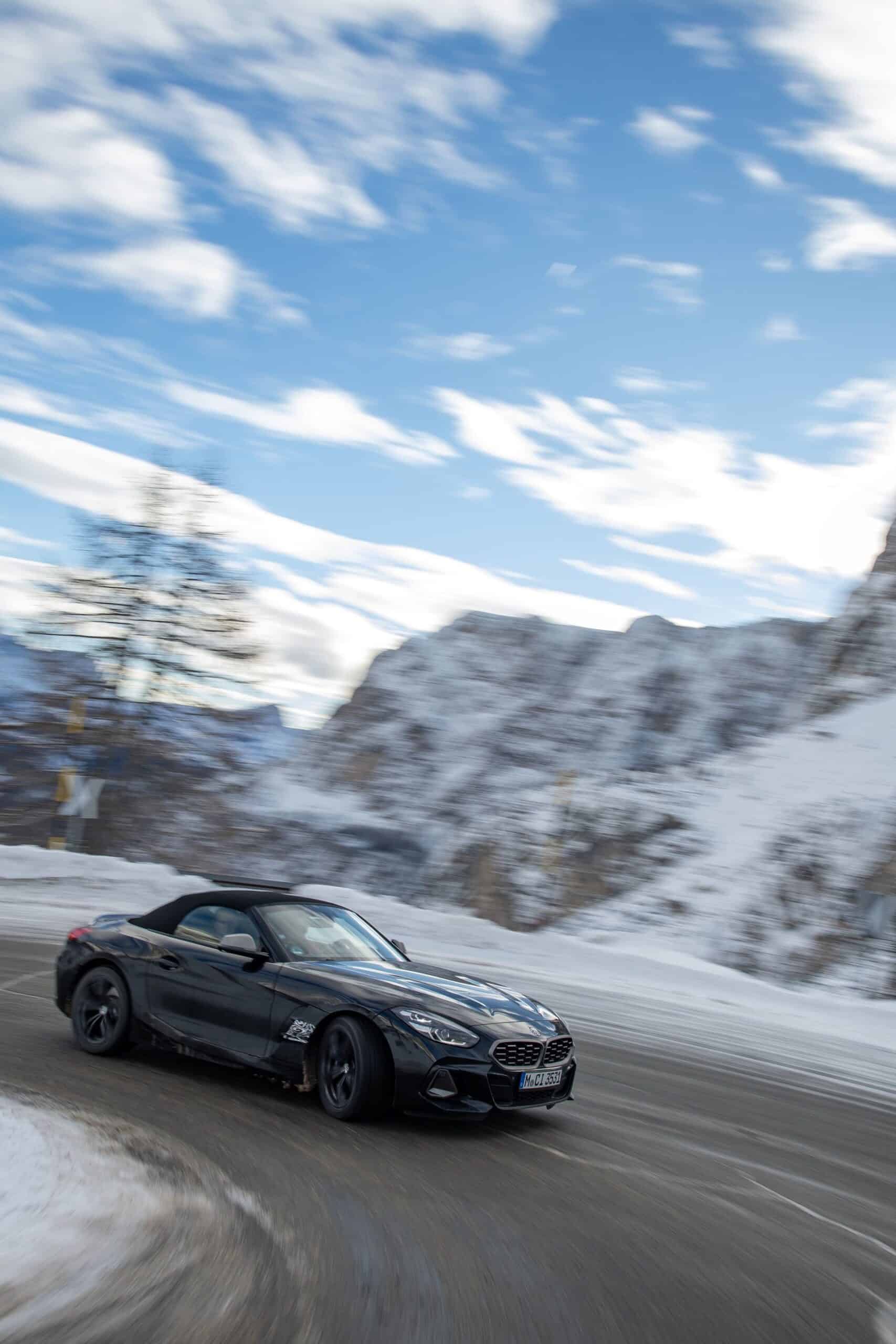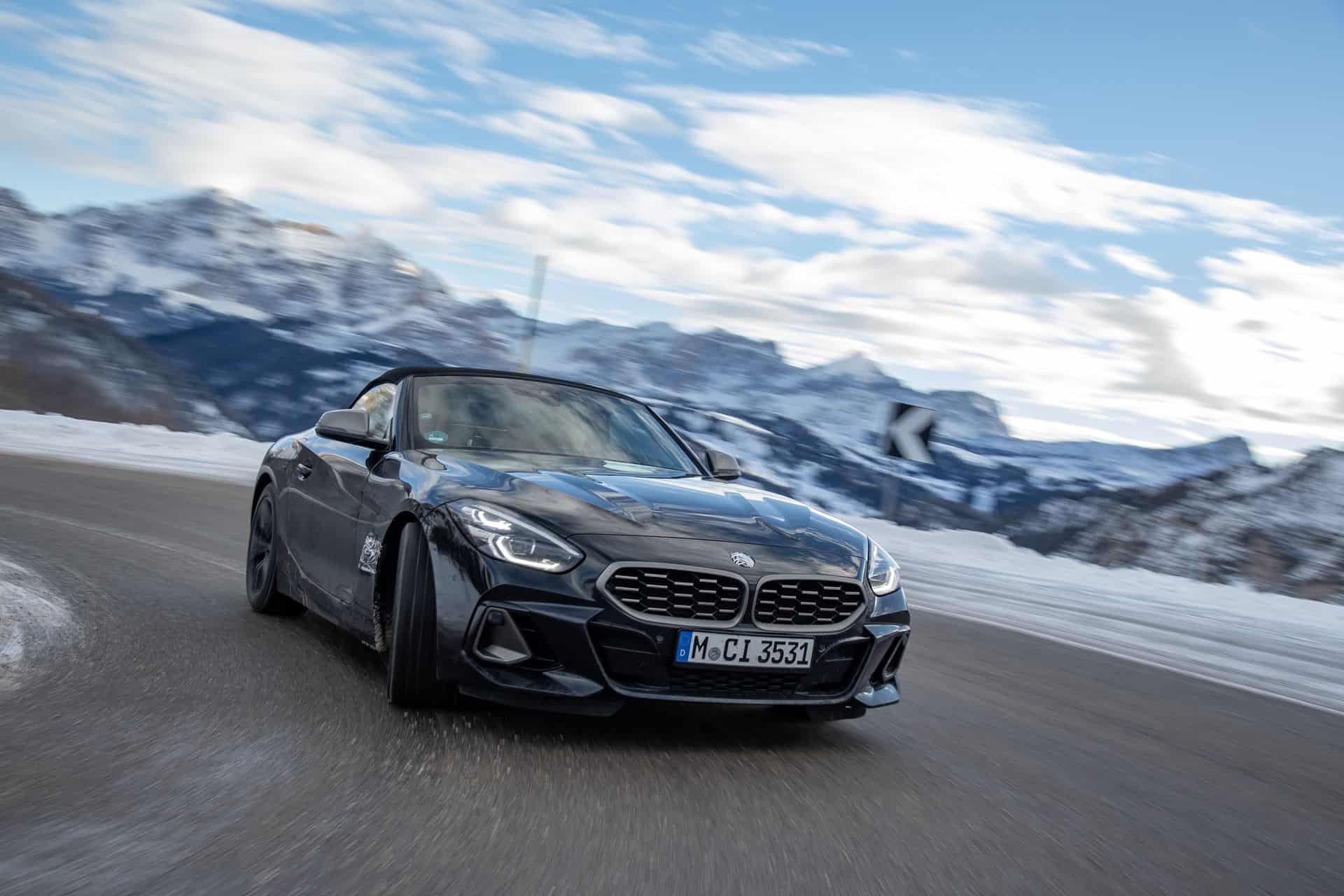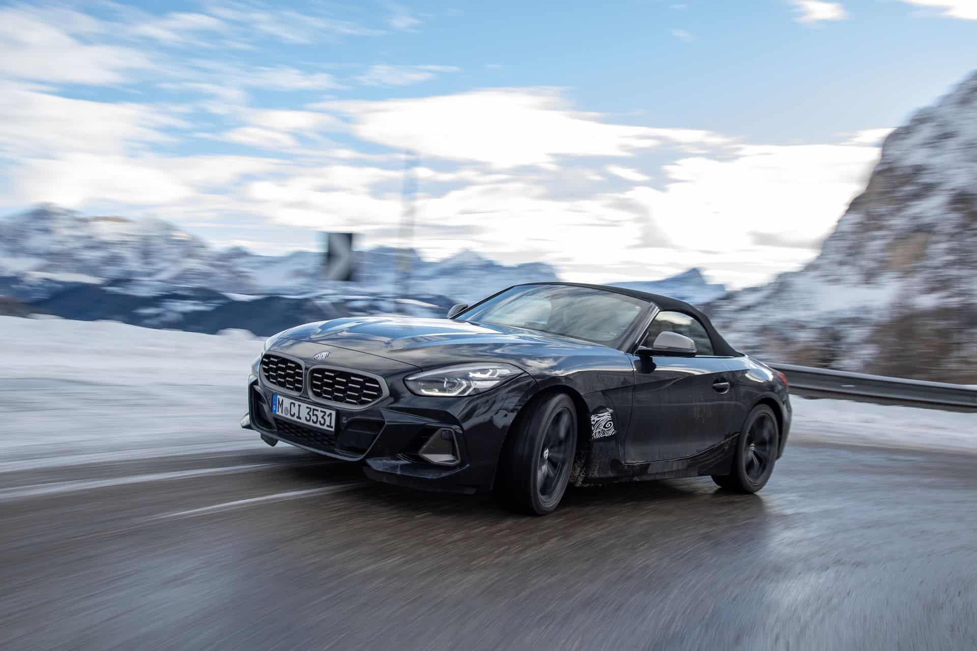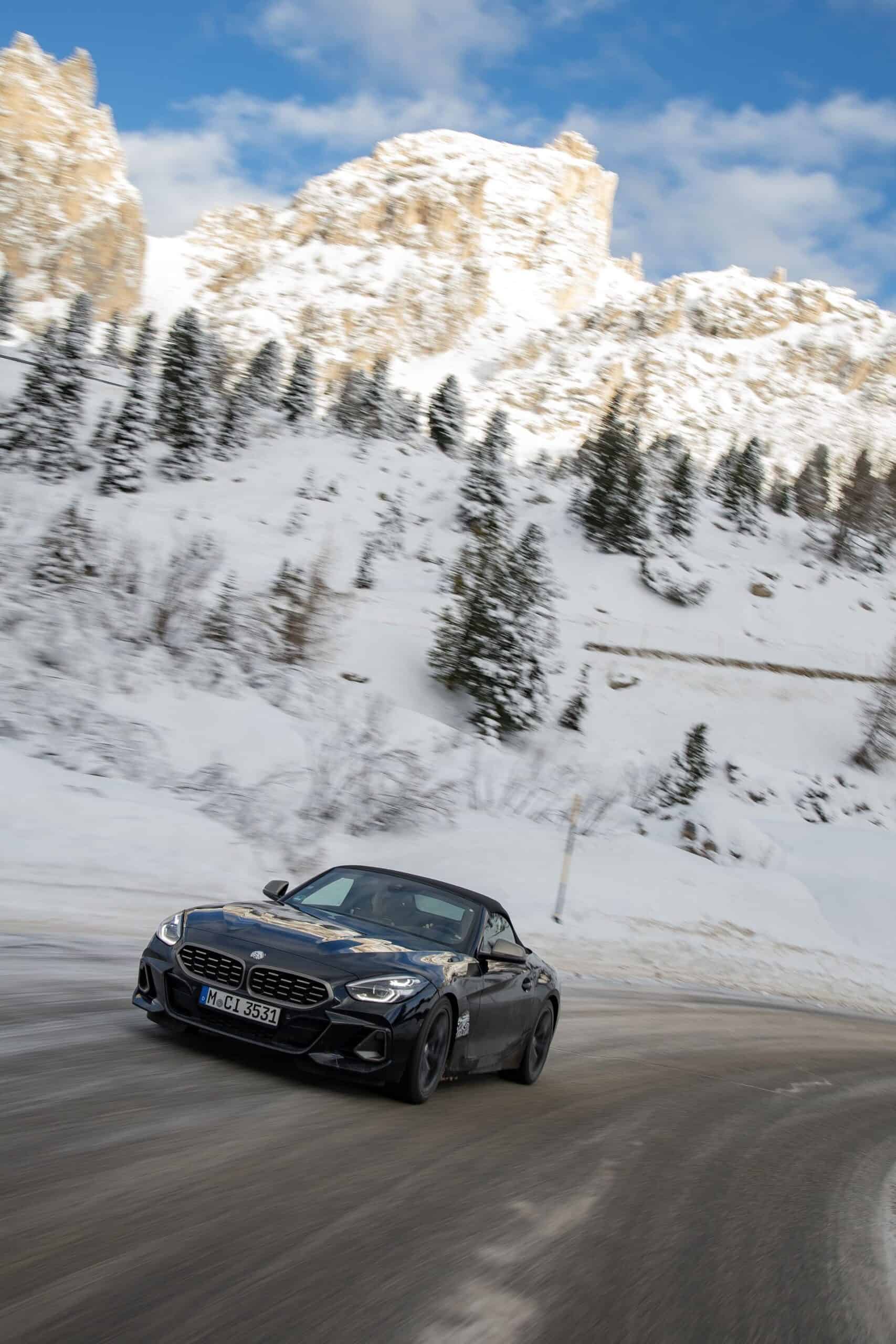 Seen here is a Euro version of the “analog” Z4 M40i with a German license plate while testing in the Dolomite Mountains. The six-speed ZF manual adapted by BMW will be available in Germany, but other markets have yet to be announced. While the US-spec prototype we saw a few days ago was painted in matte Frozen San Remo Green, this one keeps it simple with a Sapphire Black color. It does away with the orange side markers mandatory in North America and has a different set of wheels with winter tires.