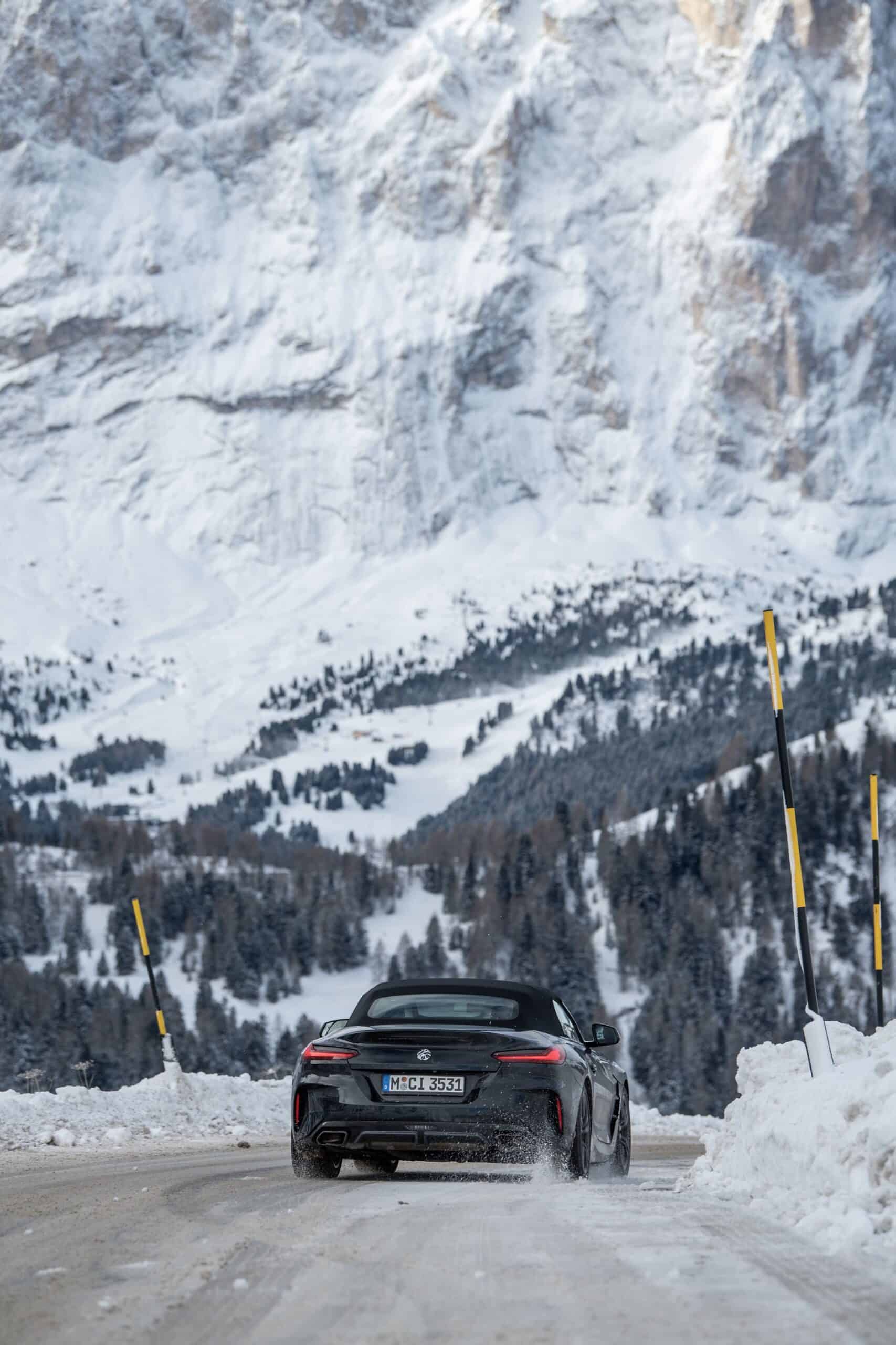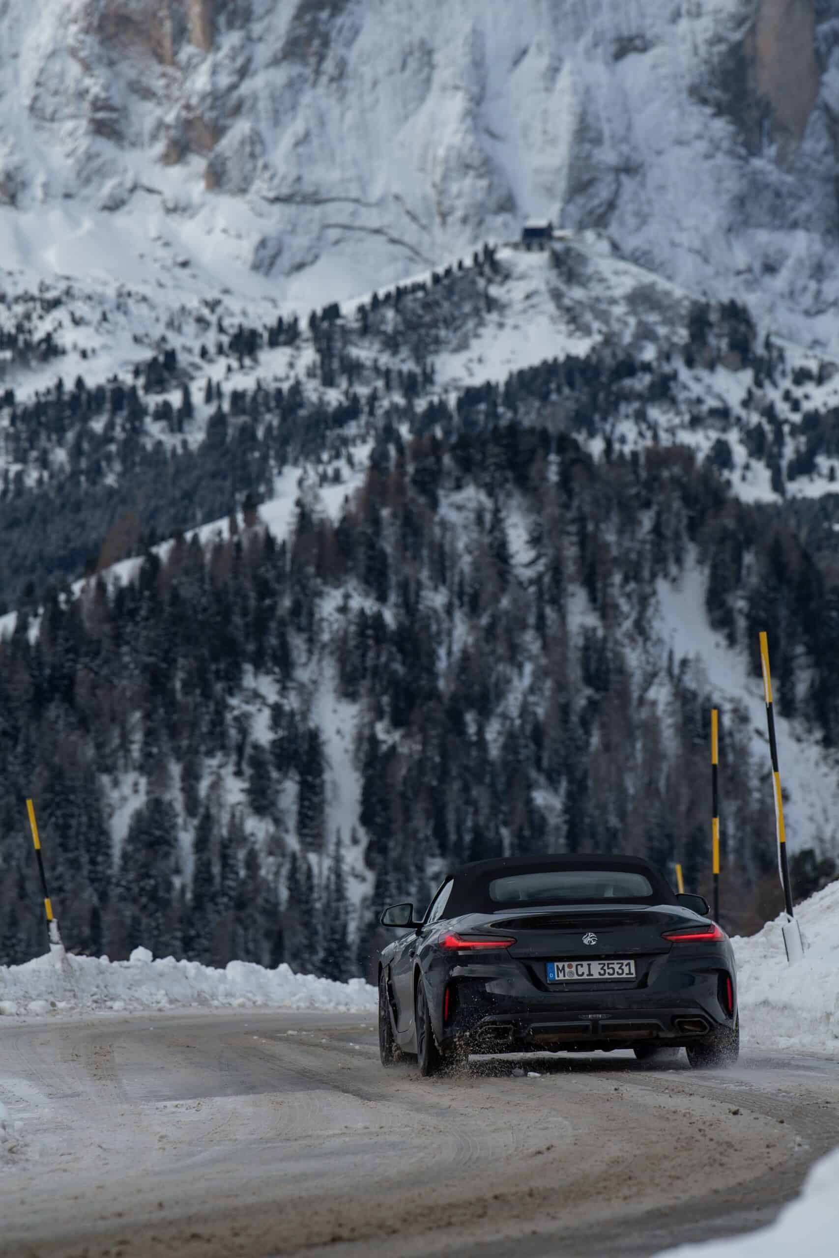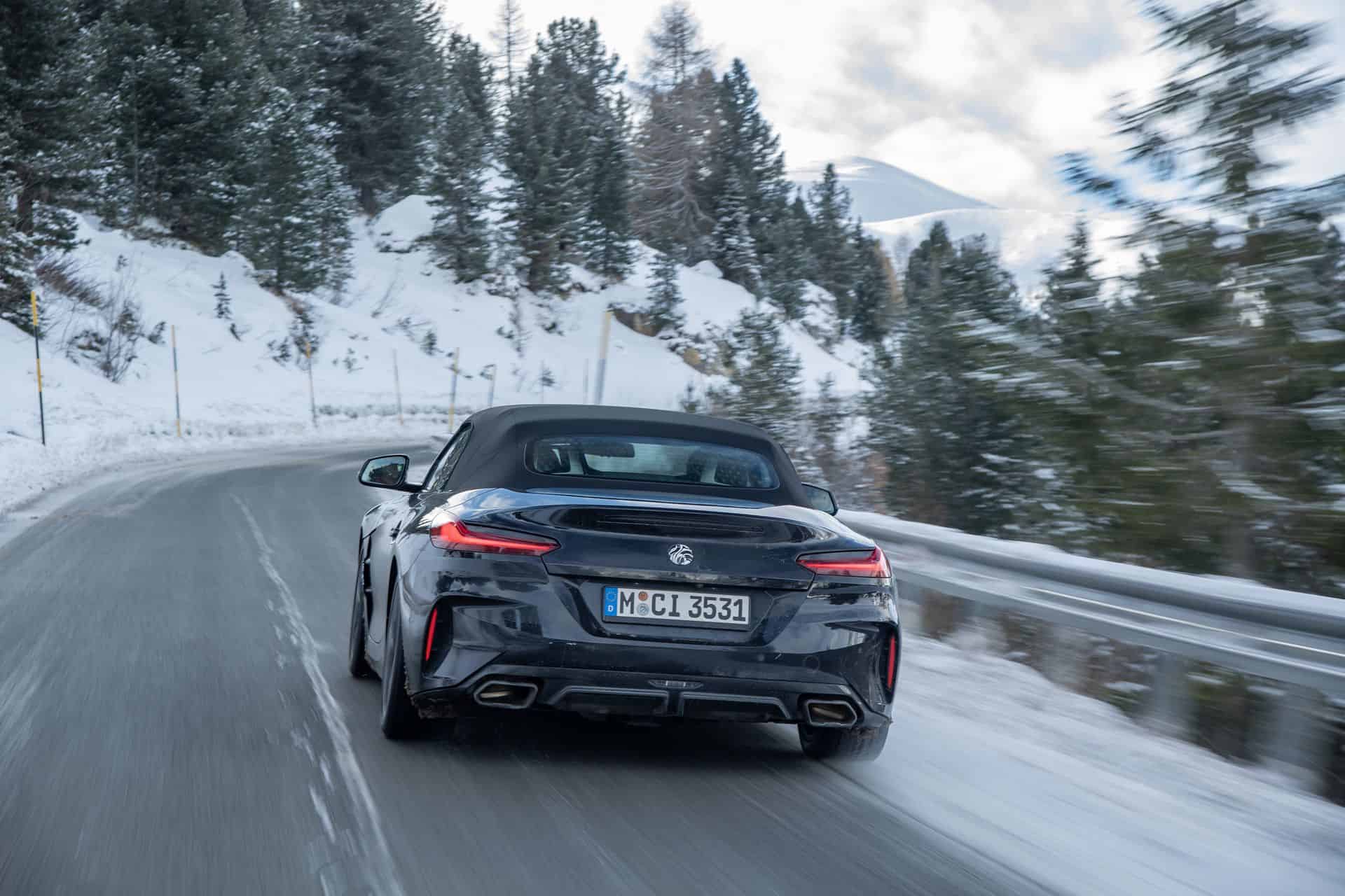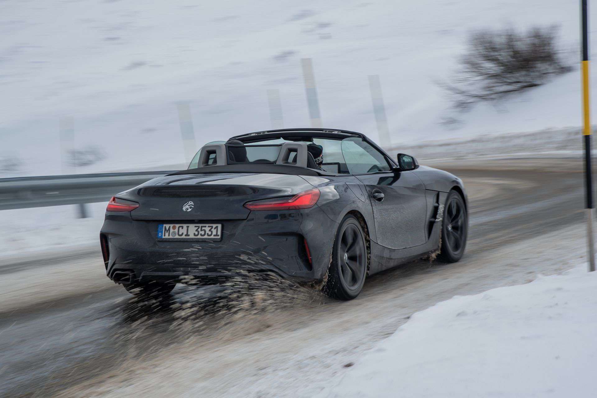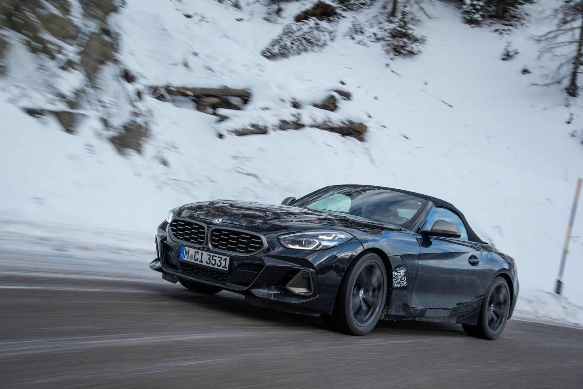 Seen here is a Euro version of the “analog” Z4 M40i with a German license plate while testing in the Dolomite Mountains. The six-speed ZF manual adapted by BMW will be available in Germany, but other markets have yet to be announced. While the US-spec prototype we saw a few days ago was painted in matte Frozen San Remo Green, this one keeps it simple with a Sapphire Black color. It does away with the orange side markers mandatory in North America and has a different set of wheels with winter tires.