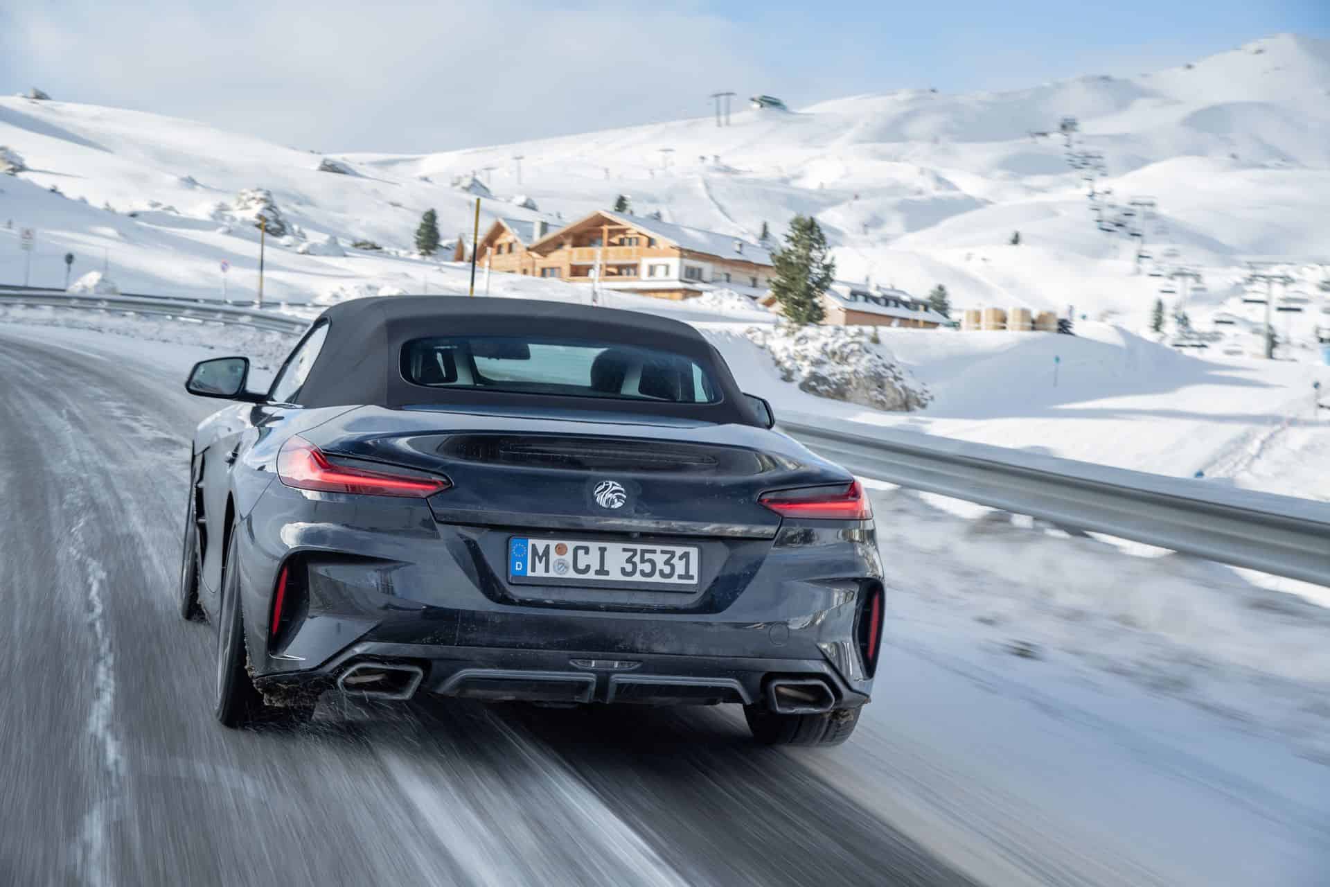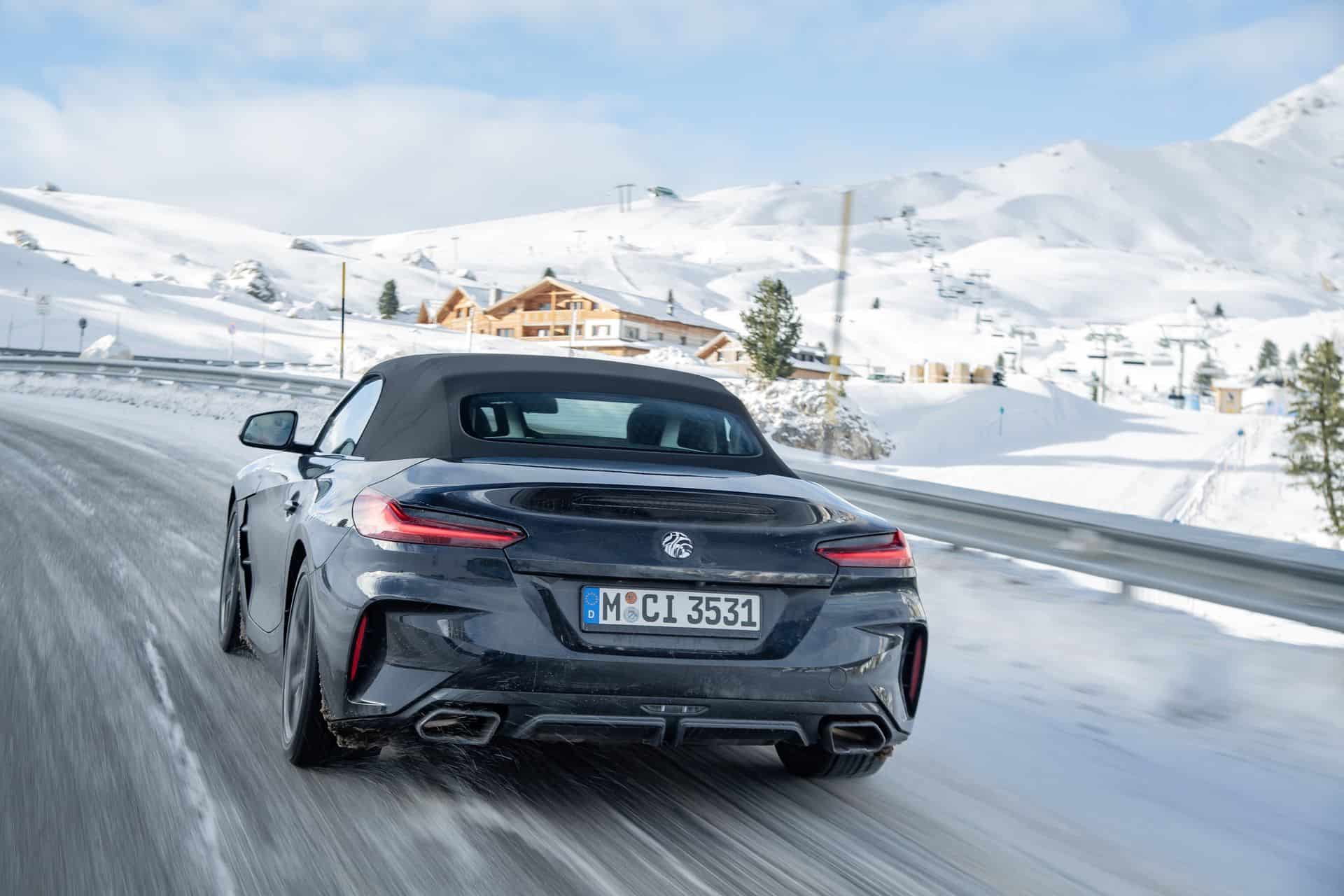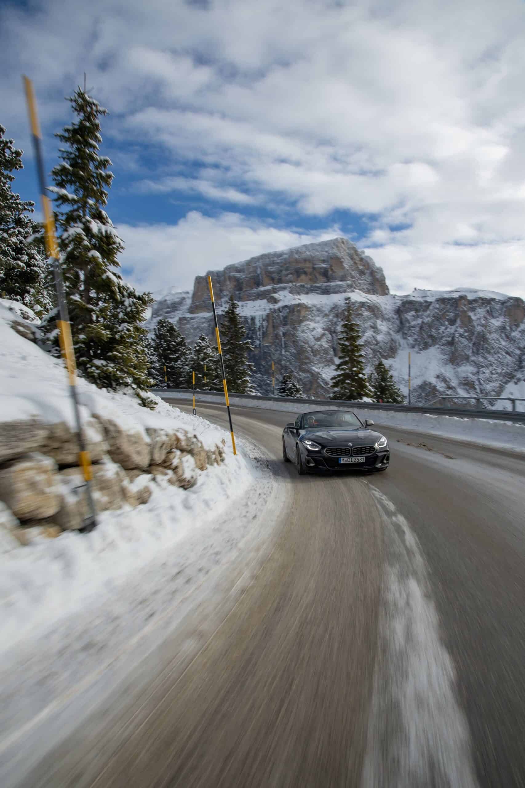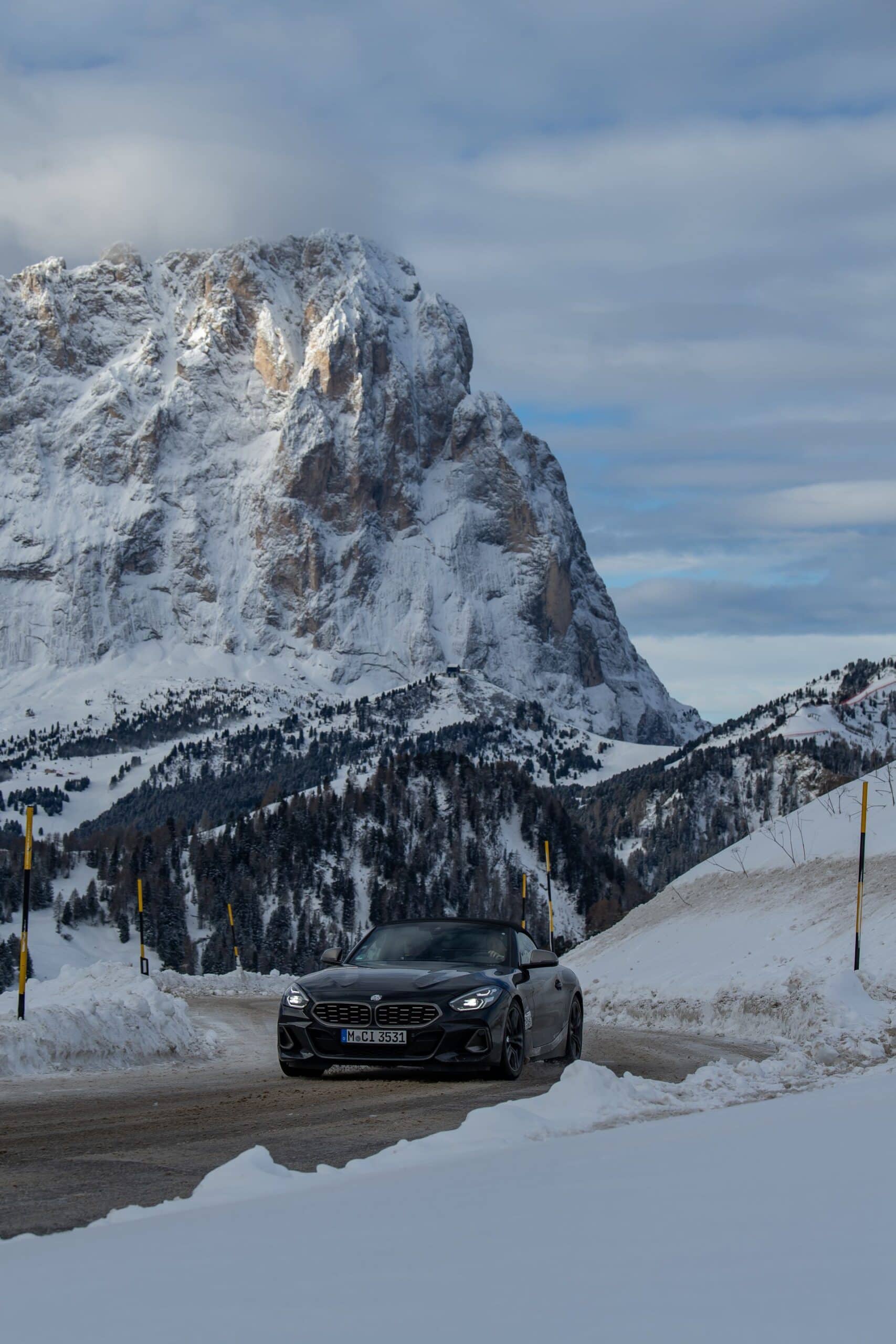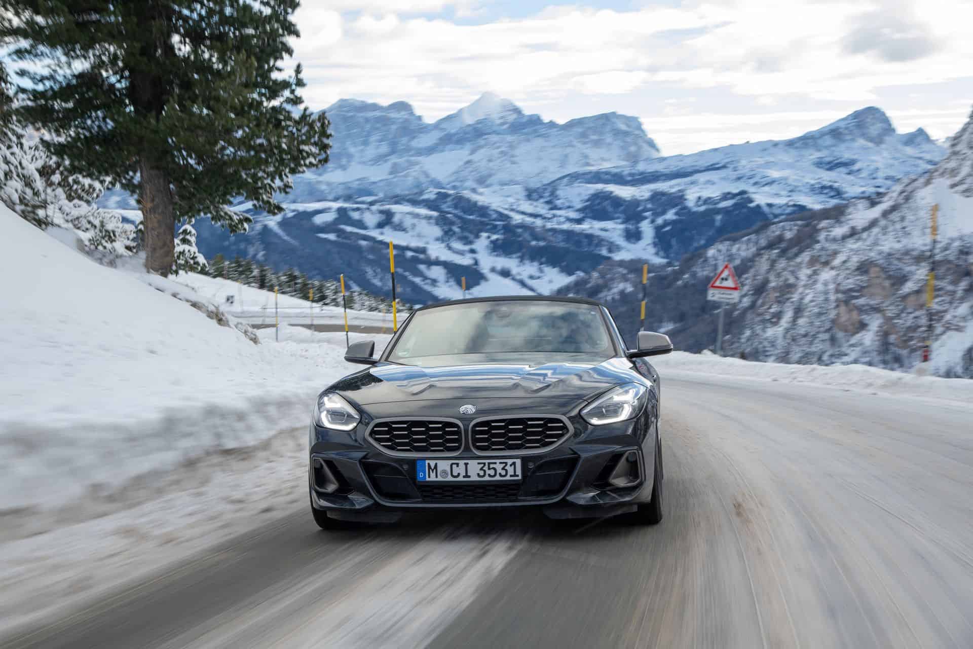 Seen here is a Euro version of the “analog” Z4 M40i with a German license plate while testing in the Dolomite Mountains. The six-speed ZF manual adapted by BMW will be available in Germany, but other markets have yet to be announced. While the US-spec prototype we saw a few days ago was painted in matte Frozen San Remo Green, this one keeps it simple with a Sapphire Black color. It does away with the orange side markers mandatory in North America and has a different set of wheels with winter tires.