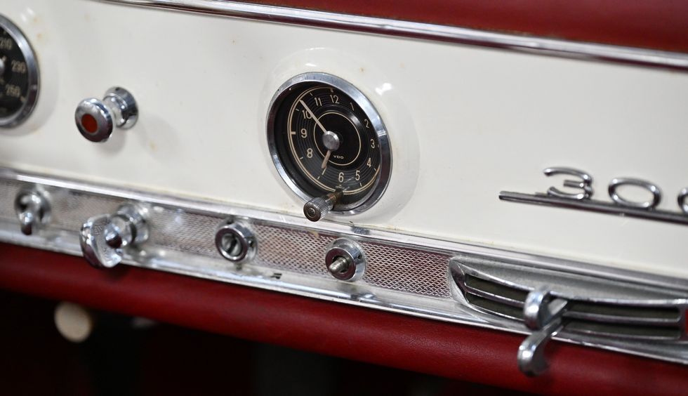 Model number 55-00048 left the Mercedes-Benz factory in Sindelfingen on January 29, 1955. It’s painted in its original colors, known internally as DB 50. That’s a white body with Roser Red (1079) leather interior. It was never restored, although it appears at some point to have been repainted.