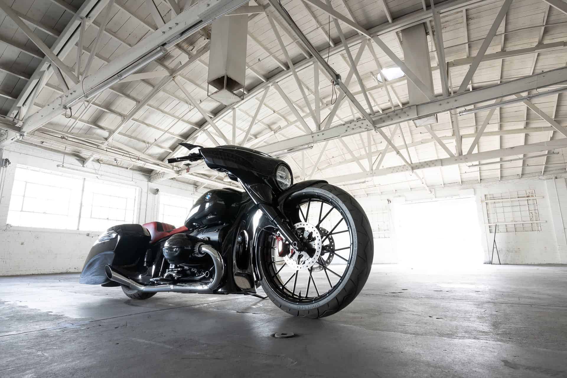 One of the most striking features of the bike is the massive 26-inch front wheel, cut from a solid block of aluminum. The frame was stretched and raked to accommodate the wheel, and custom triple trees were engineered to ensure optimal handling. The bodywork of the bike is equally impressive. Yaffe and his team crafted several one-of-a-kind components, such as the steel front fender and the chin spoiler. They also modified existing R 18 elements, such as the fairing, to flow seamlessly with the new design.