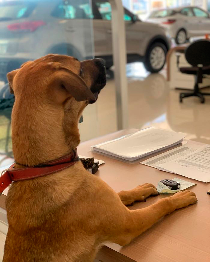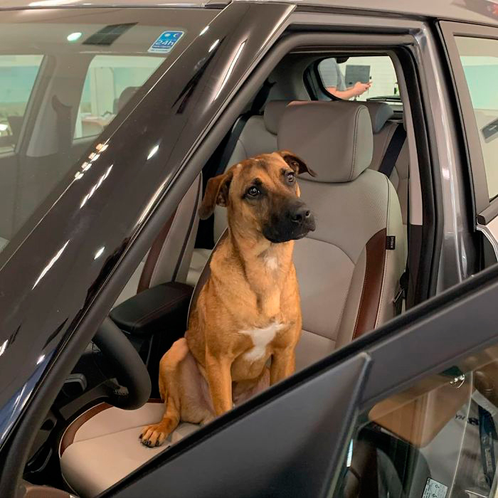 A principios de año, el personal de este concesionario de Hyundai vio a un perro paseando por los alrededores. Al principio pensaron que sería algo temporal y que pronto se iría a buscar apoyo en otro sitio, pero pasaba el tiempo y se volvió evidente que había decidido quedarse. Así que le dejaron.