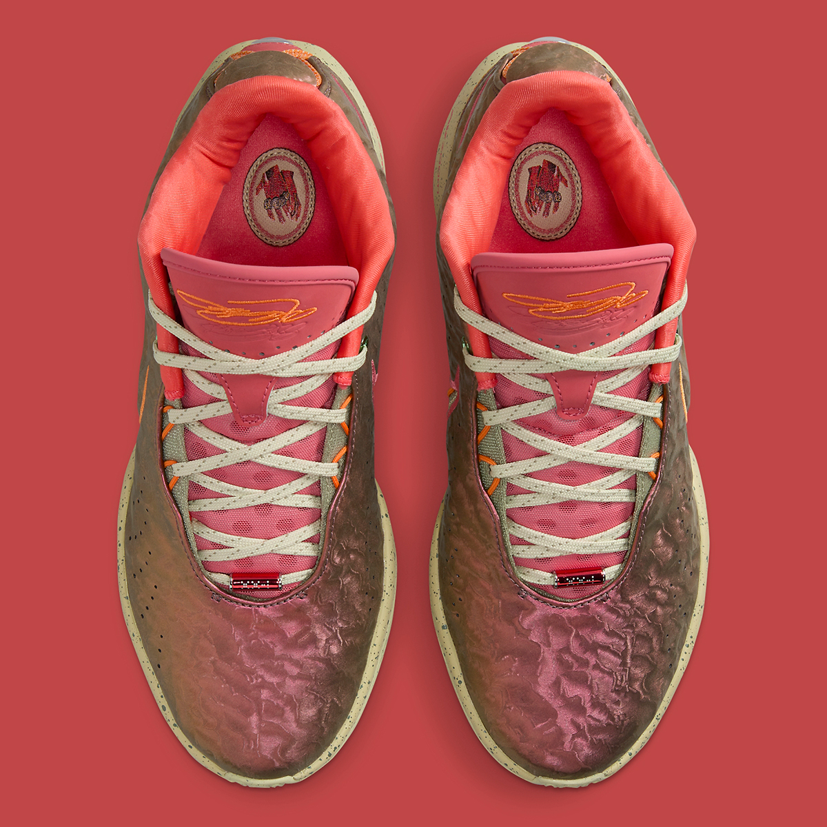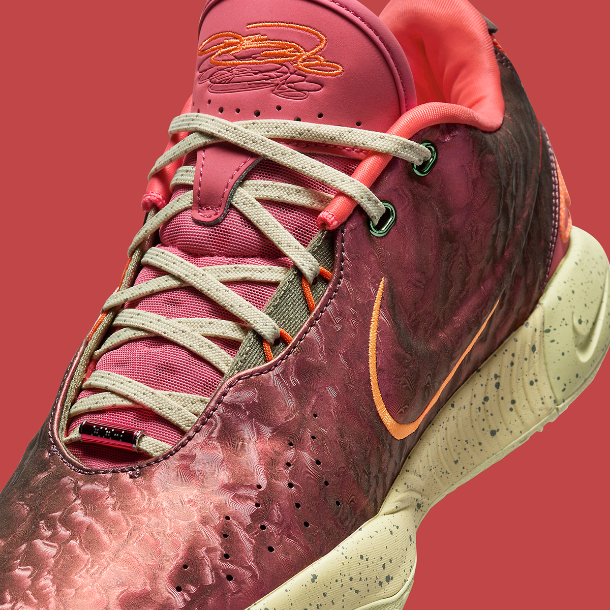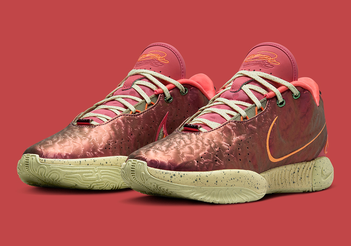 Once again, the LeBron 21 arrives with a shimmering sheen on the exterior intended to mimic the iridescent nature of the shell’s interior. This “Queen Conch” colorway is colored in bold Ember Glow finishes with an illusory texture that appears like the outer shell. Despite the protective exterior, the interior is plush and comfy due to the quilted interior padding. It sits above an Elemental Gold midsole speckled with flecks of black.