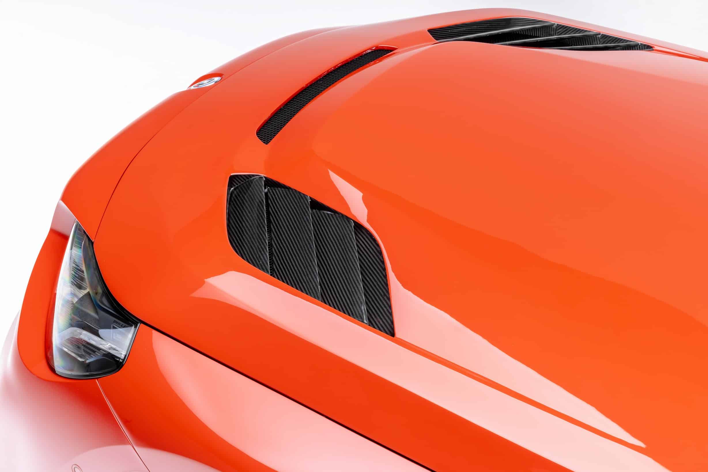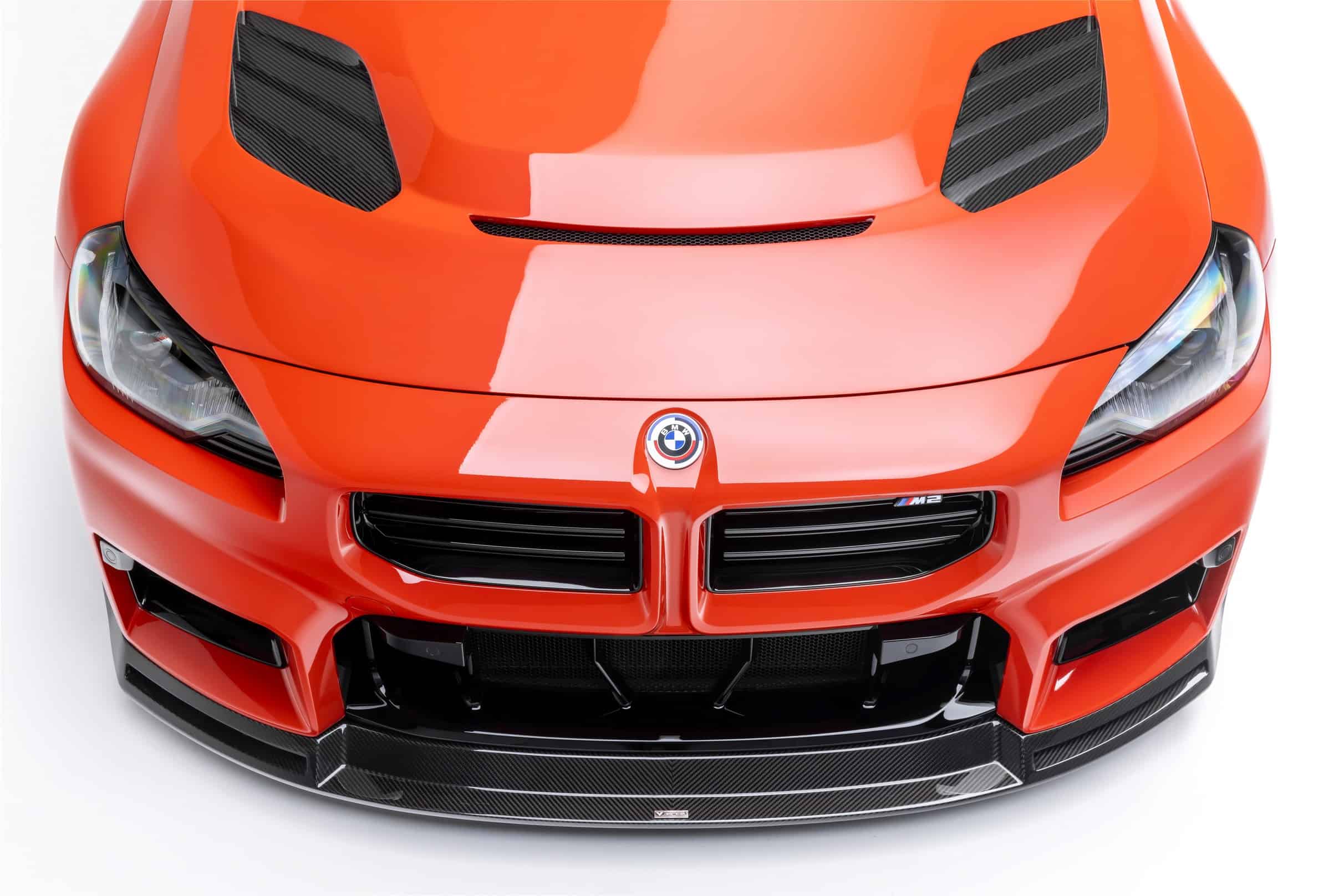 Moving to the sides of the car, the custom BMW M2 has a more muscular profile with carbon side skirts and new front fenders with built-in aero slats. The lightweight hood has received a similar carbon treatment and cutouts for heat dissipation. Vorsteiner’s aero package is rounded off by a prominent front spoiler lip. To top it all off, the original alloys have made way for a forged VFX-002 set while the BMW roundels have been swapped with the 50th anniversary emblems.