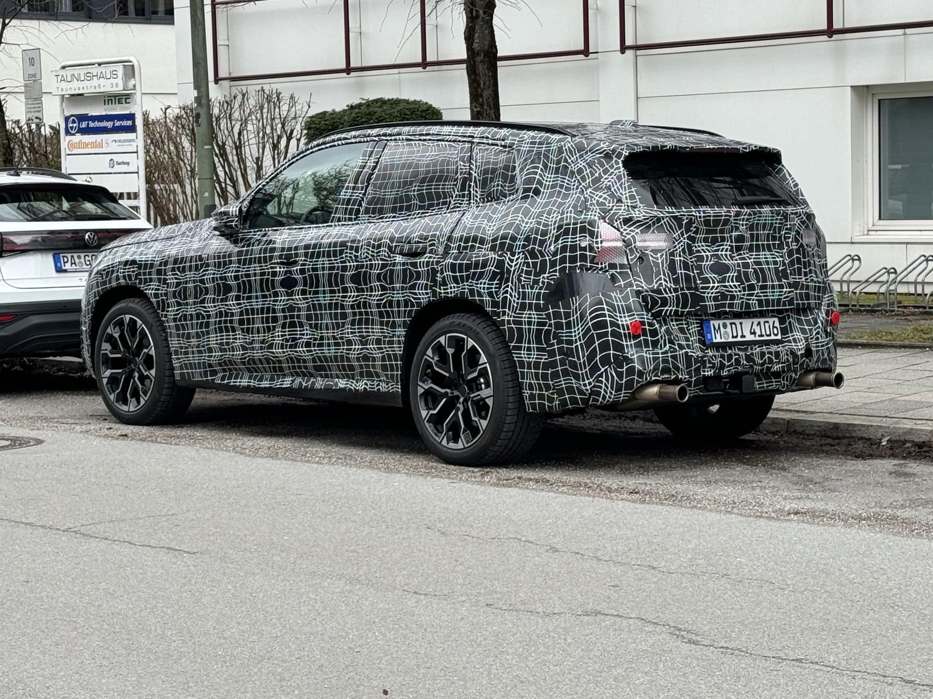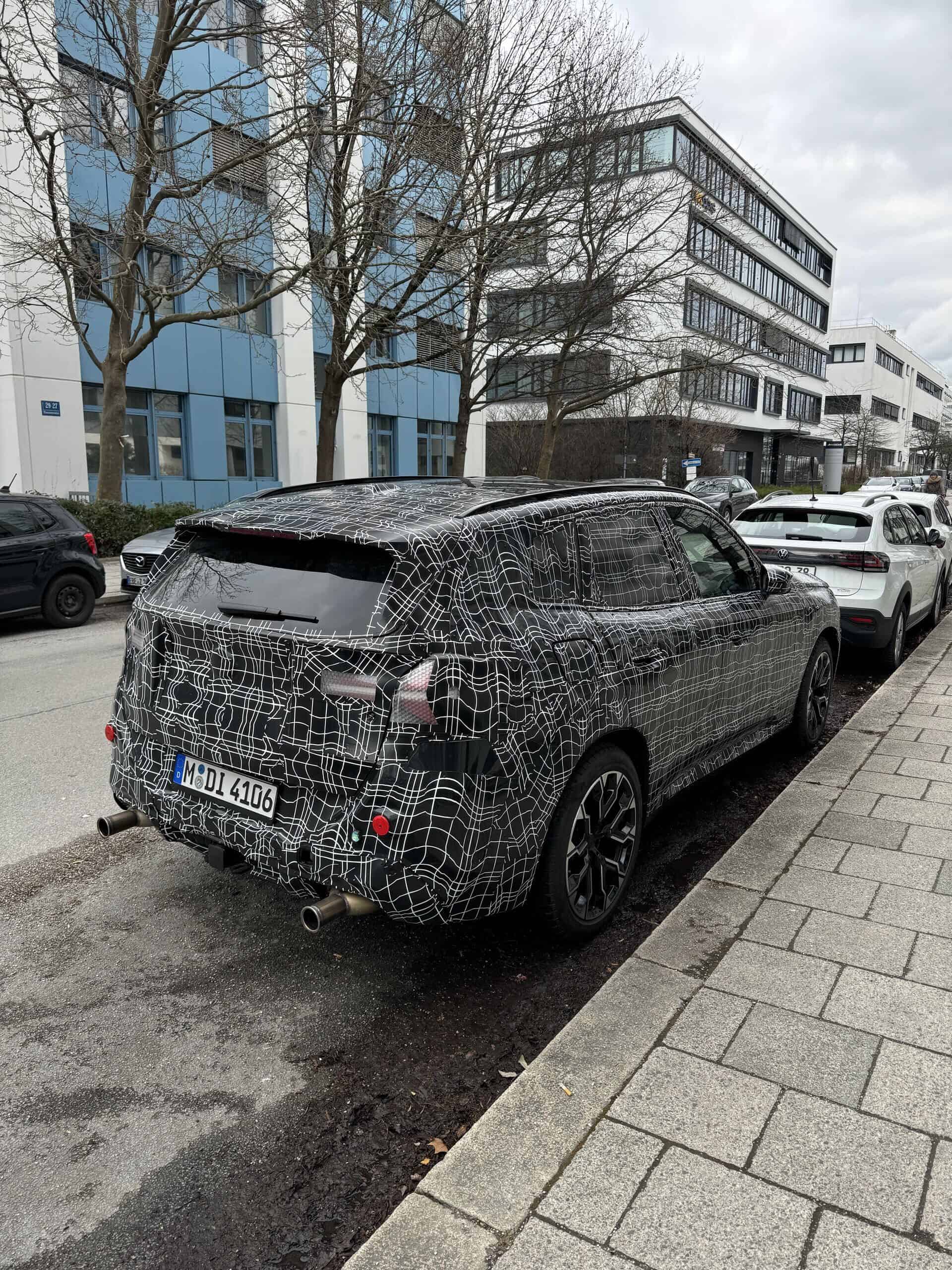 With the X3 G45’s world premiere fast approaching, it makes sense that BMW is evaluating more and more prototypes with the production body and interior. Such is the case here with this camouflaged test vehicle parked on the side of the road between two test sessions. It has all the panels in place, along with the final headlights, taillights, large two-tone wheels, and interior.