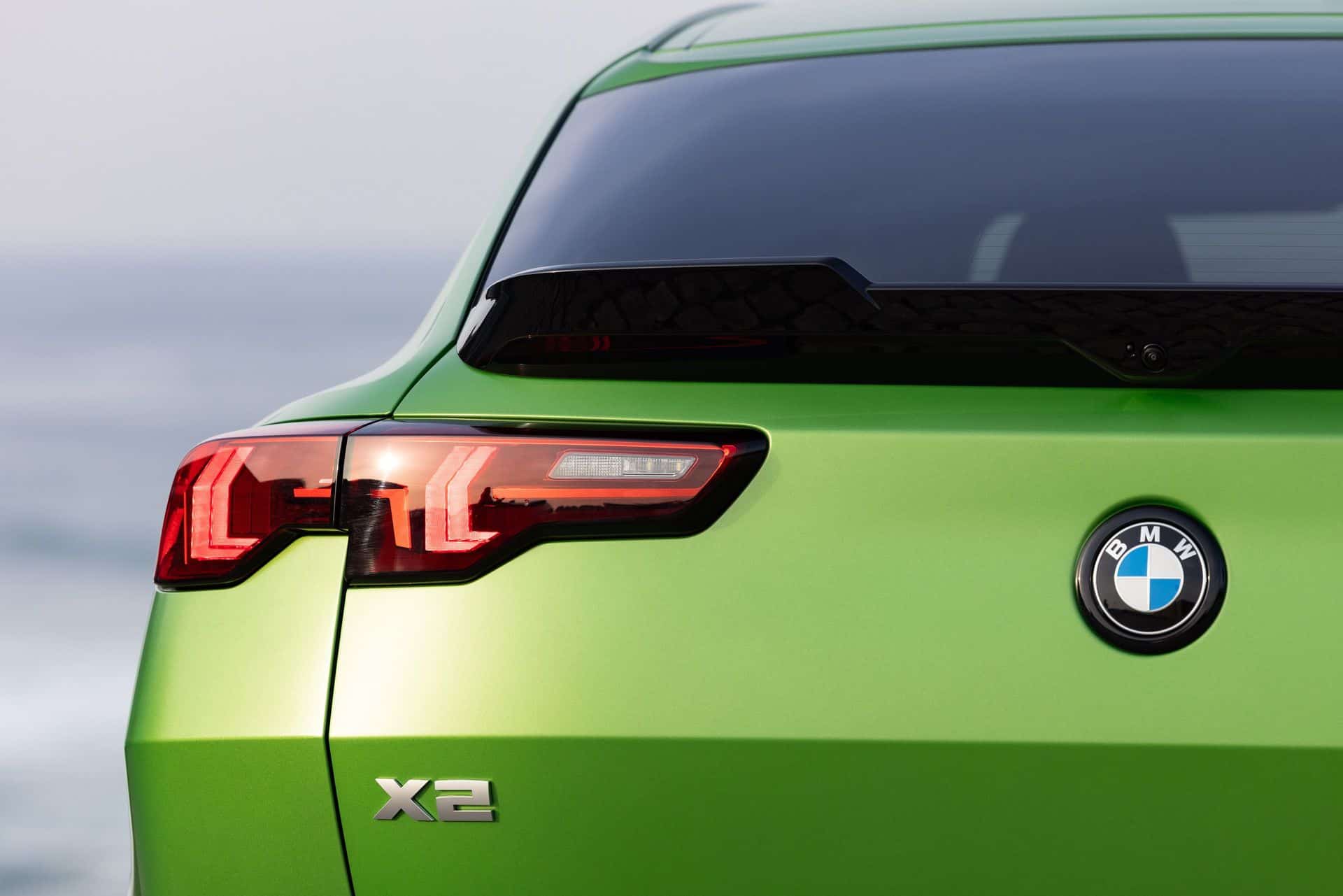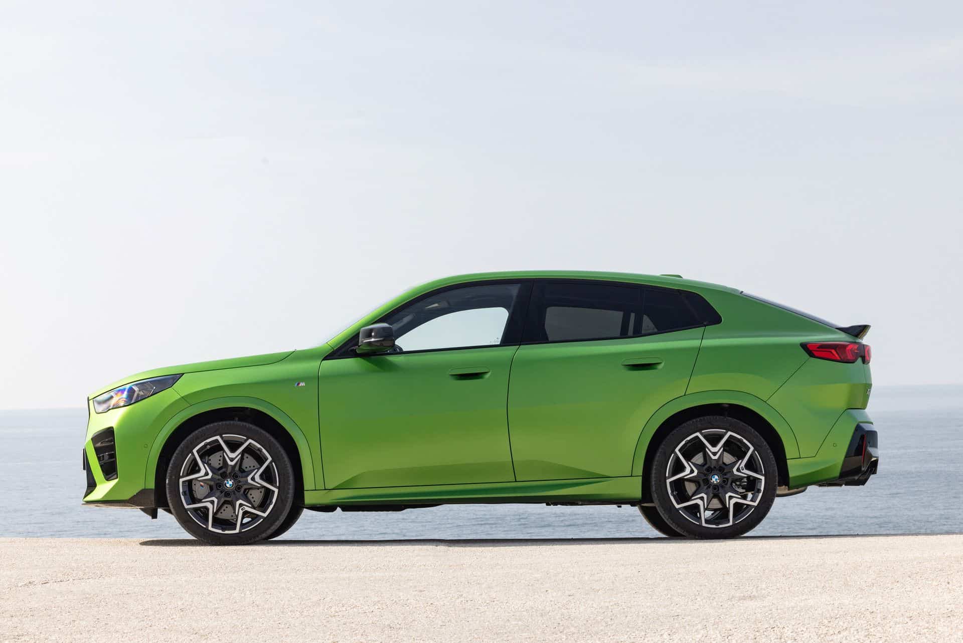 Viewing the car from the side reveals the evolutionary leap from its predecessor and highlights its minimal resemblance to the X1. The sloping roofline is the most noticeable feature distinguishing the two, lending a coupe-like style reminiscent of the X4 and X6 models. Despite the window frame bearing a resemblance to the previous X2’s sleek design, including an inverted Hoffmeister kink, the absence of roundels on the thick C-pillar introduces a more pronounced fastback silhouette.