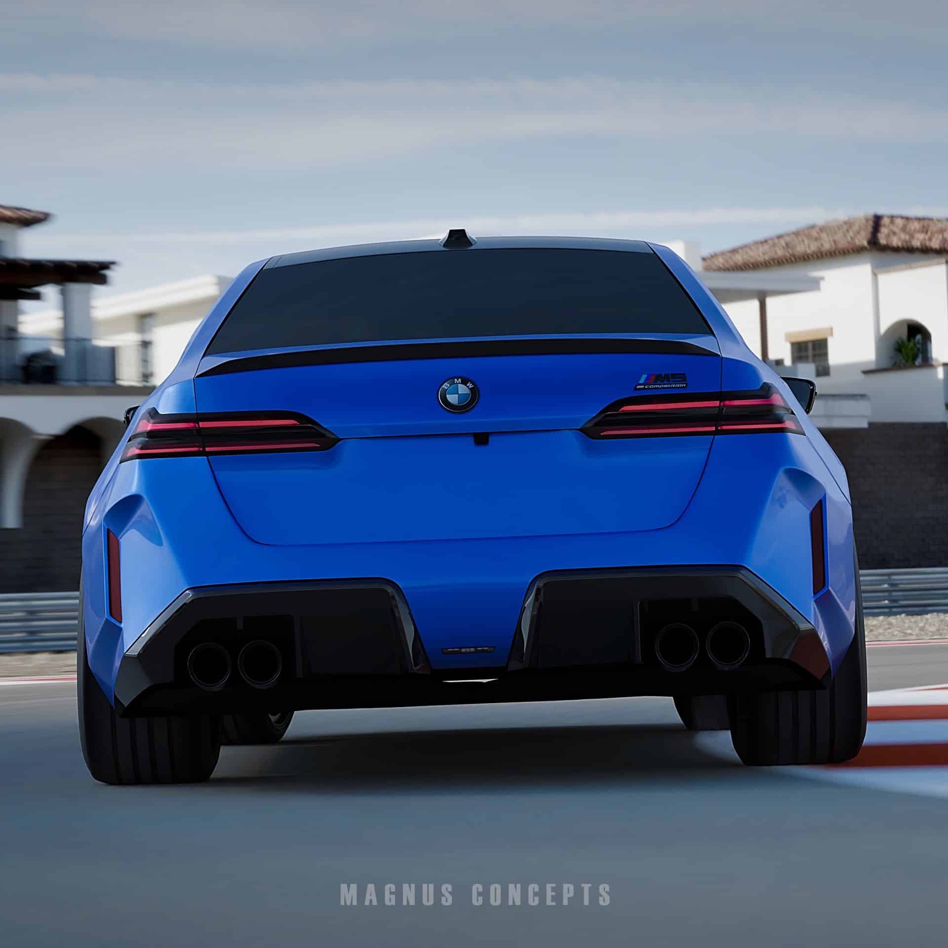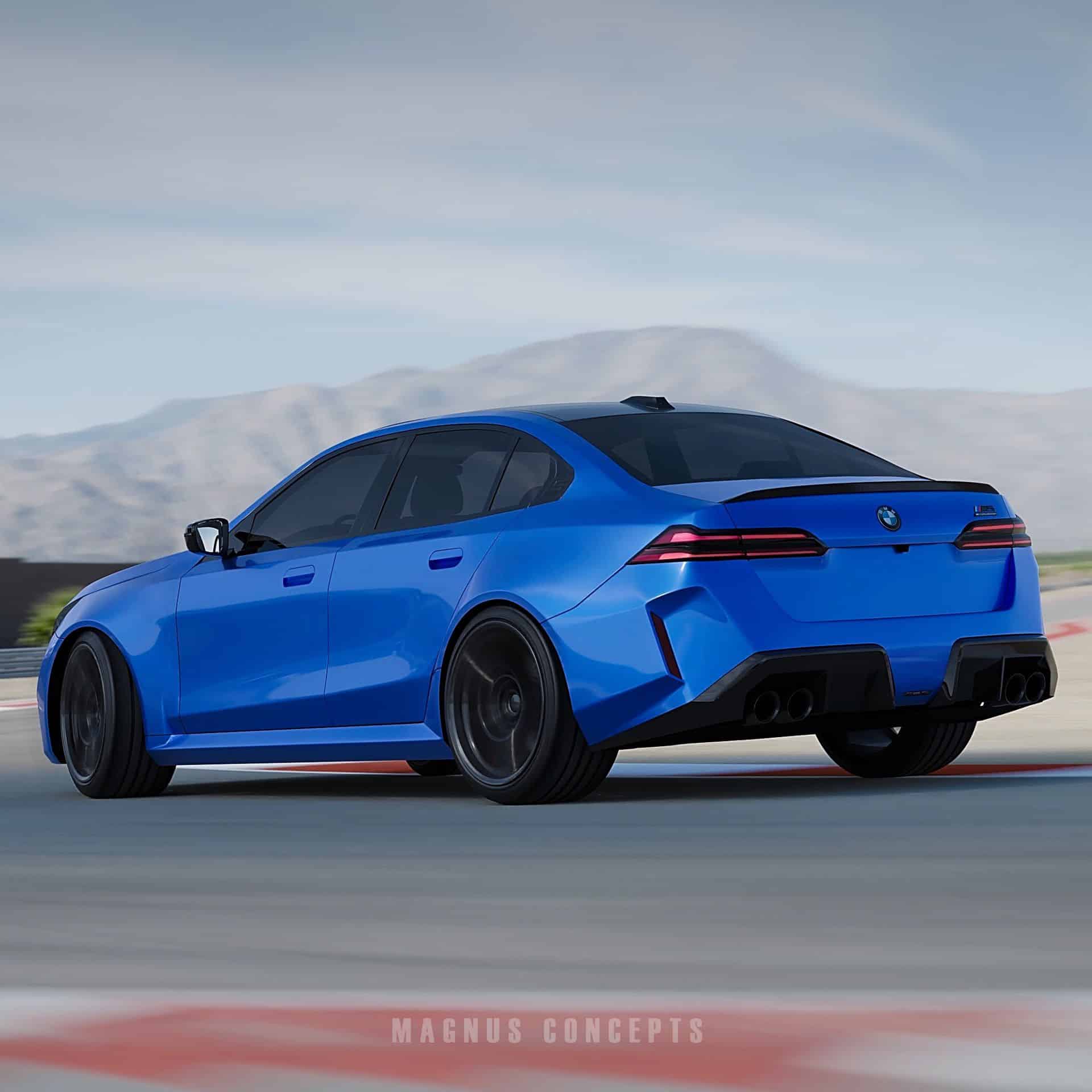 The side profile showcases wide fenders, an aggressive rocker panel, and two sharp lines, alongside large wheels—a hallmark of M models. Flush door handles and M mirrors enhance the sleek look. Despite the rear-end design being no secret, the renderings still anticipate quad exhaust pipes and a distinctive diffuser, rounding off the dynamic aesthetics of the new M5. Of course, a subtle spoiler is also present.