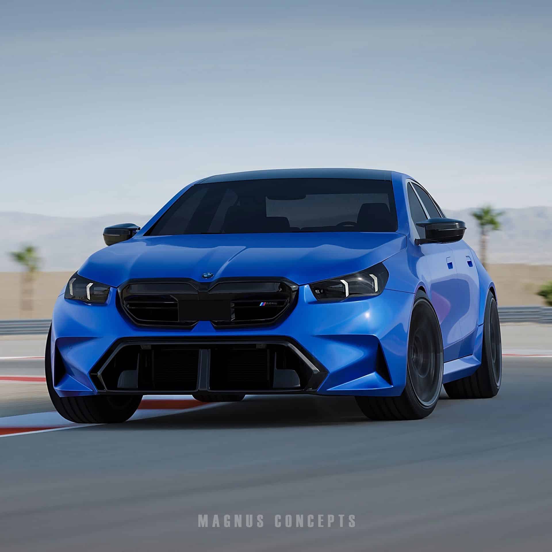 With spy photos hinting at the front design and leaks revealing the rear, the artist updated the renderings to reflect the latest insights. The front end borrows heavily from the i5 M60, aligning with BMW’s strategy to bridge the gap between M Performance models and the flagship M5. The design features distinctive lights and a kidney grille reminiscent of the i5 M60, complemented by a bold front fascia with large air intakes and air curtains, set against the striking backdrop of a matte blue paint. The grille, with its horizontal bars, nods to BMW’s Motorsport heritage, though the front radar remains prominent.