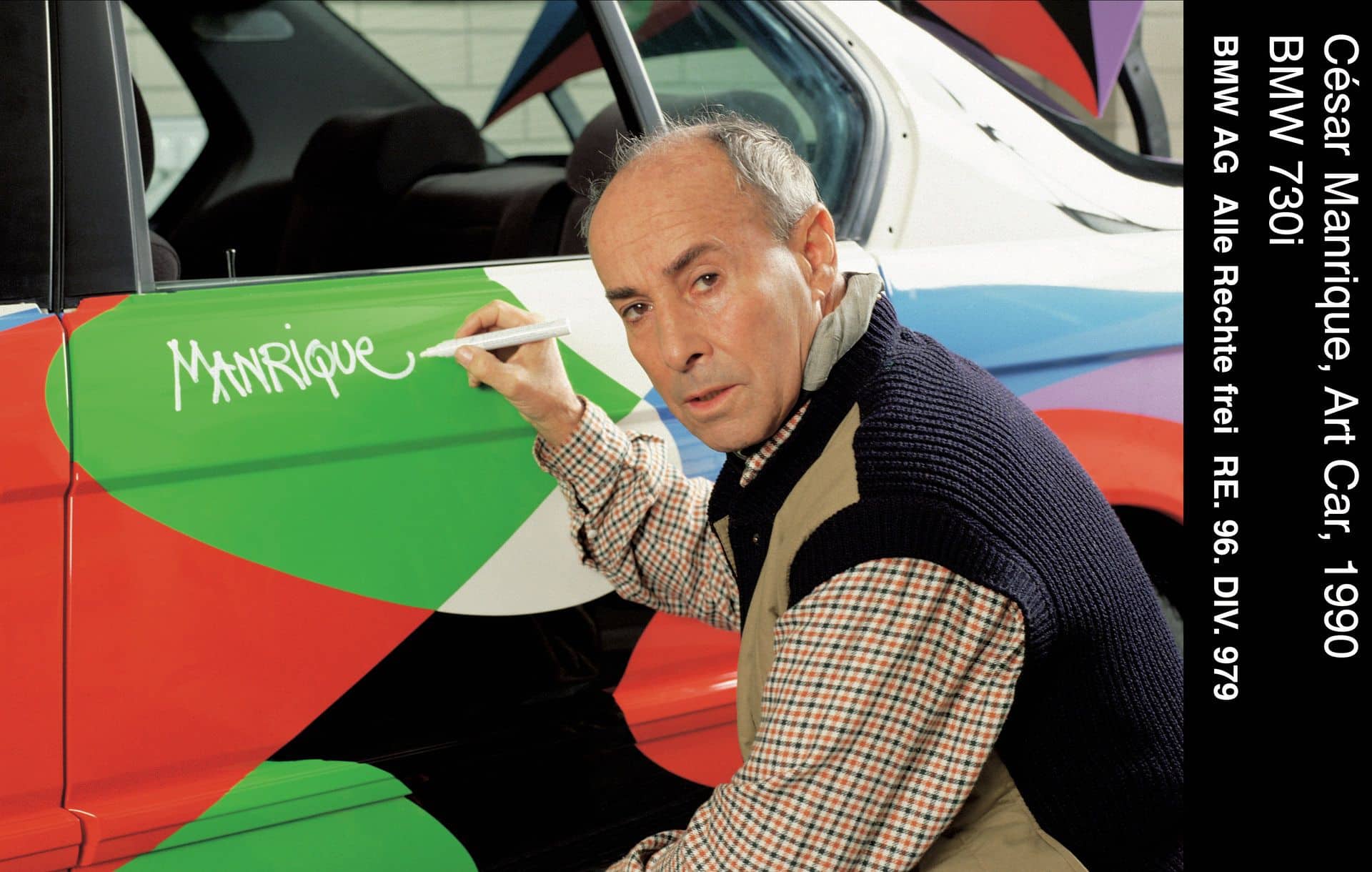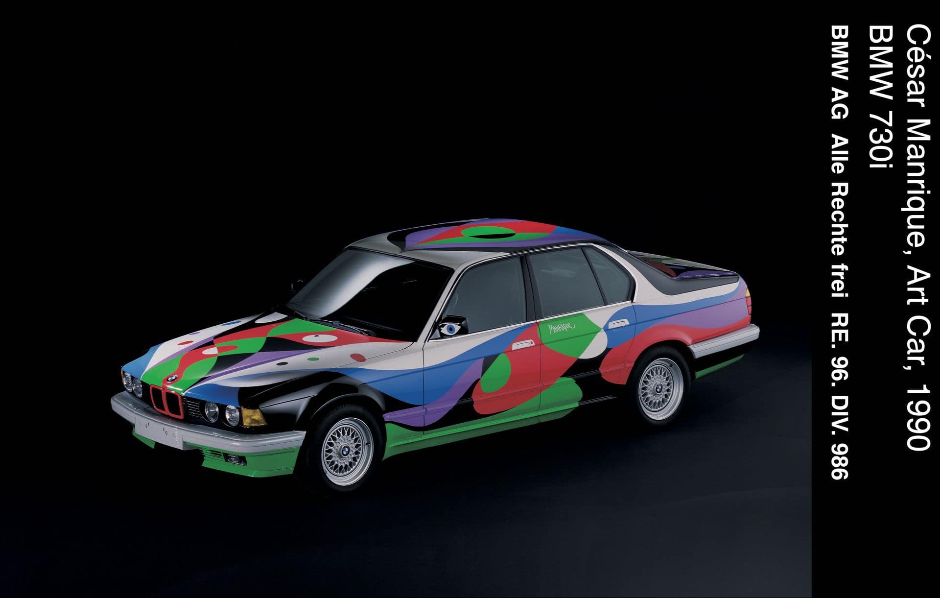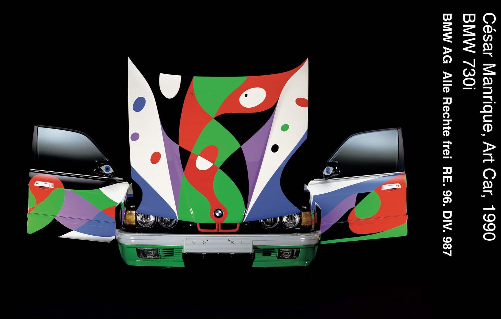 BMW Art Car number 10 was a colorful one handled by Spanish avant-garde artist César Manrique. Manrique – an accomplished architect, graphic designer, and sculptor – sought to blend technology and nature in his Art Car. He collaborated with artist and race car driver Walter Maurer, who also assisted Warhol, Stella, and others with their Art Car designs.