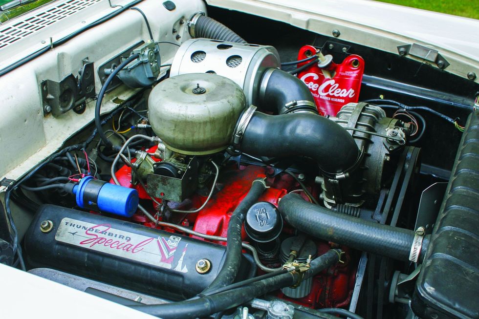 Nevertheless, the cat was out of the bag and supercharged Fords were showing up on the streets across America. The supercharged 312 was rated for 300 horsepower in street guise – 55 horses more than the “Thunderbird Special V-8” four-barrel 312, and 30 more than the “Thunderbird Super V-8” dual four-barrel 312. Supercharged equipped Fords have since become known as “F-code” cars as the first digit of the VIN–the engine identifier positionis an “F.” It’s worth noting that four-barrel 312 cars had a “D” in the first position and dualquad 312s had an “E” in the first position–thus an “E-code” identity amongst enthusiasts. It’s also worth noting the F-code V-8 replaced the E-code during the model year. It’s thought that anywhere between 1,000 and 1,500 production cars in total were turned out with the blown Y-block–211 of them being Thunderbirds.