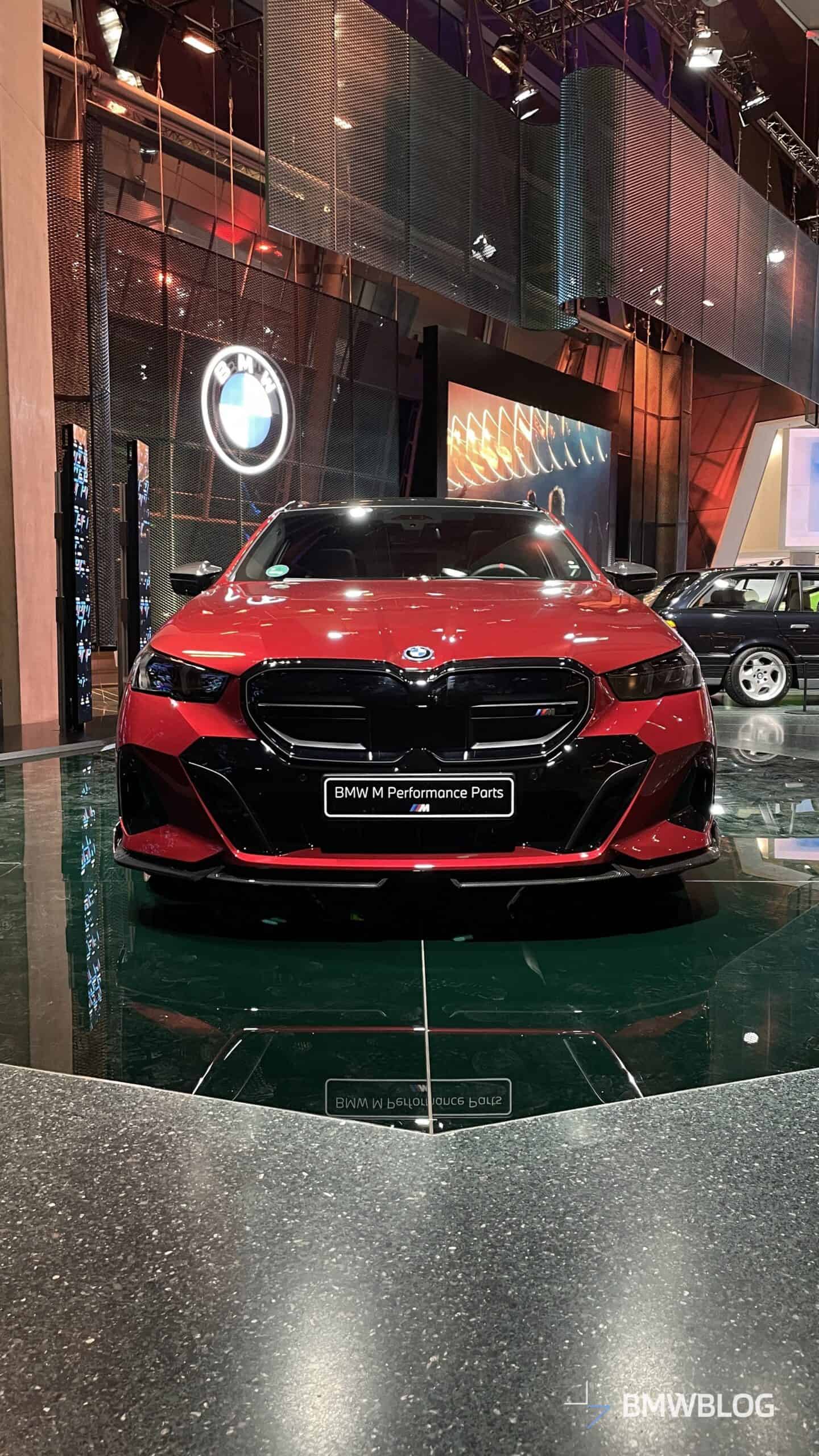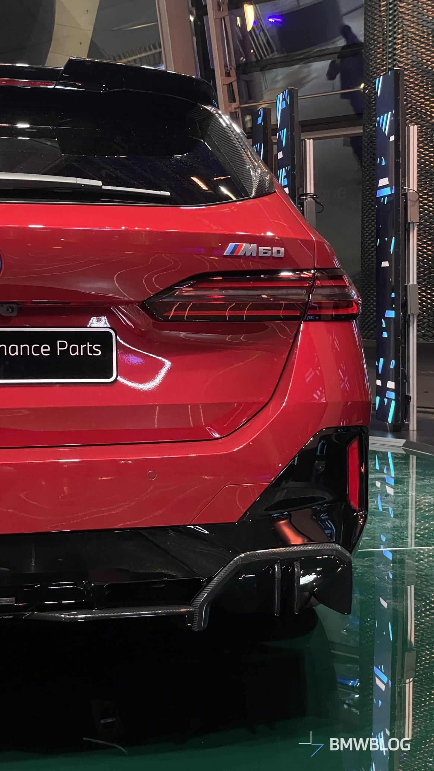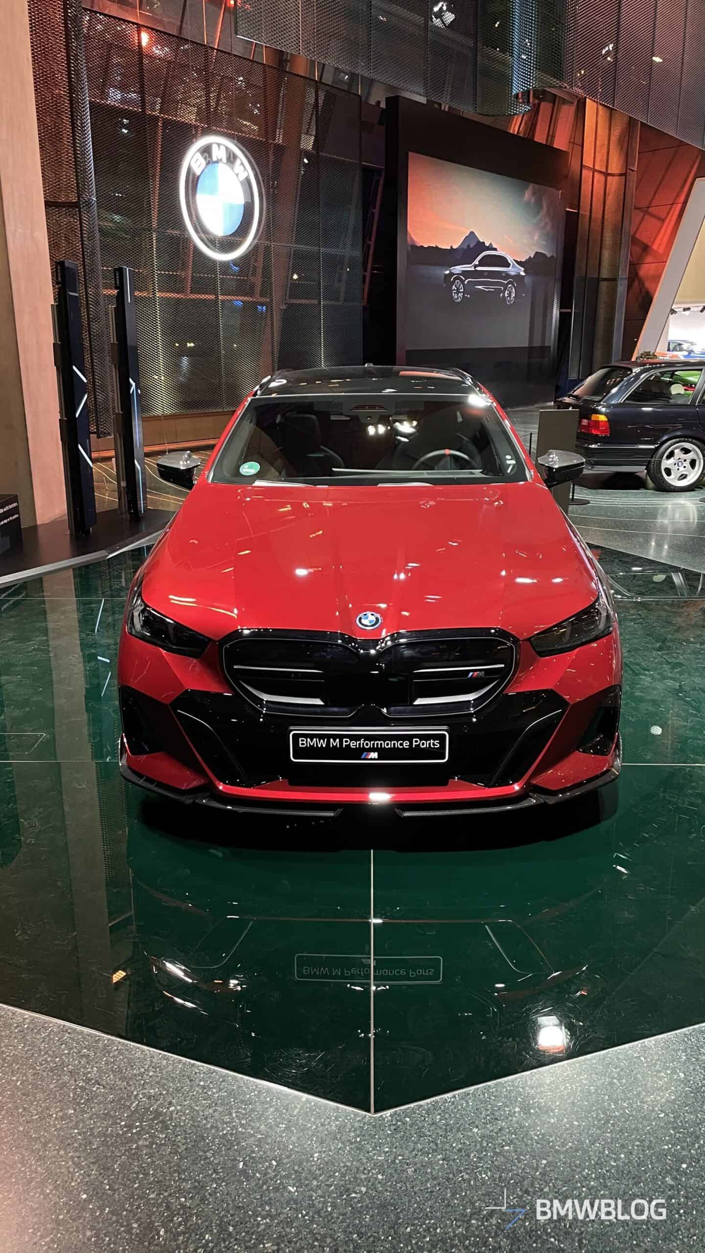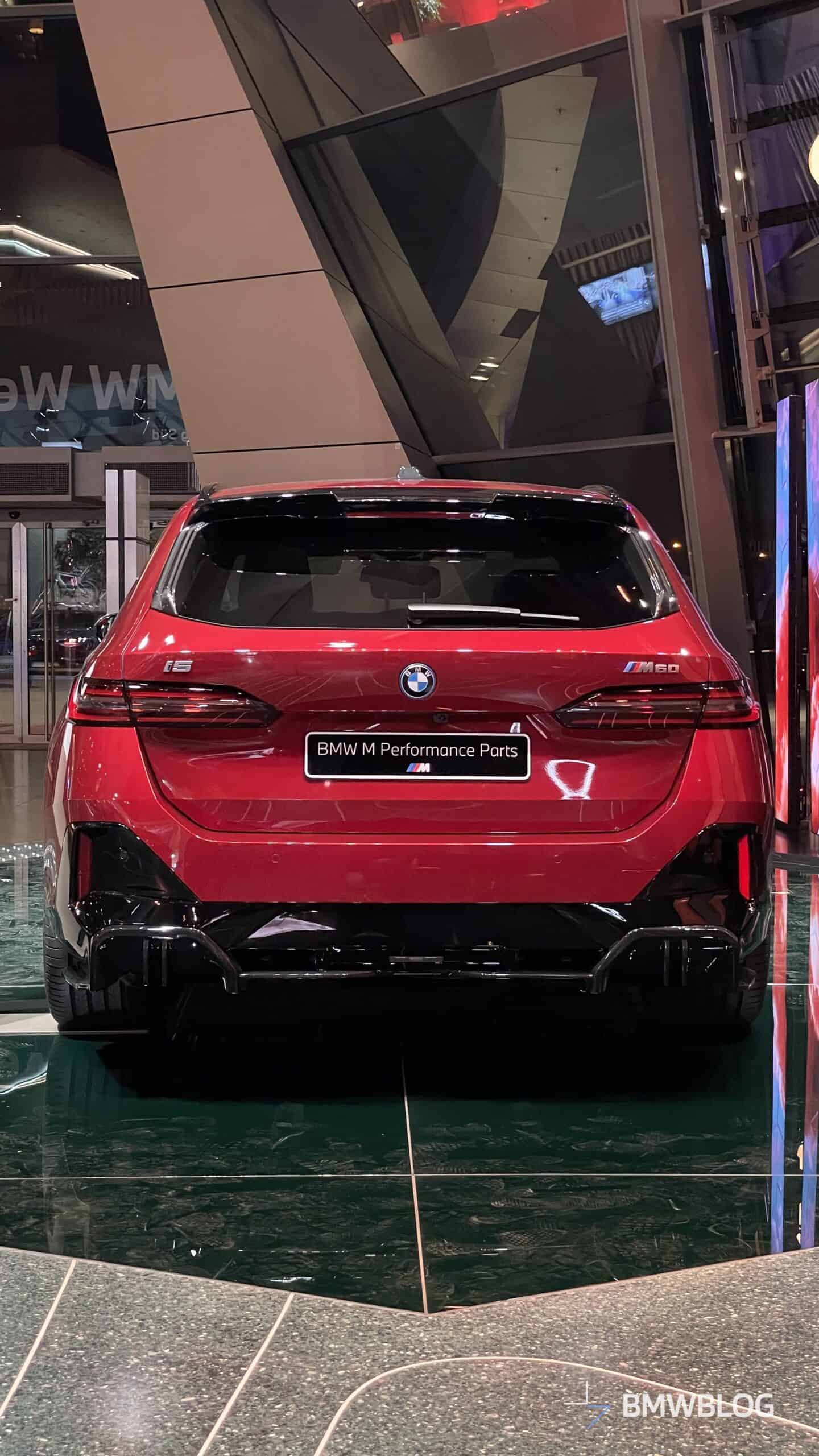 In an exclusive reveal at the BMW Welt, the first photos of the BMW i5 M60 Touring adorned with M Performance Parts have captured our attention today. The new M-tuned touring, painted in an eye-catching Fire Red, showcases a wide range of M Performance parts, starting with the usual carbon fiber aero bits.