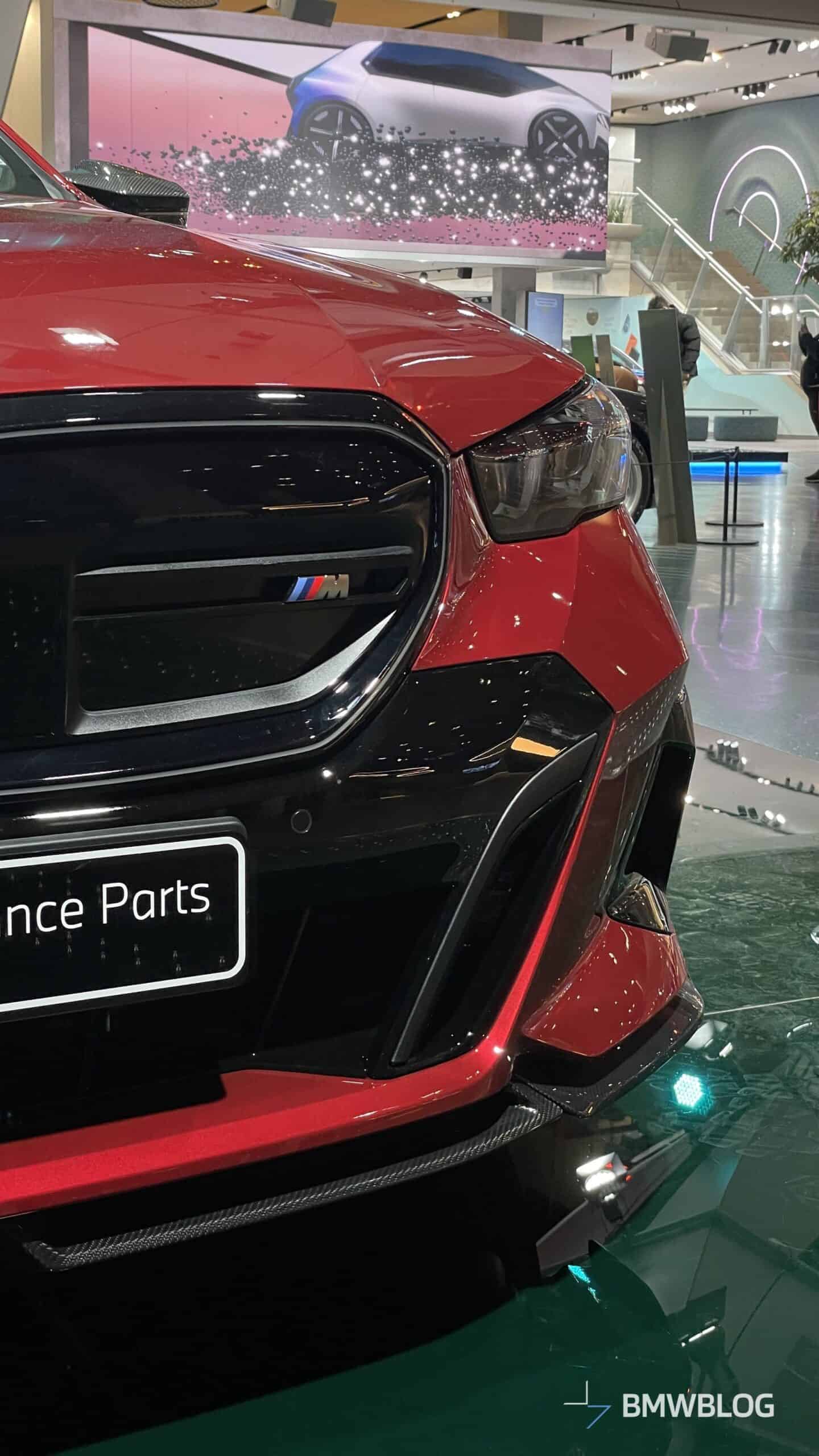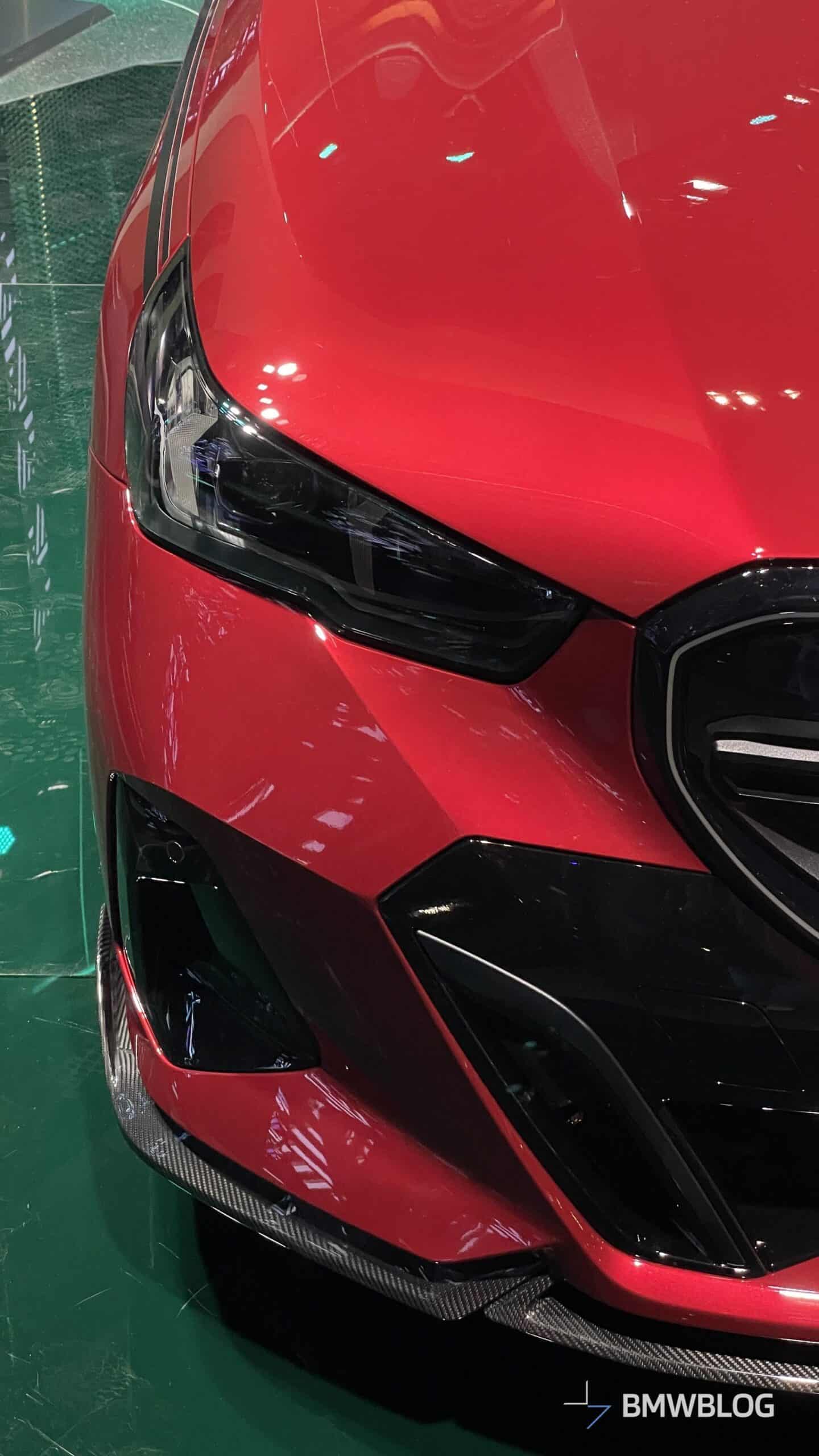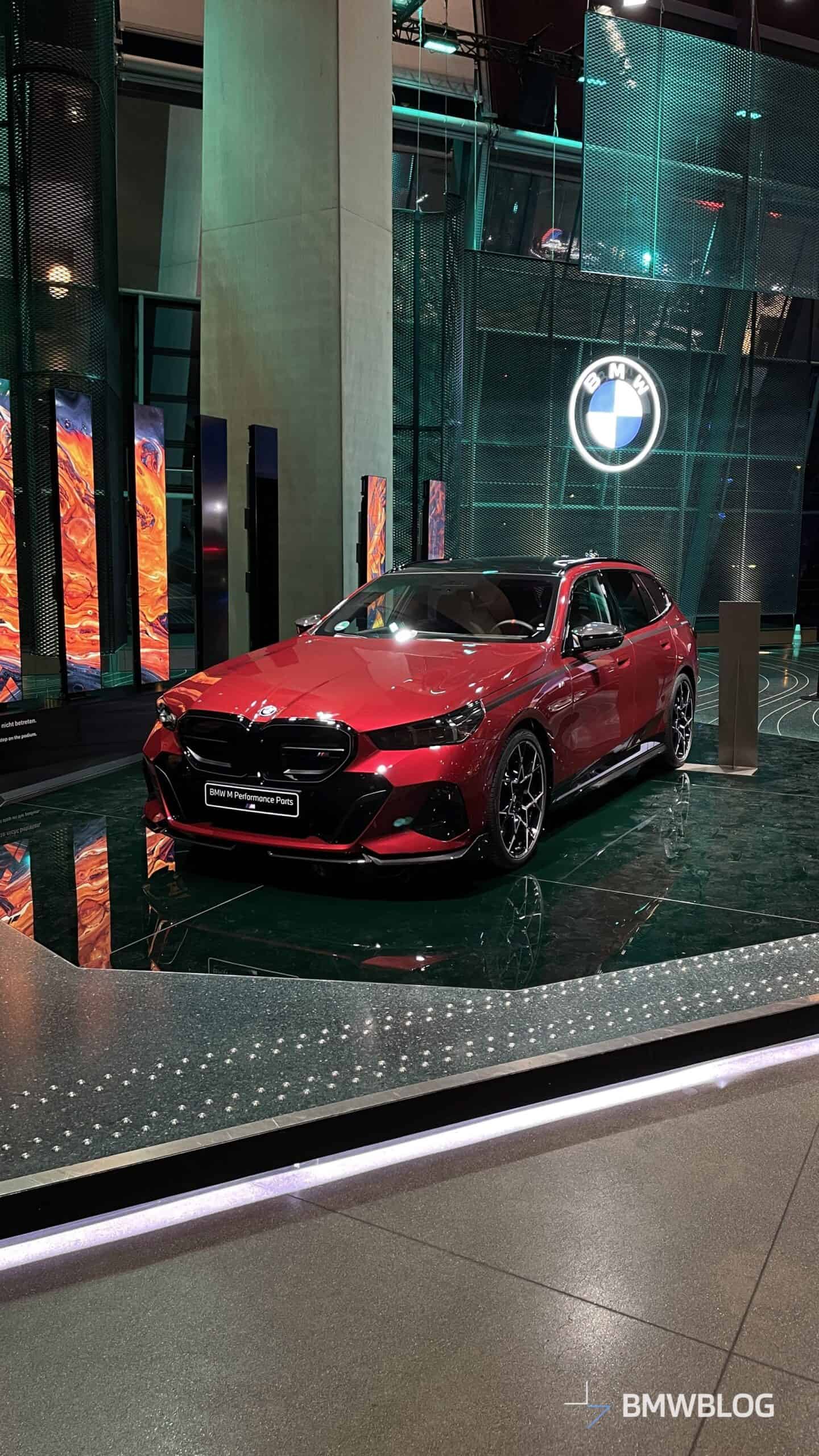 In an exclusive reveal at the BMW Welt, the first photos of the BMW i5 M60 Touring adorned with M Performance Parts have captured our attention today. The new M-tuned touring, painted in an eye-catching Fire Red, showcases a wide range of M Performance parts, starting with the usual carbon fiber aero bits.
