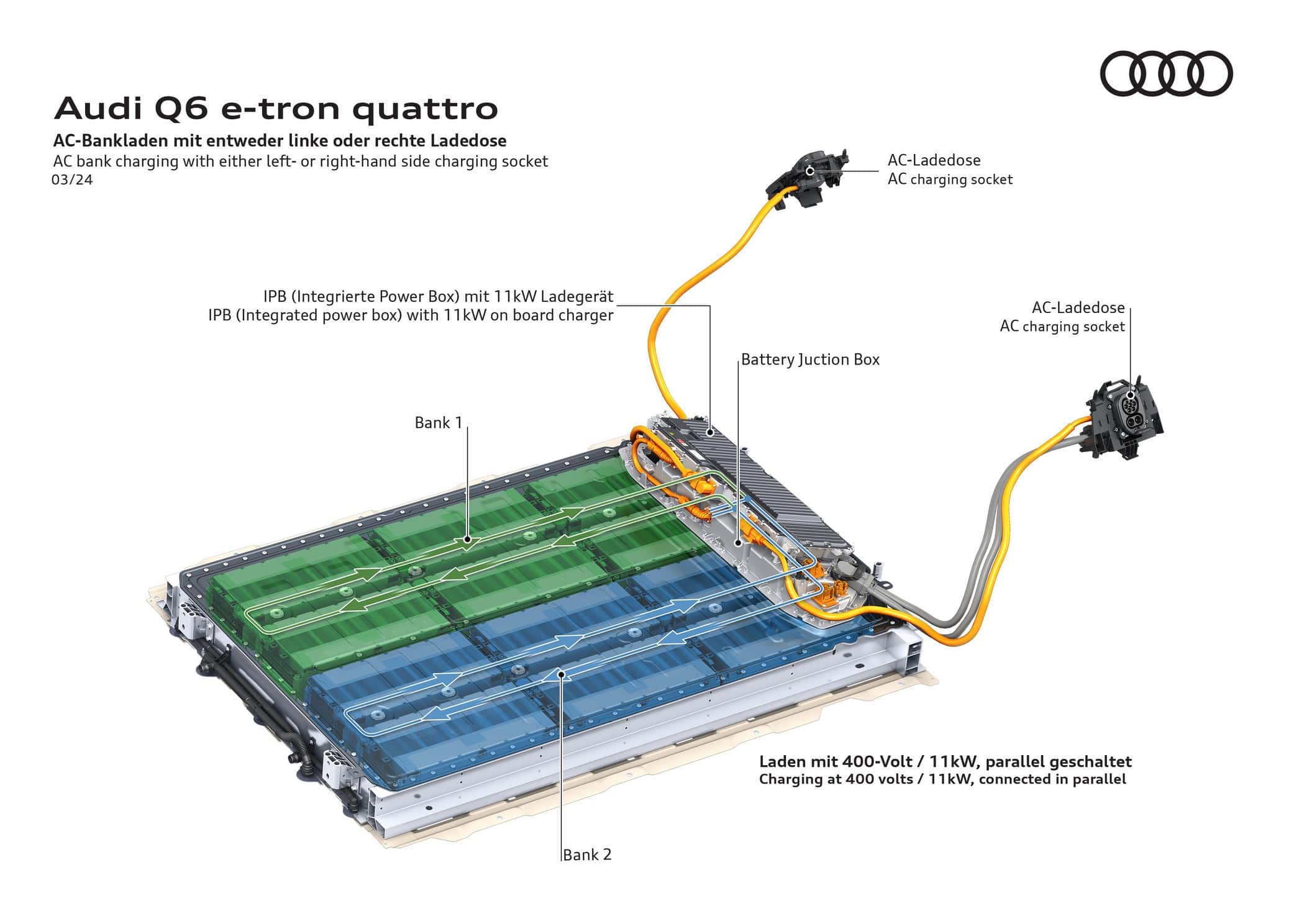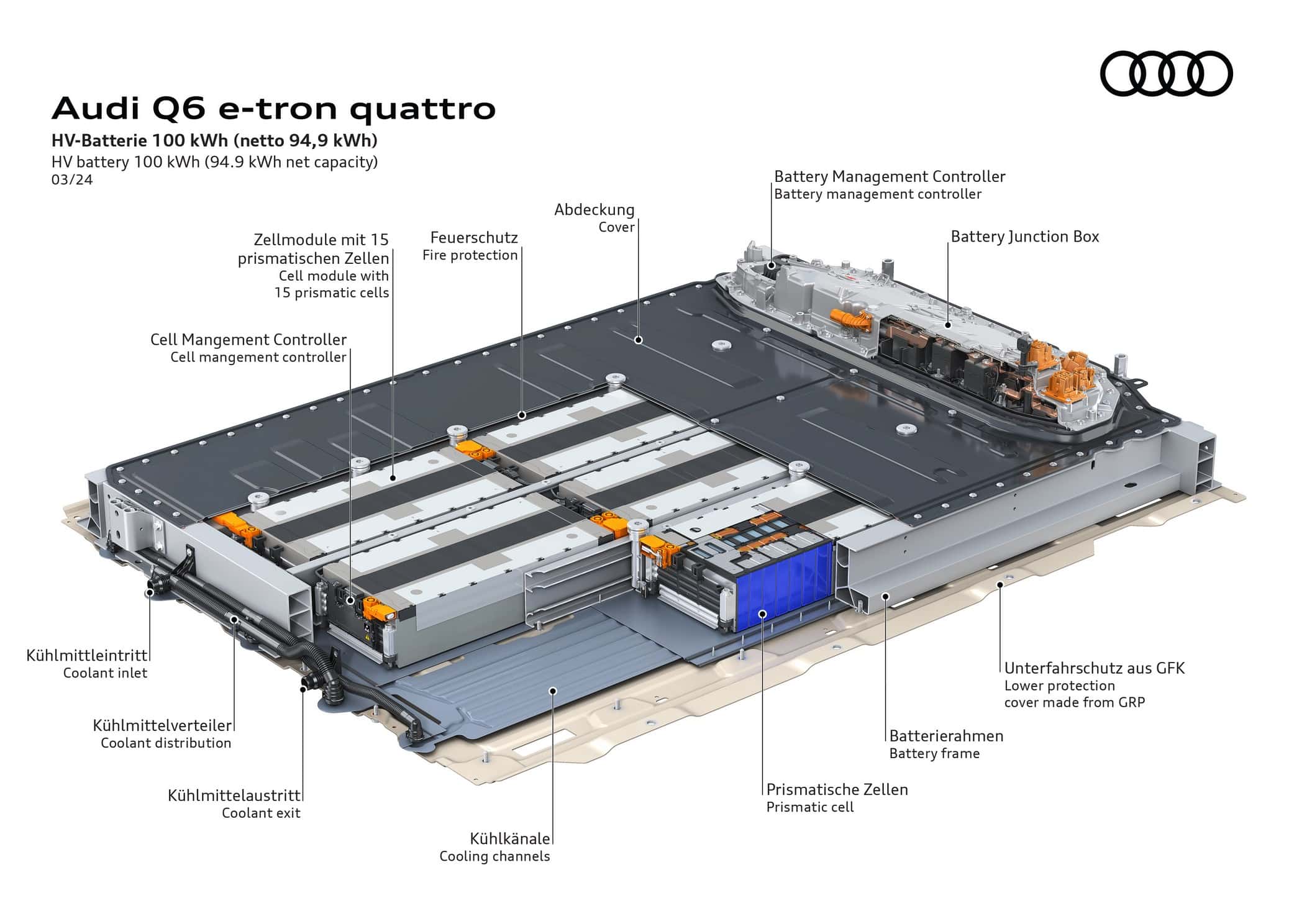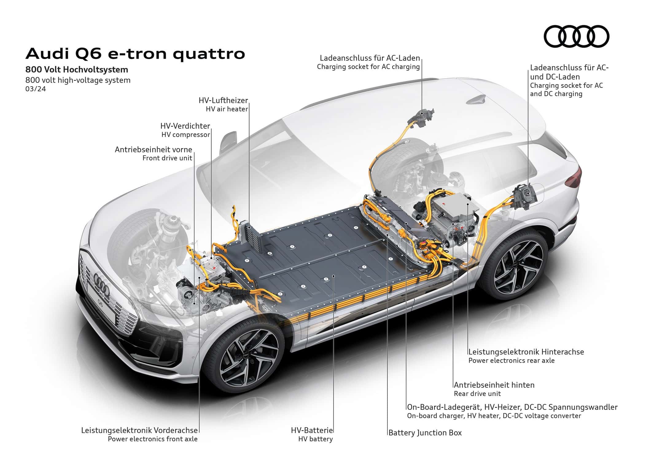 At the heart of the electric SUV from Ingolstadt is a new lithium-ion battery pack that uses prismatic cells instead of the round cells BMW intends to use on the Neue Klasse iX3. The Q6 E-Tron has a usable energy content of 94.9 kWh, good for 388 miles (625 kilometers) on a single charge. Once you’re out of juice, the battery can be charged at up to 270 kW, in which case you’ll get back 158 miles (255 kilometers) of range in 10 minutes. Spending 21 minutes at a charging station that supports the maximum power will replenish the battery from 10% to 80%.