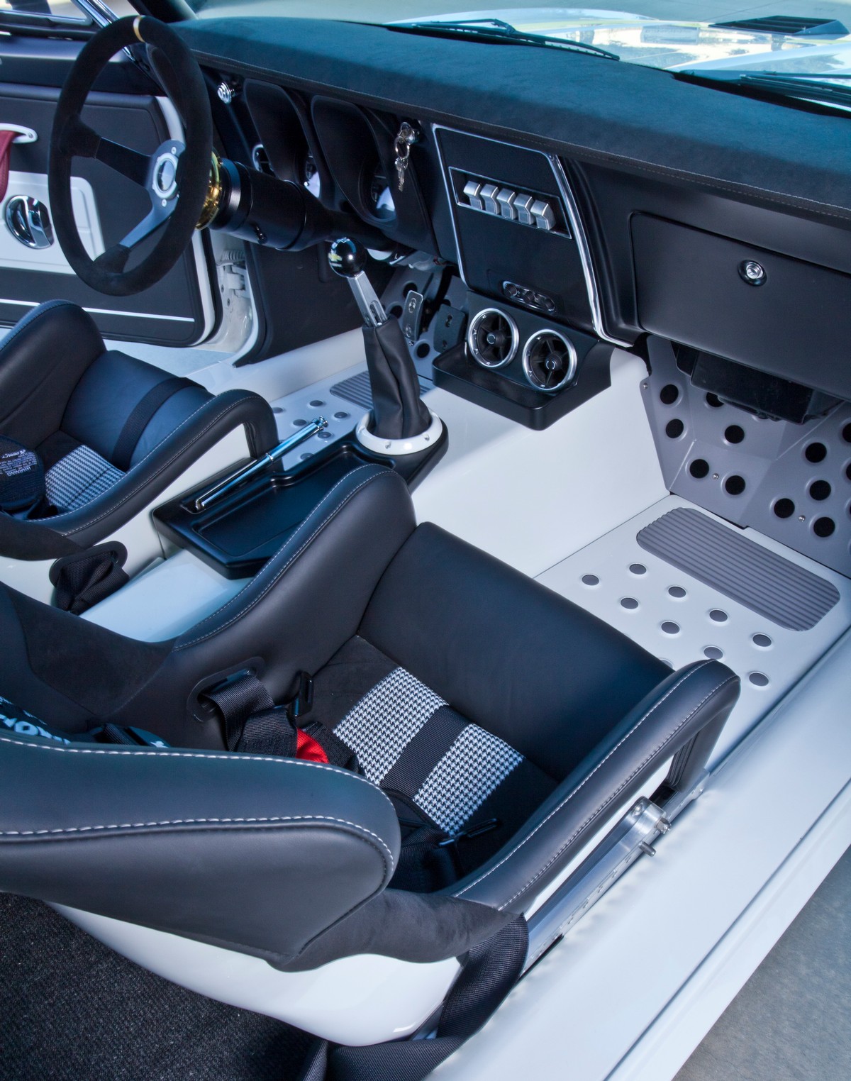 The Camaro’s interior received special attention with carbon fiber Sparco seats, painted and recovered by Sid Chavers, showcasing a distinctive Houndstooth interior design. The interior is right at home on the car show circuit, but it’s all business. The seats are designed to hold you in place during cornering.