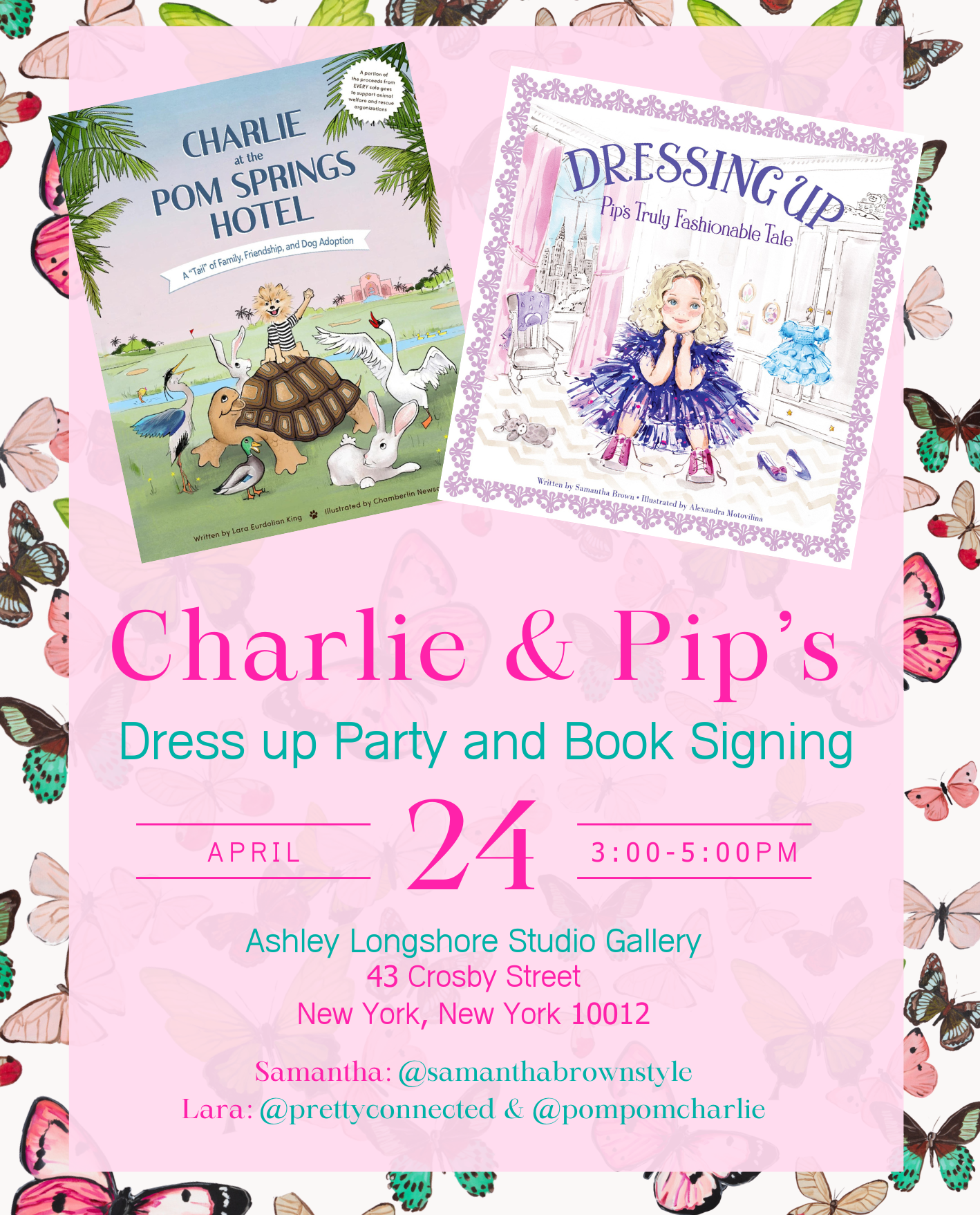 Join Charlie and Pip, the stars of Charlie at the Pom Springs Hotel and Dressing Up by Samantha Brown for a dress up kids party. Tickets include both books, professional portraits in Ashley Longshores Gallery, Pretty Connected accessories bar, where kids can pick out bows, necklaces to take home, Levain Cookies and of course book readings and signings.