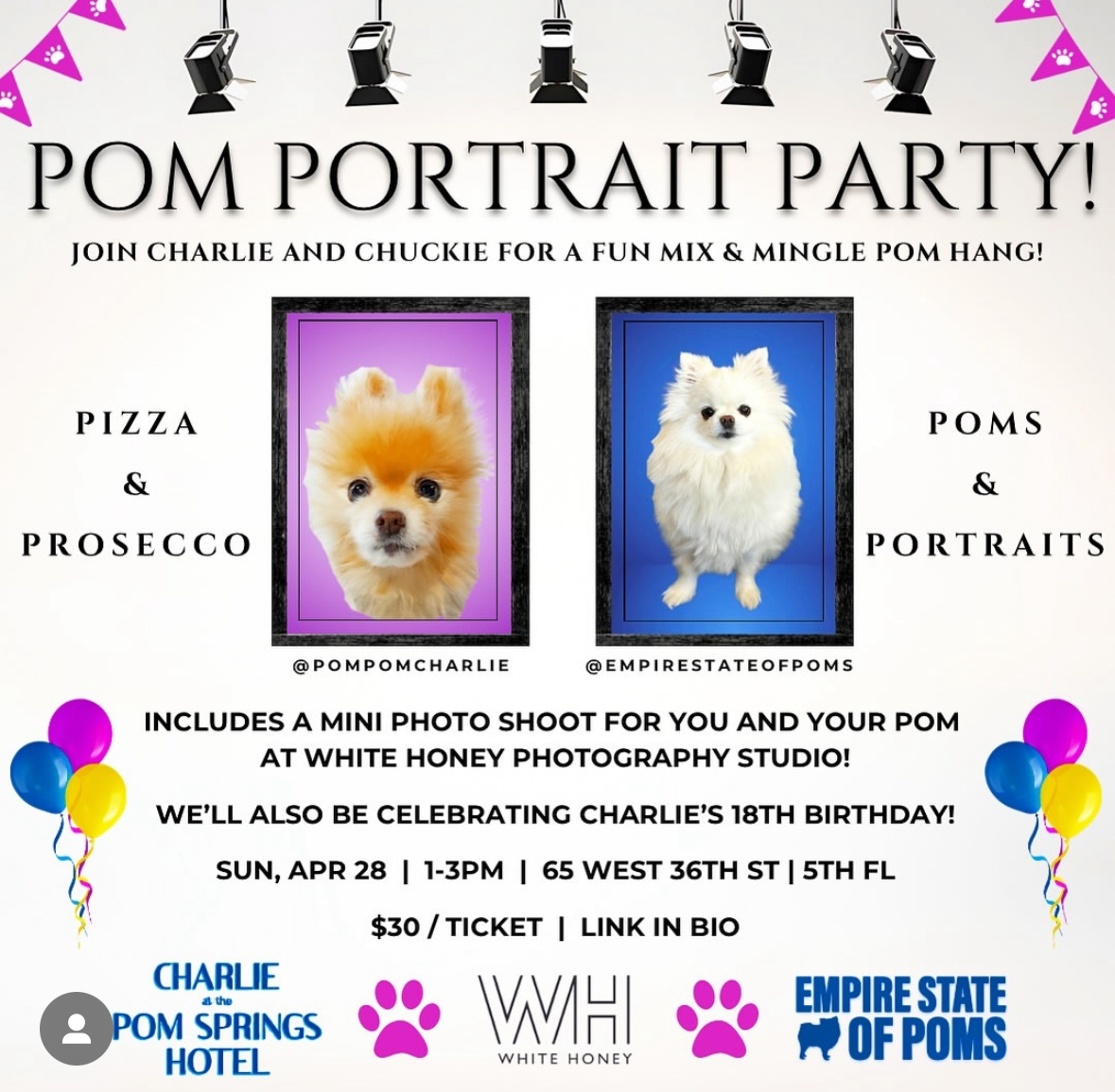 Join Charlie and Chuckie for the Empire State of Poms x Pretty Connected Portraits and Poms event. Tickets include mini photoshoot with your pup at a professional photo studio, plus mix and mingle with other Pom-mom/Dads featuring a Mimosa bar, drinks + Pizza from Williamsburg Pizza.