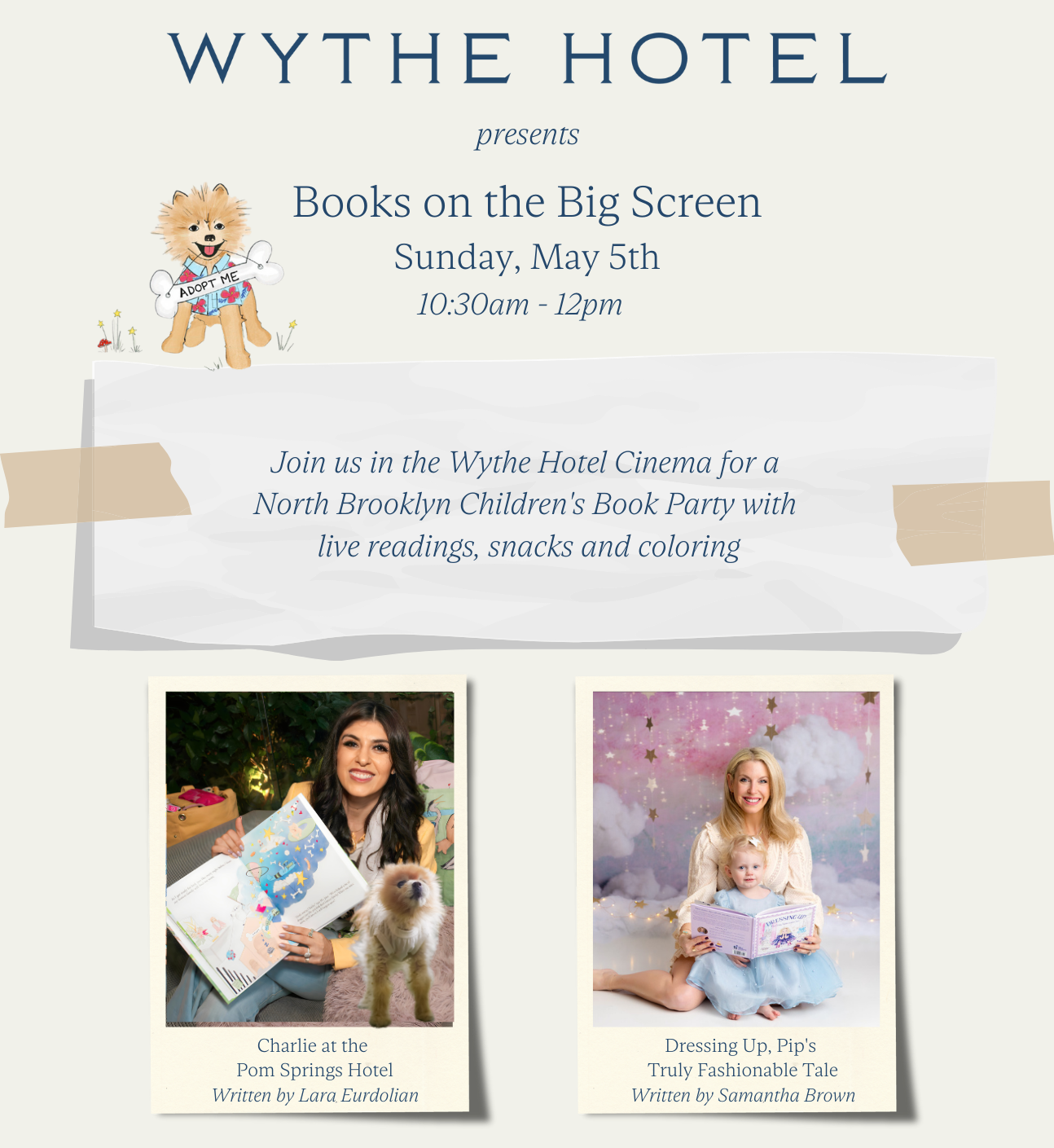 Join Charlie and Pip, the stars of Charlie at the Pom Springs Hotel and Dressing Up by Samantha Brown for a reading of their respective books on the big screen! Enjoy the private screening room where the books will come to life at the theatre. Tickets include signed copies of both books, one adult beverage from Spritz au Crocodile, Tippy Toes snacks and popcorn for the kids. Coloring pages and crayons will also be provided.