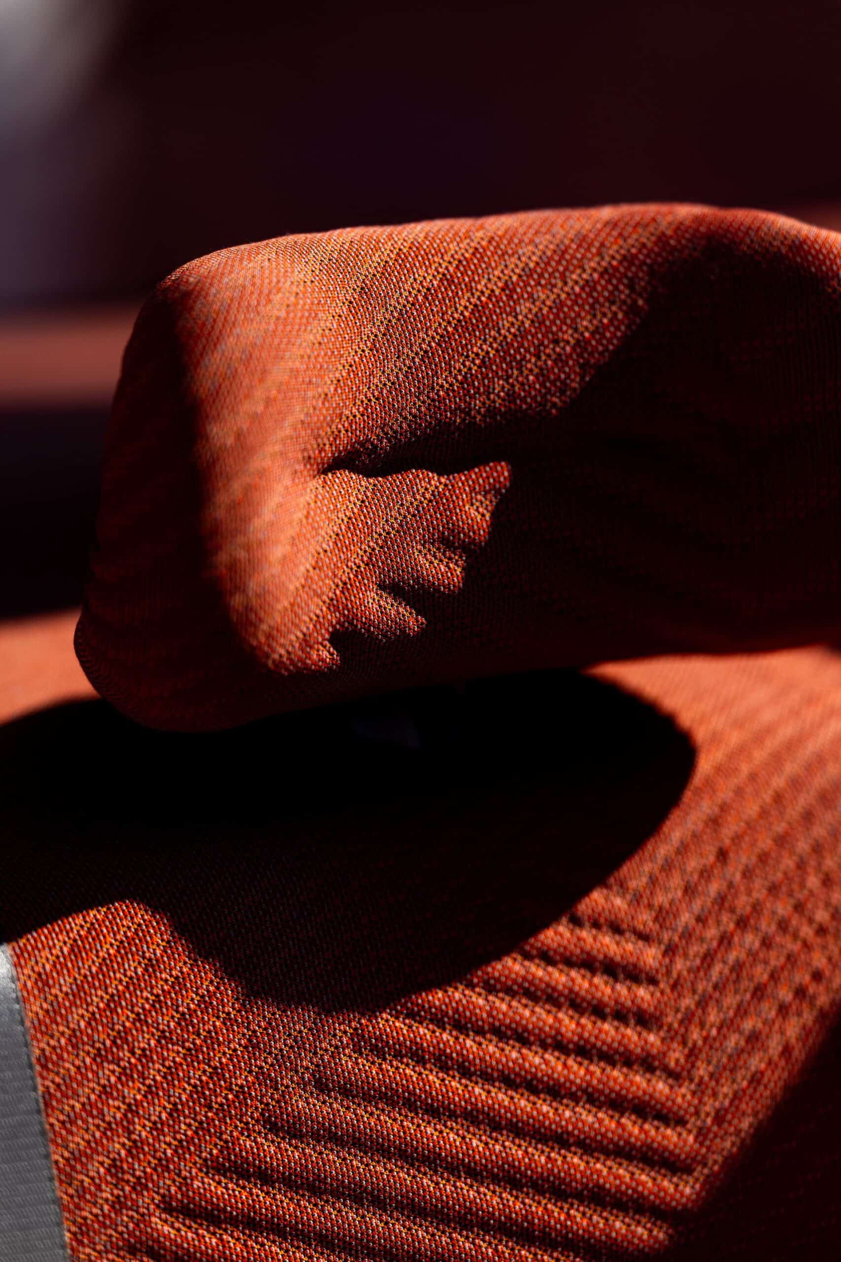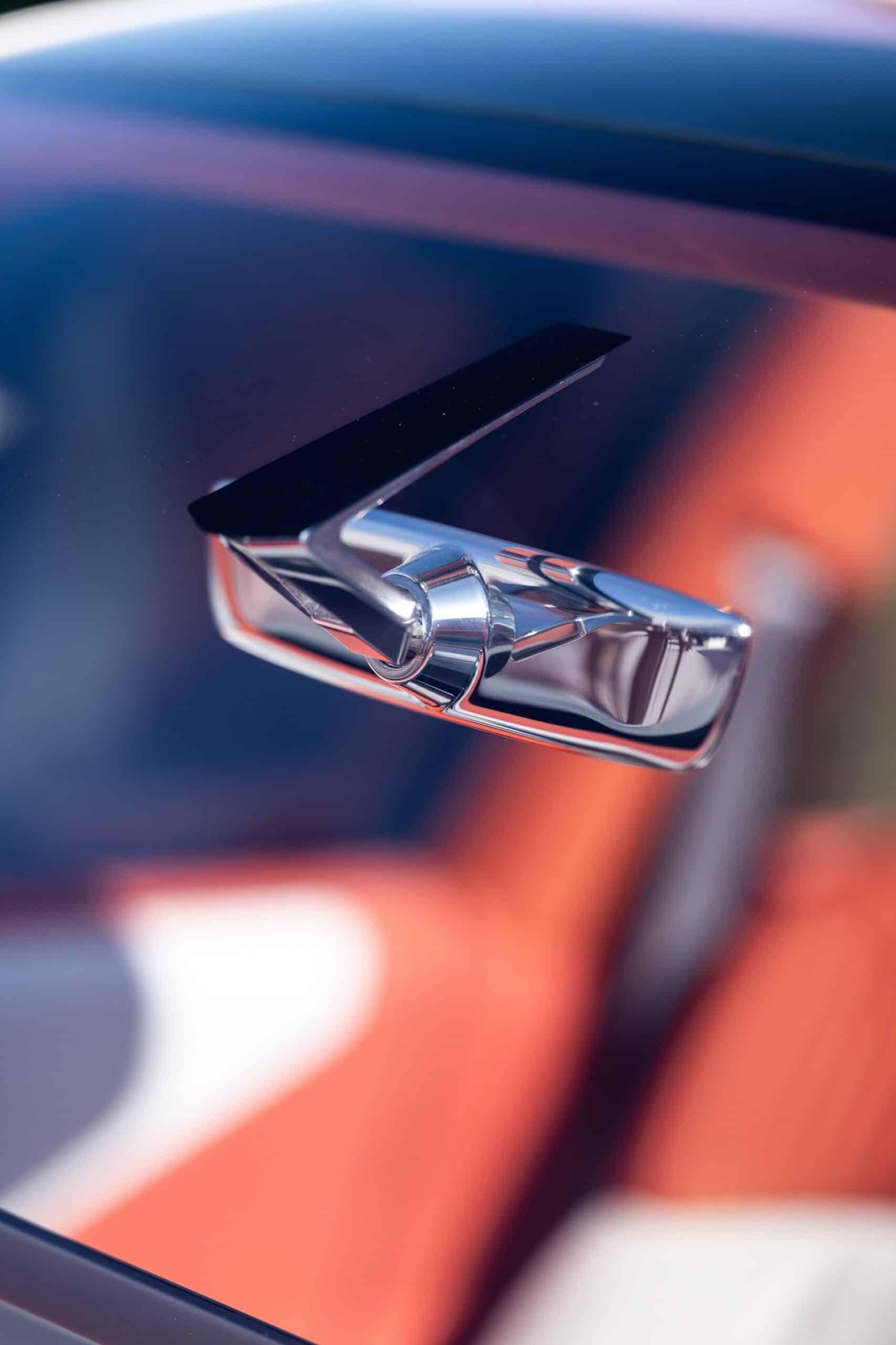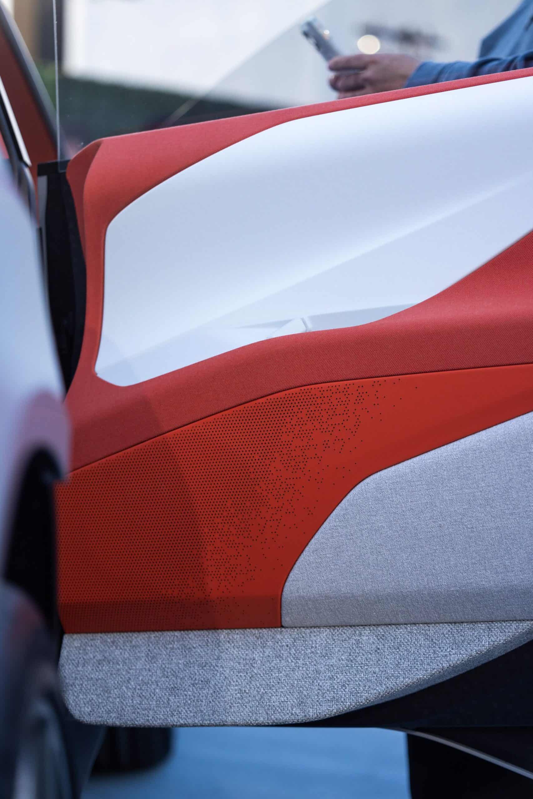 The interior represents an entirely new paradigm shift for the brand. With a focus on sustainability the cabin was adorned with cloth seats and other recyclable material that had a very mid century design reminiscent of car design from the 1950s and 1960s. The orange over tan interior color combination shown was warm and inviting in conjunction with the large windows and glass roof that let in a lot of natural light. There were even color matched pillows in the rear seat similar to the XM.