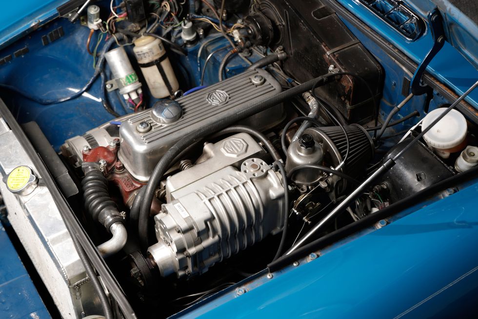 Under the hood is where things get really fun. In 1973, the MGB B-series 4-cylinder produced 79 hp and 94 lb-ft of torque. To boost the output, Moss installed their supercharger system which uses an Eaton roots-style blower setup for 6 psi of boost and a single SU carb. The result is nearly 120 horsepower of top-down fun. Sure, 120 horsepower doesn’t sound like much compared to the hundreds of ponies modern sports cars put out, but consider that the MGB only weighs 1925 lbs, there is a lot of fun to be had. That extra power is kept in line with the Moss 5-speed conversion, which is a bespoke 5-speed manual transmission based on a Miata, redesigned for the MGB. Spent fuel and air is routed to the rear via a stainless steel Tourist Trophy series exhaust, which gives the MGB one of the best sounding exhaust tones in the world. It just sounds fun to drive.