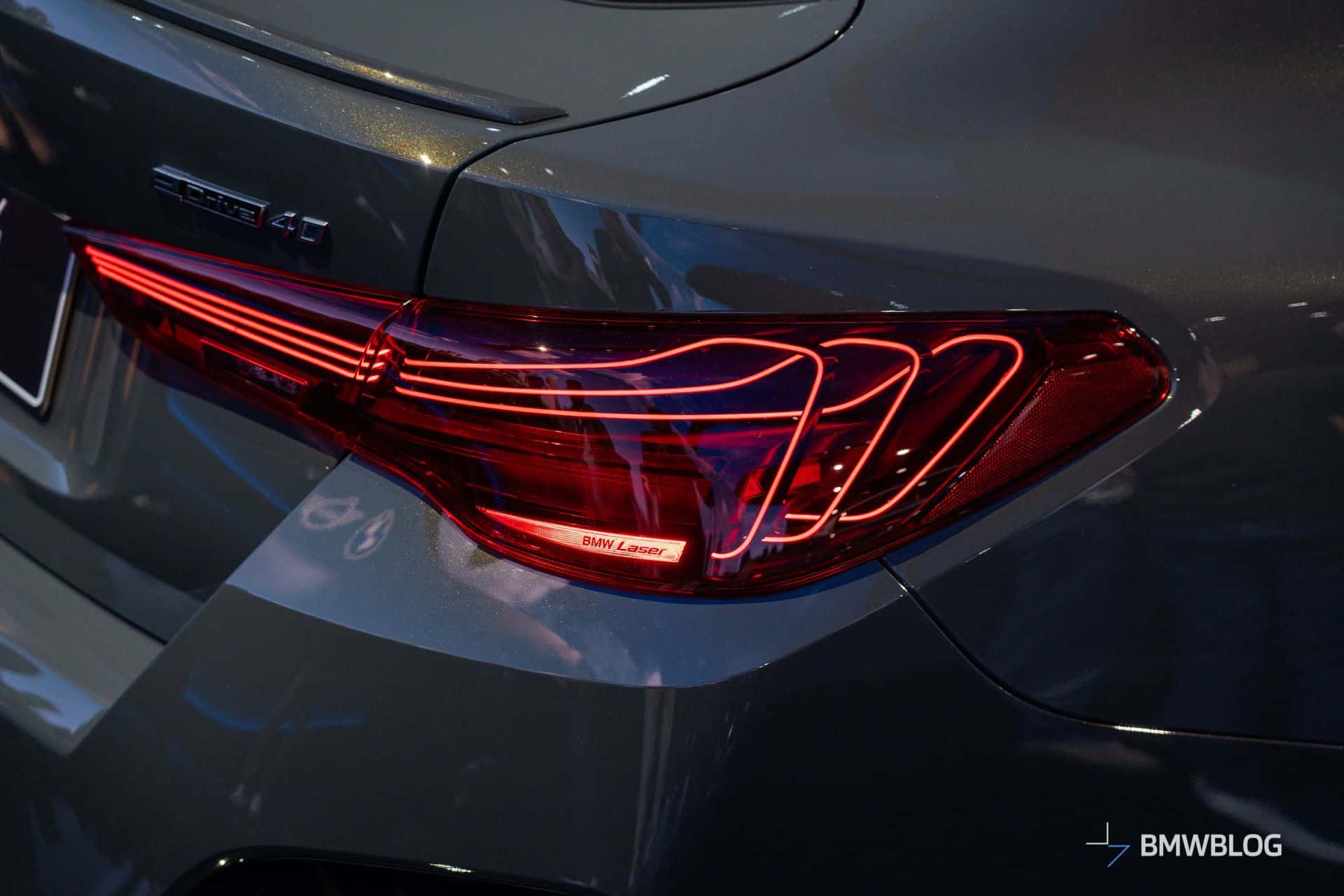 The grille, encased in matte chrome whether or not the M Sport Package is selected, is paired with new, sharper headlights featuring arrow-shaped daytime running lights. The advanced headlight configuration moves away from laser technology, opting instead for adaptive LED lights with matrix high-beam functionality, highlighted by blue accents. Similarly, models equipped with premium front lights also boast laser taillights, akin to those on the two-door 4 Series.
