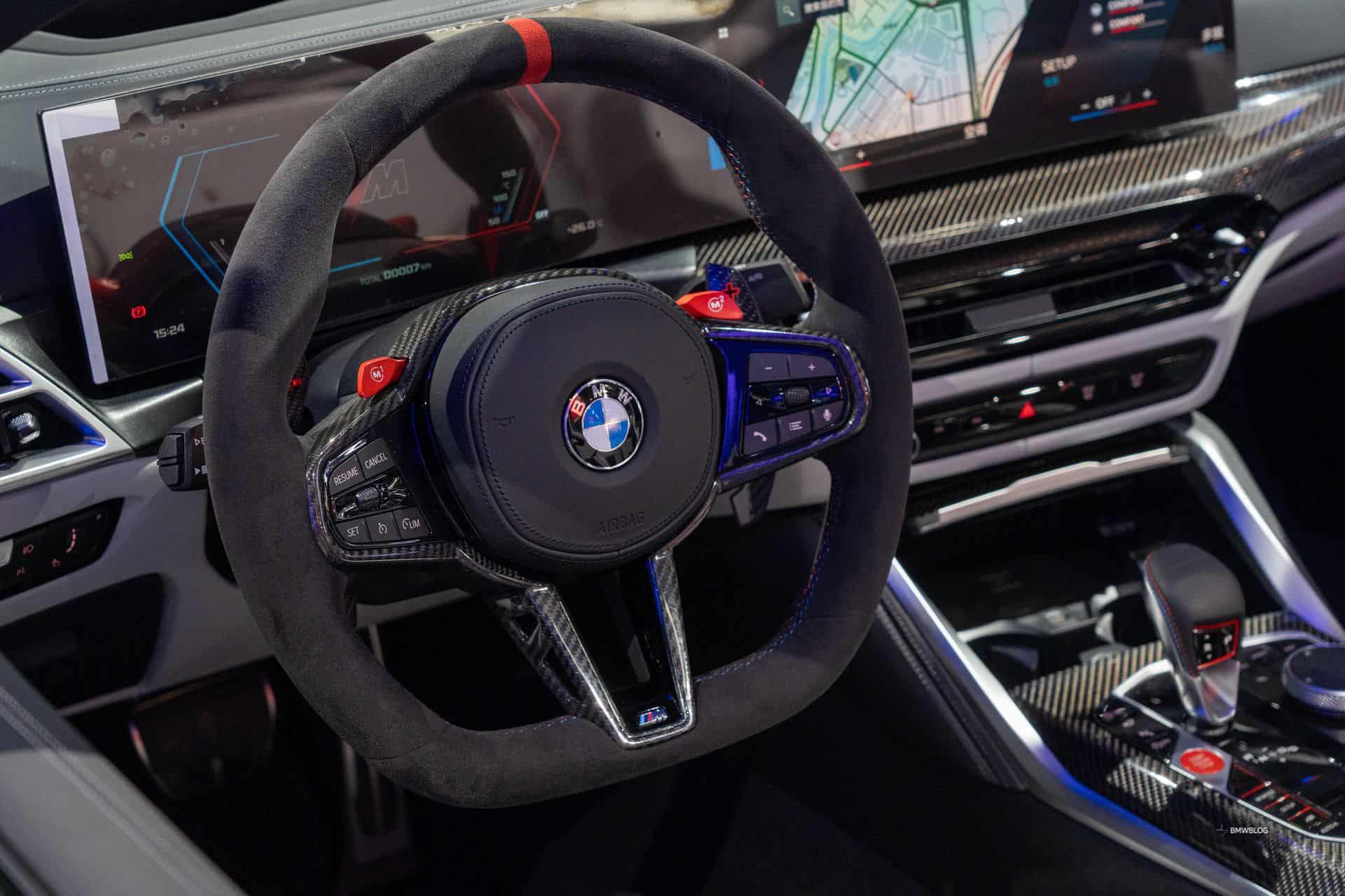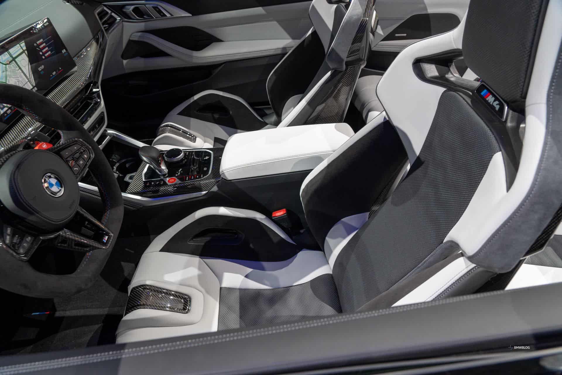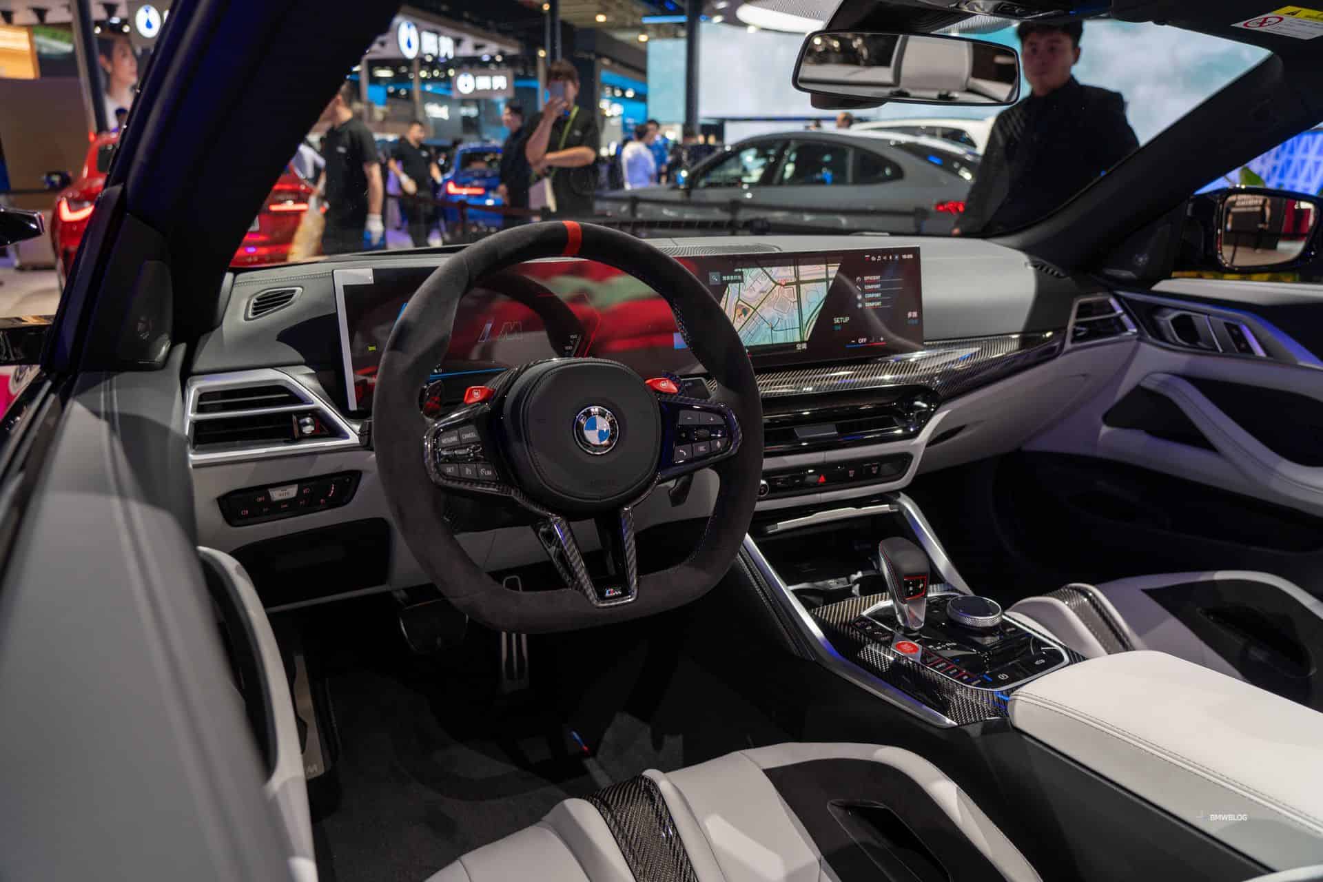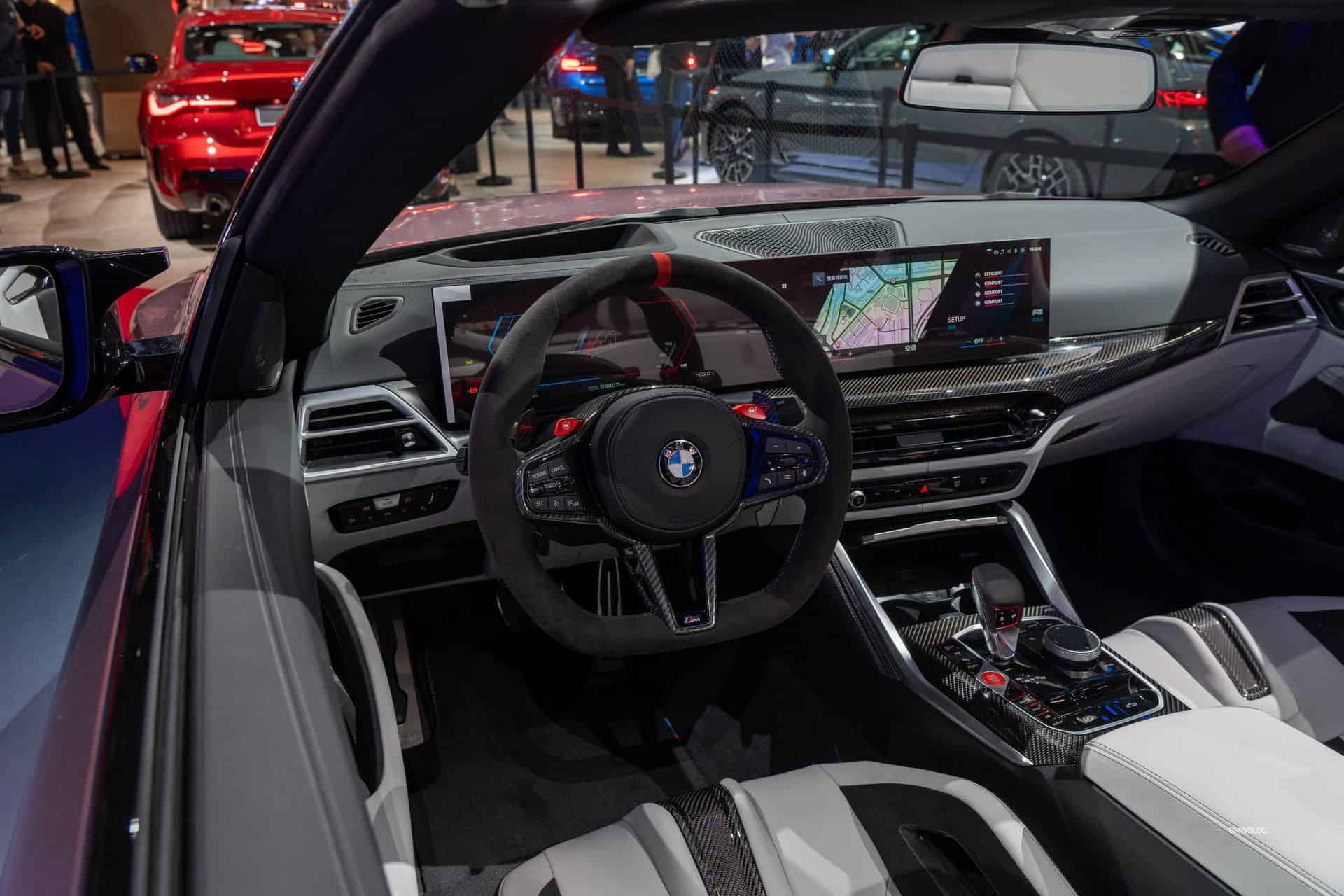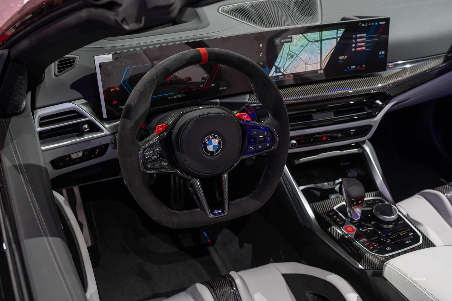 Inside, the M4 Convertible Facelift offers a new perspective. The flat-bottomed steering wheel with a 12 o’clock marker and the Dark Graphite interior trim replace the previous Aluminum Rhombicle Anthracite, providing a sleek and modern cabin feel. The ambient lighting now extends to the central air surrounds, adding a touch of sophistication to the cabin.