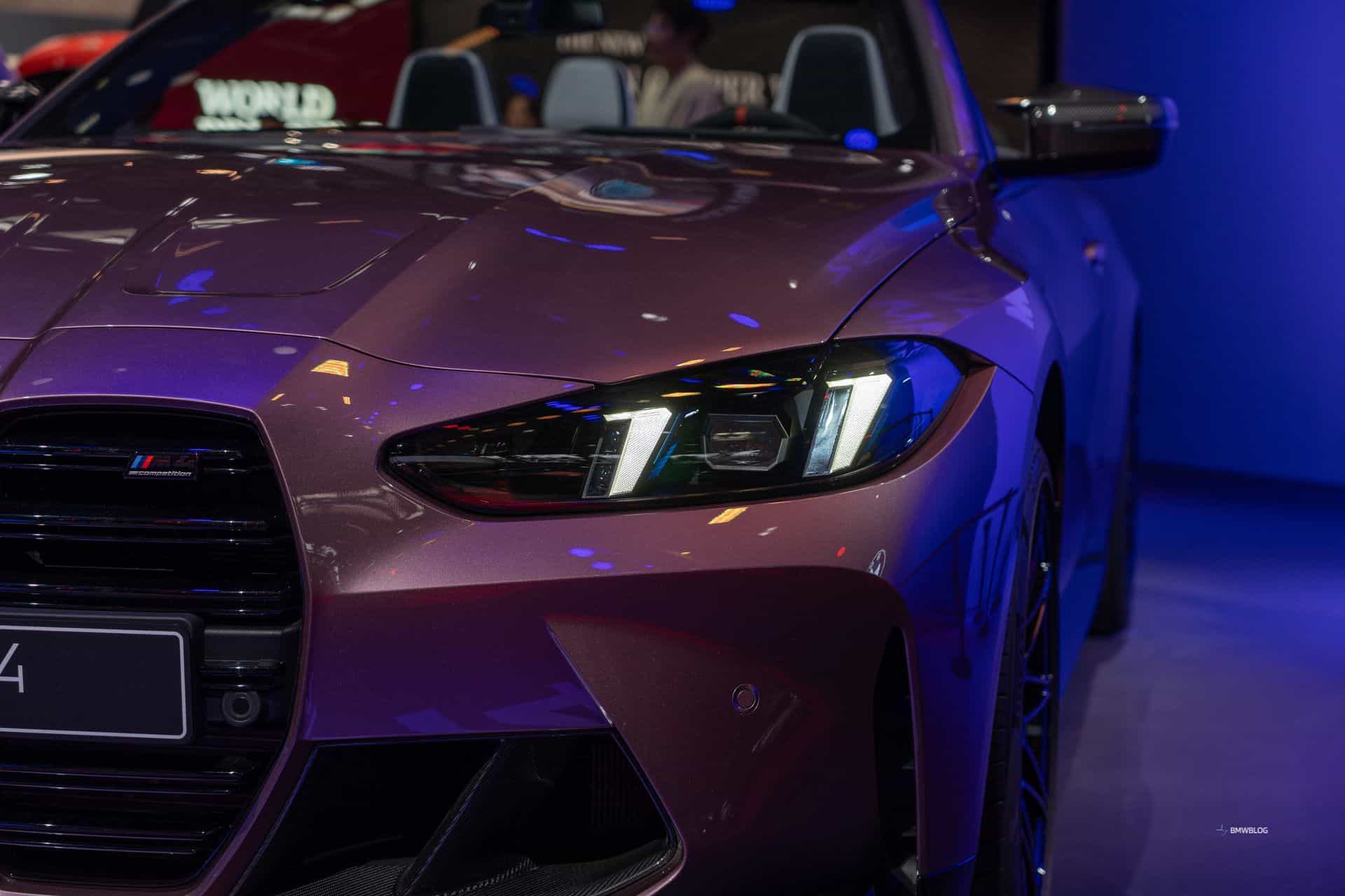 This 2025 BMW M4 Convertible Facelift is painted in the beautiful Velvet Orchid II color which enhances the sporty and premium looks of the open-top. Furthermore, the M4 LCI brings a sharper and more modern look to the table. The most noticeable changes are the new headlights and taillights, which have been redesigned to give the car a fresher appearance. This update introduces two arrow-shaped elements that function as the daytime running lights and turn signals, offering a more aggressive front fascia. The laser taillights are certainly the highlight resembling the ones in the BMW M4 CSL. The introduction of new alloy wheels, Style 825 M, adds to the vehicle’s sporty profile, especially when paired with the vibrant red calipers.