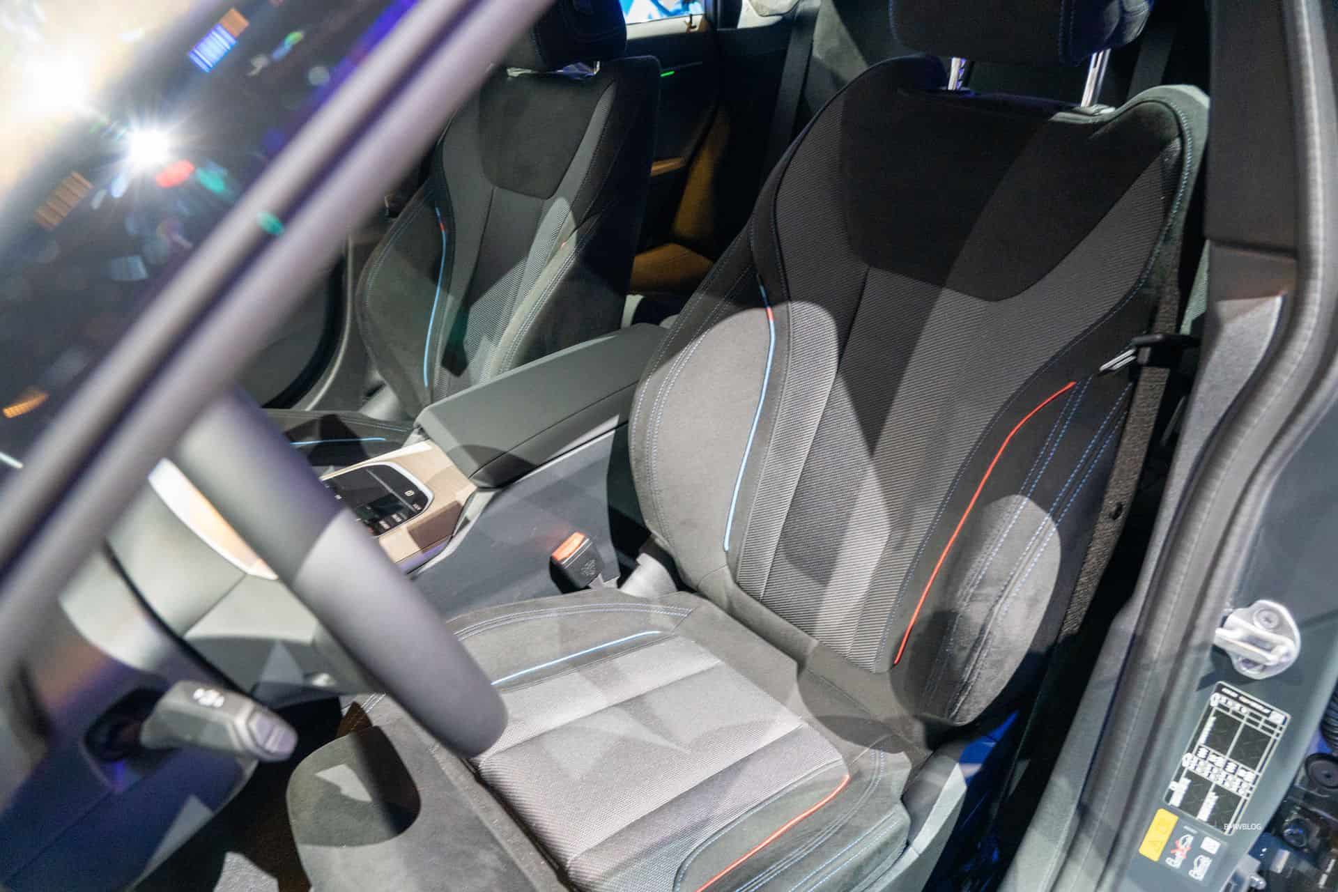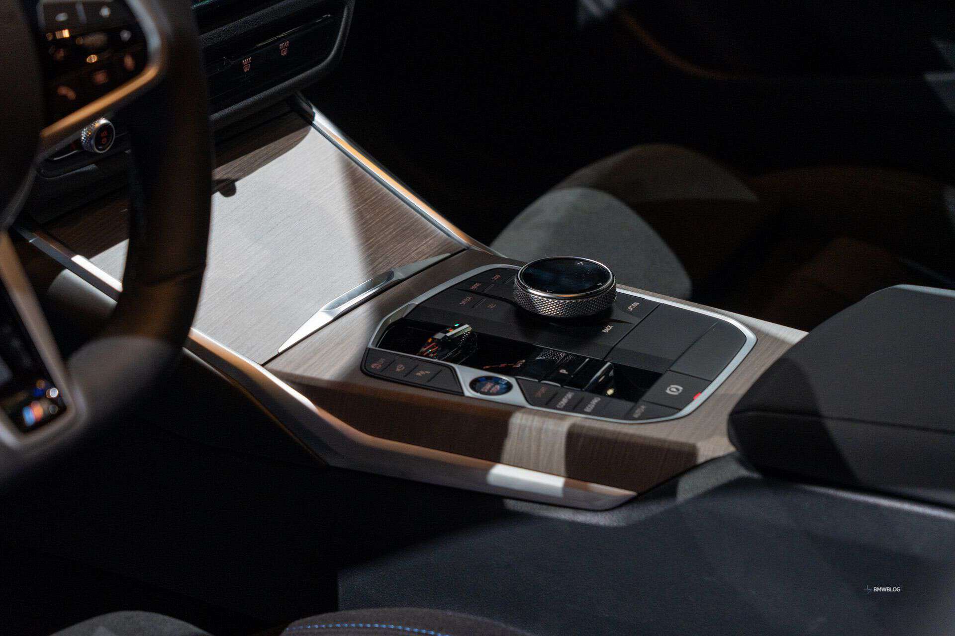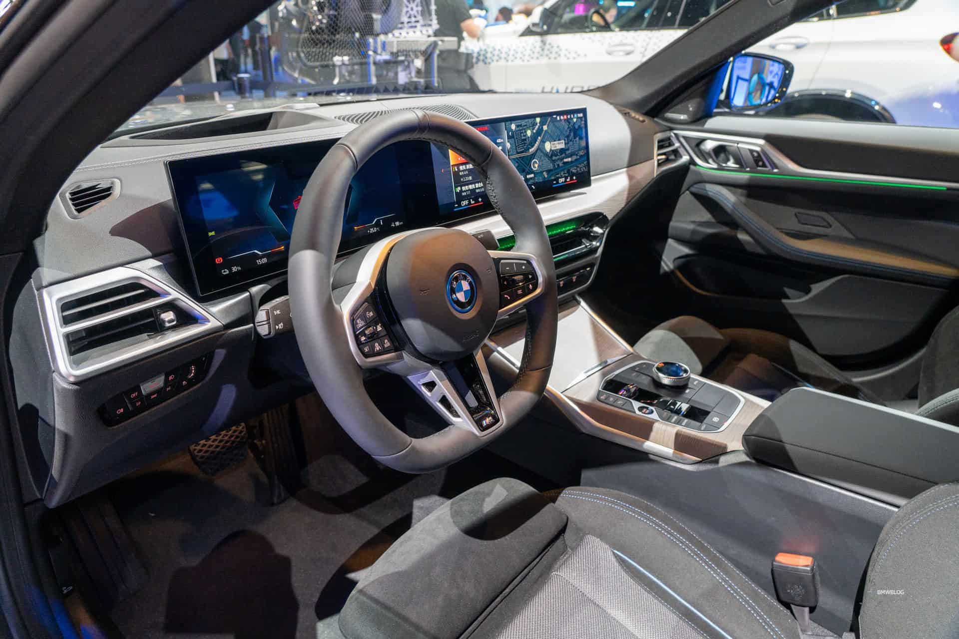 We were allowed to take snapshots of the mildly updated i4 interior where the new flat-bottomed steering wheel calls home. The seats are wrapped in what BMW calls M PerformTex in black with M-colored piping. If you’re wondering about the trim on the dashboard, it’s the Fineline Light open-pored wood. It extends onto the center console to liven up the cabin.