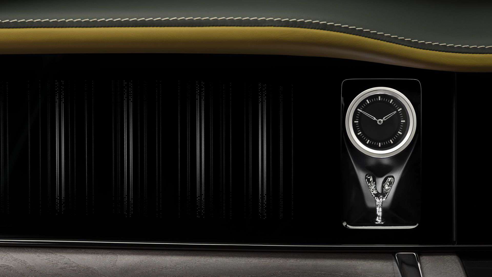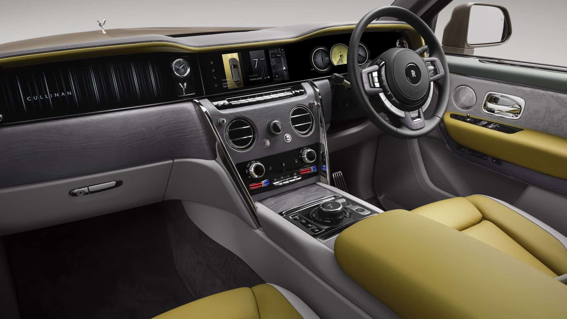 Stepping inside, the opulent cabin looks instantly familiar. However, there are some changes if you know where to look. The new Cullinan eschews the old instrument cluster in favor of the digital driver’s display installed in the Spectre electric coupe. RR’s iconic Spirit of Ecstasy figurine now adorns the dashboard by sitting below the analog clock.