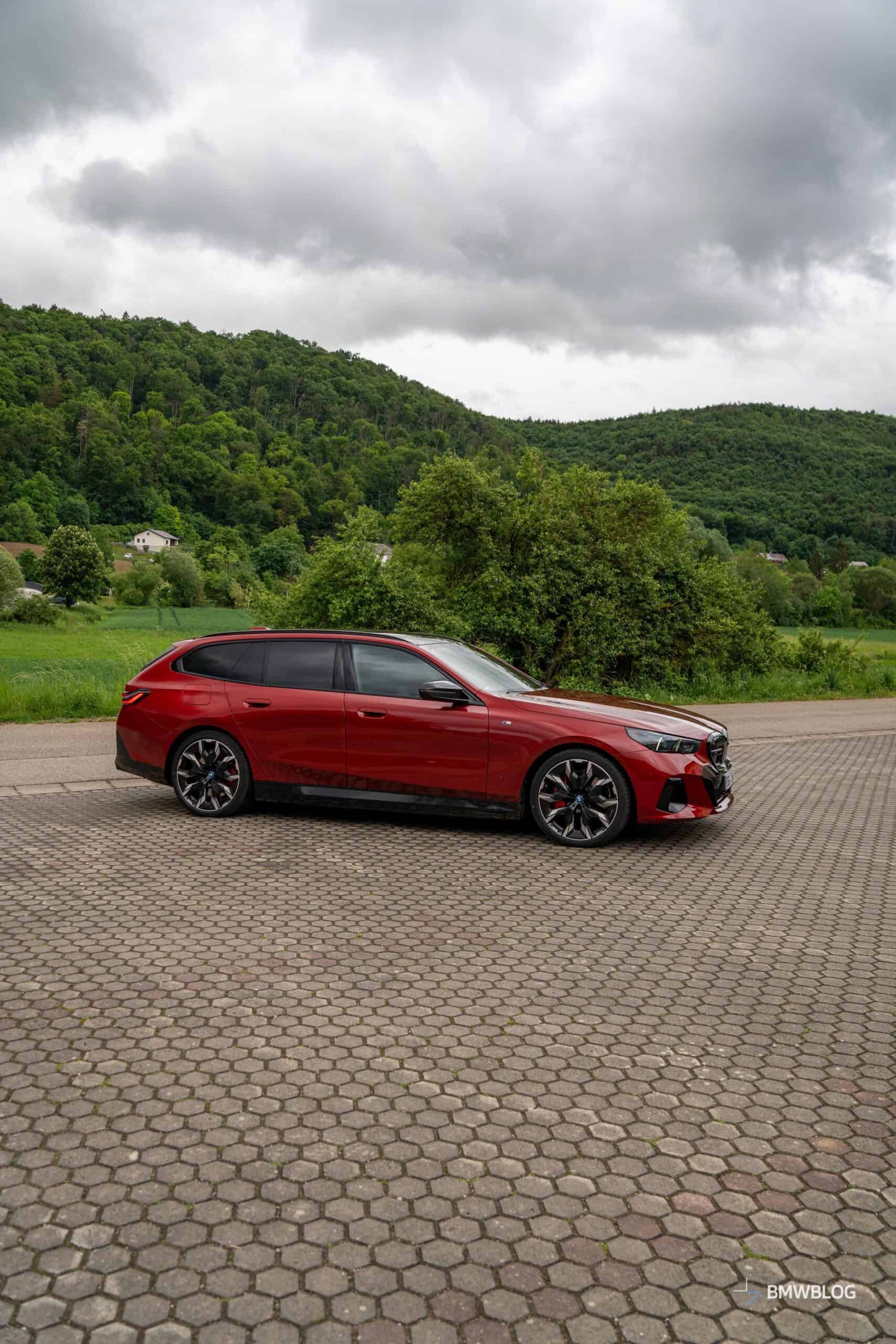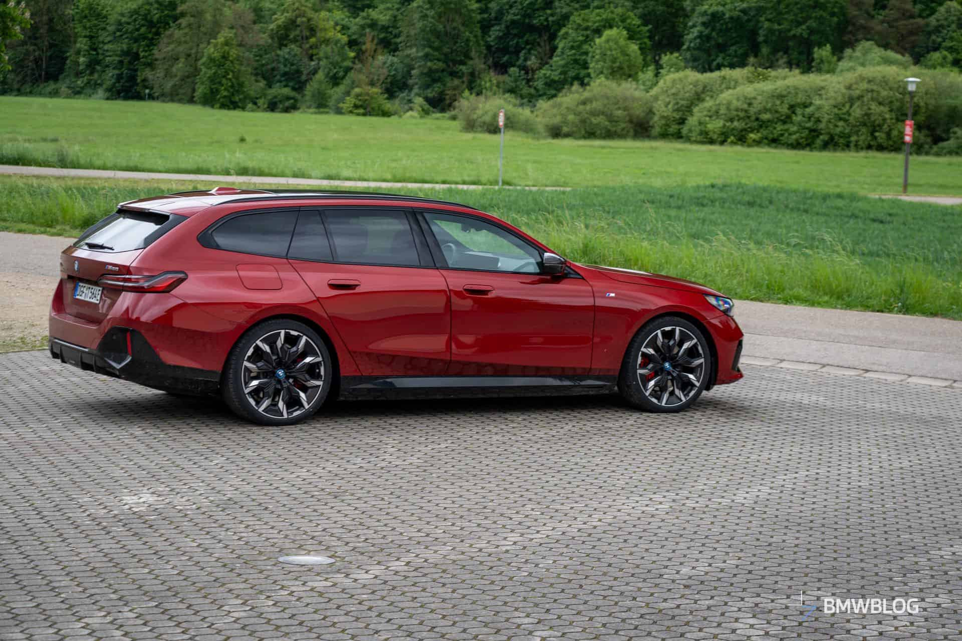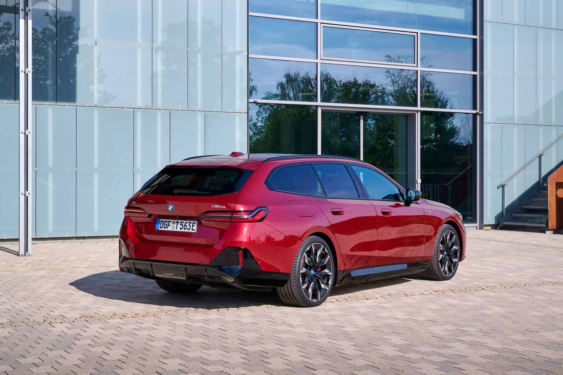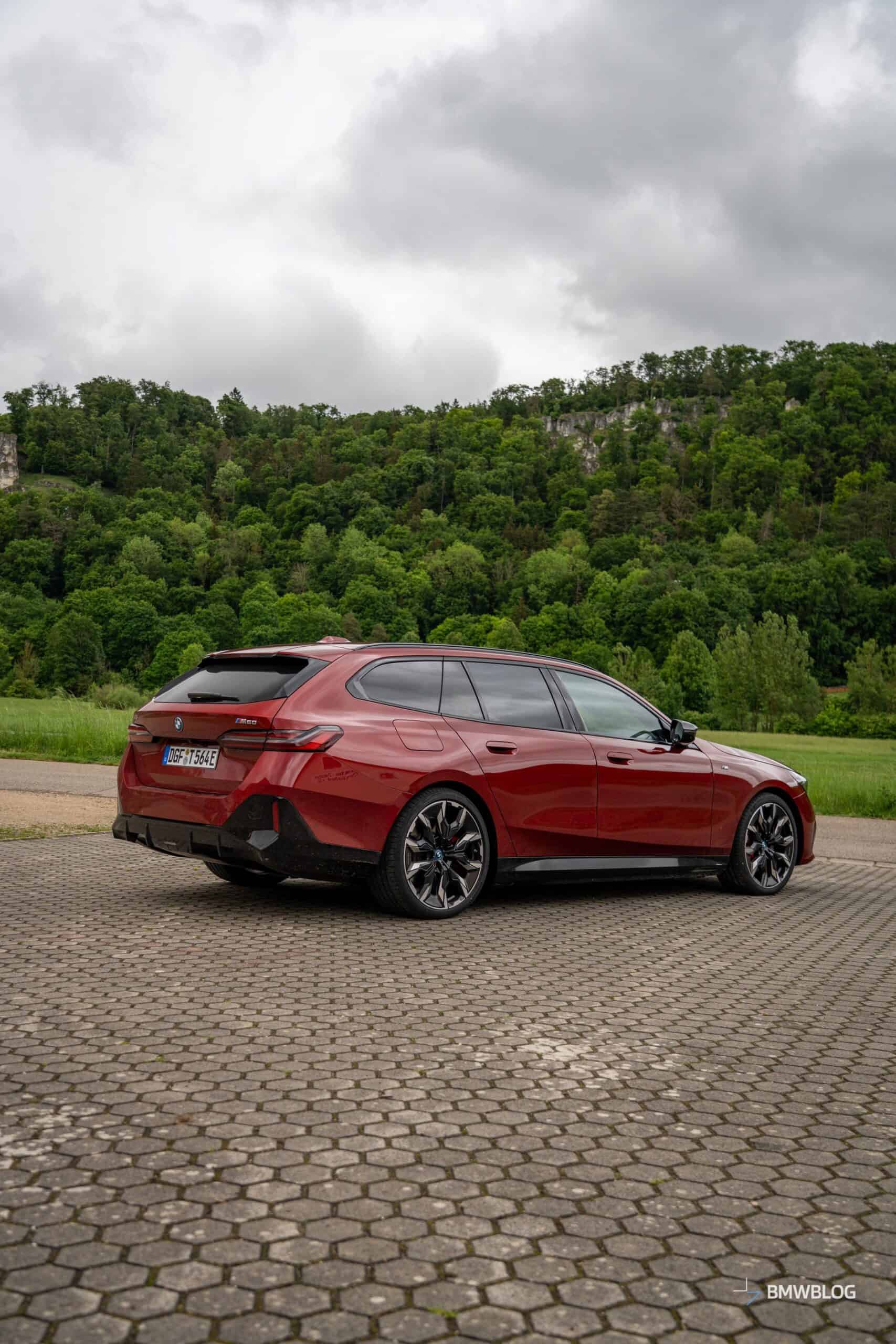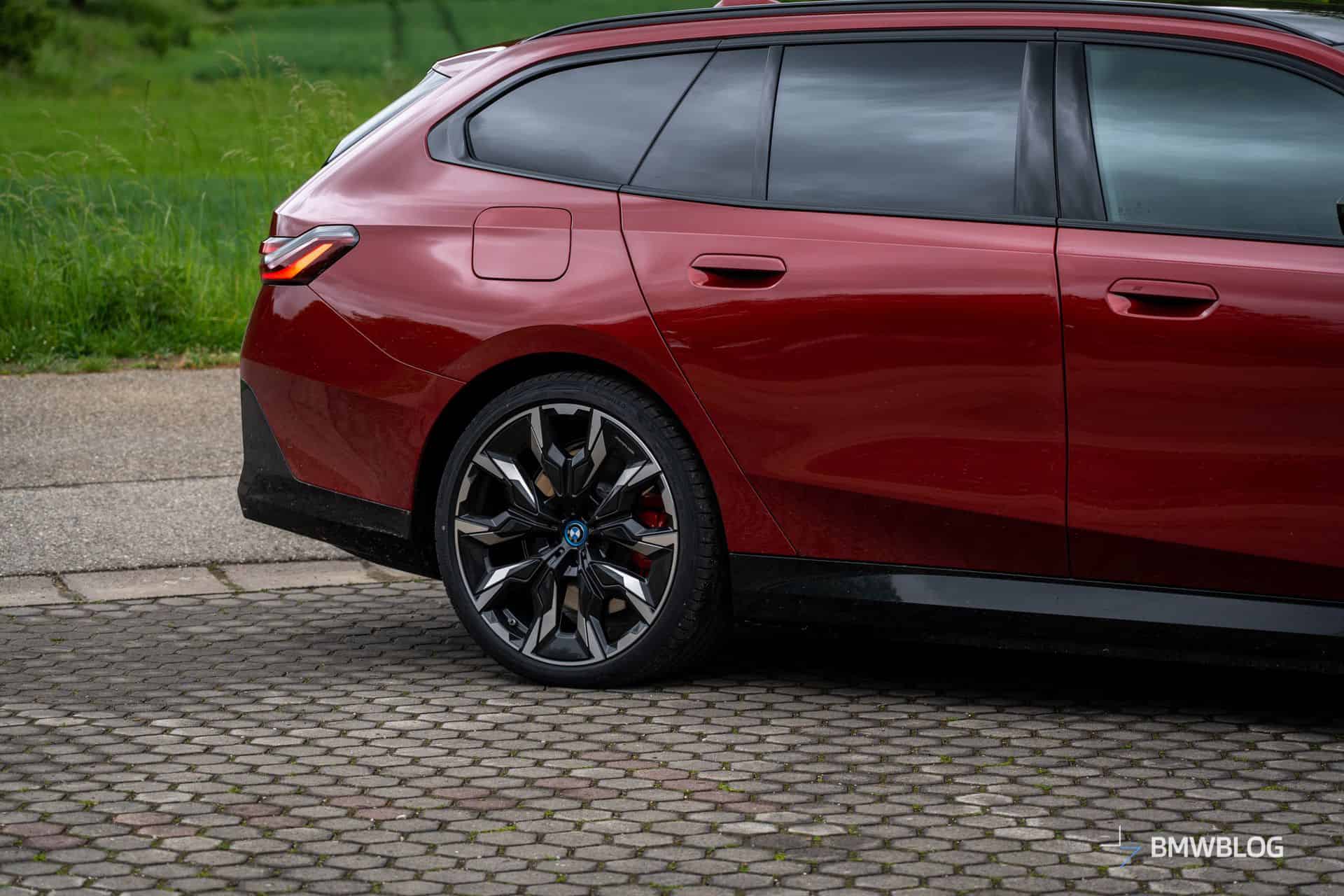 This i5 M60 xDrive Touring is painted in Fire Red, which is identical to the Vegas Red hue offered in the United States where the G61 is sadly not offered. The car we photographed has the largest wheels available for the sixth-generation 5er wagon. It’s a 21-inch aerodynamic set with a two-tone finish and carrying the “954i” codename. While the brake calipers are finished in red, customers can also have them in blue at no extra charge.