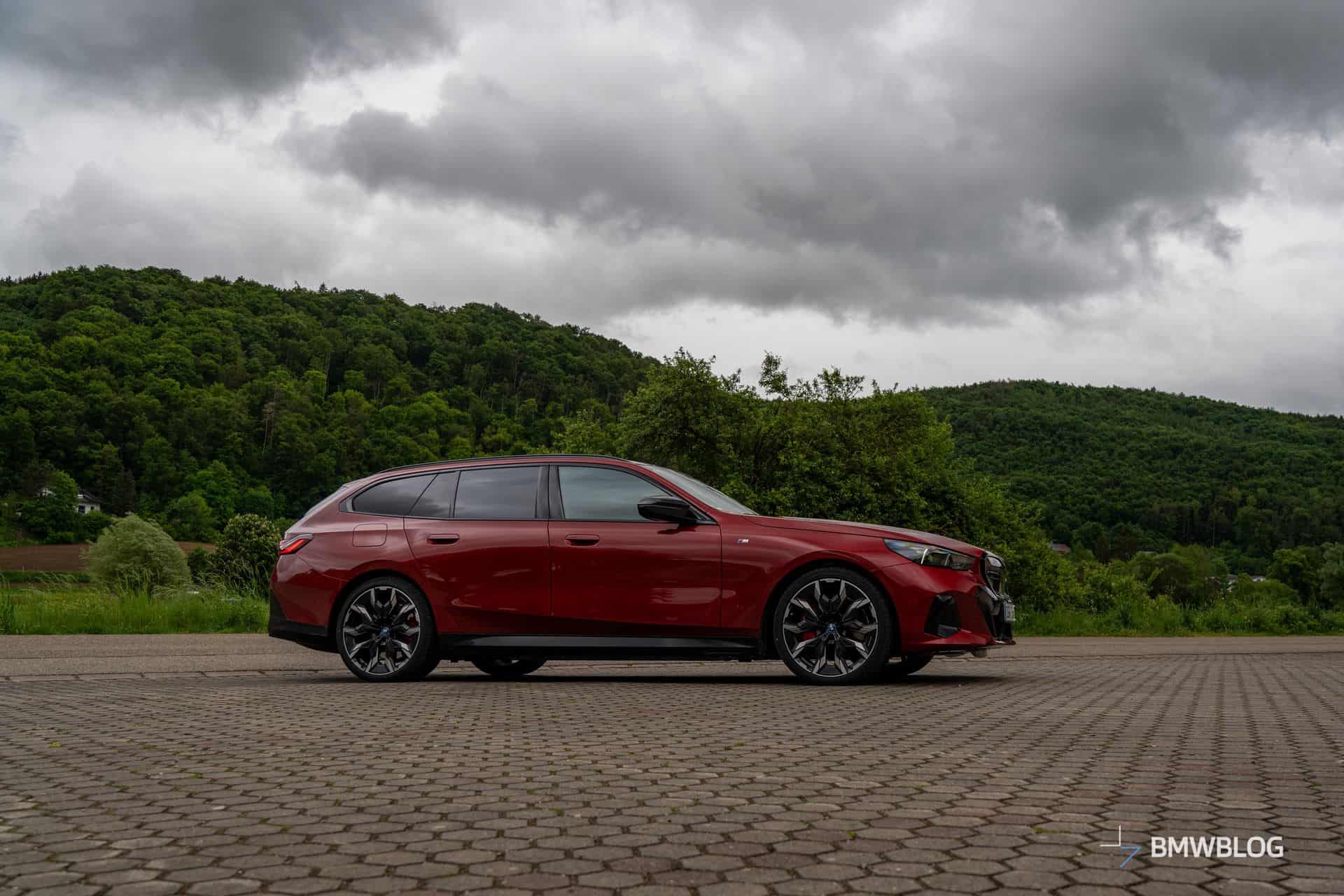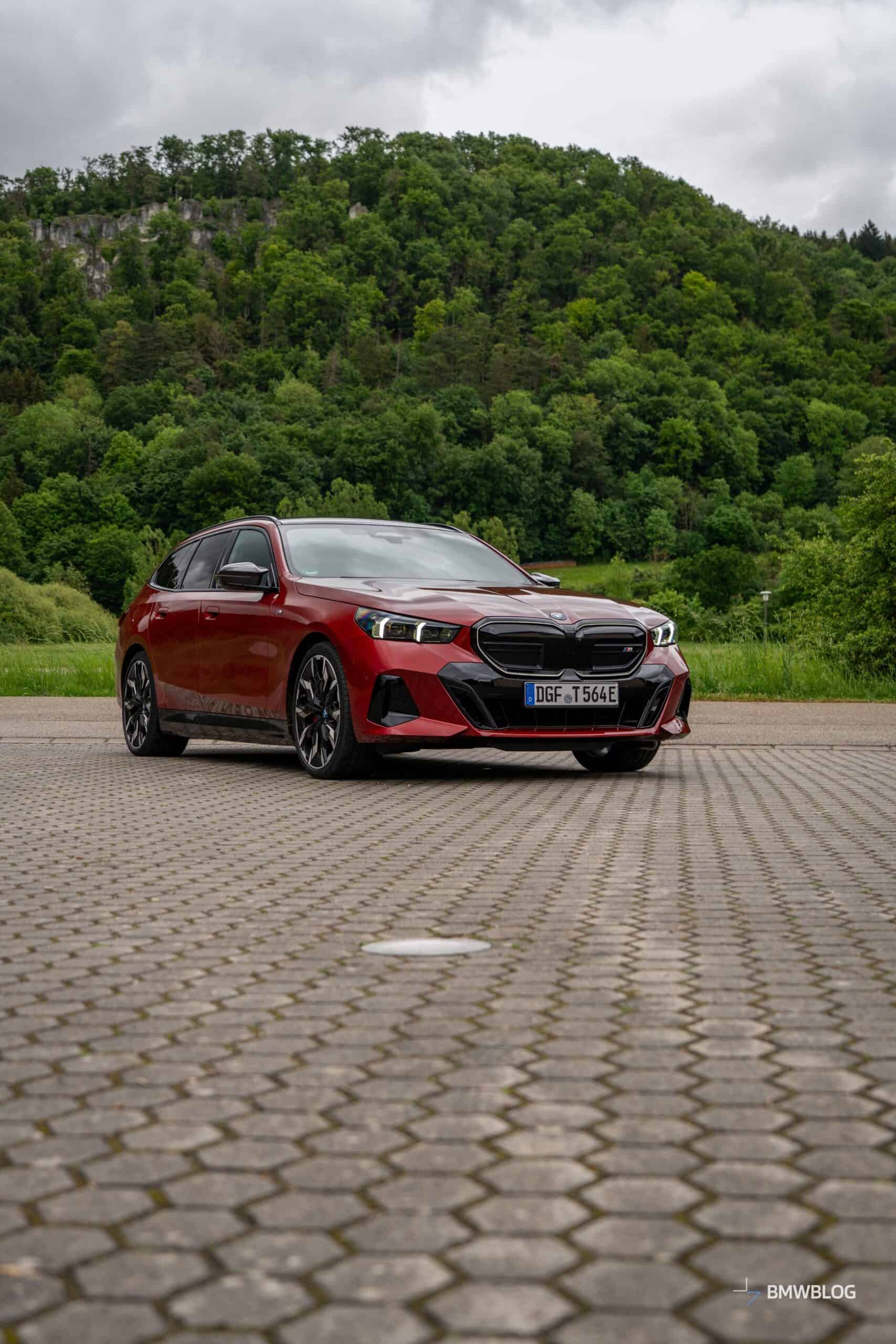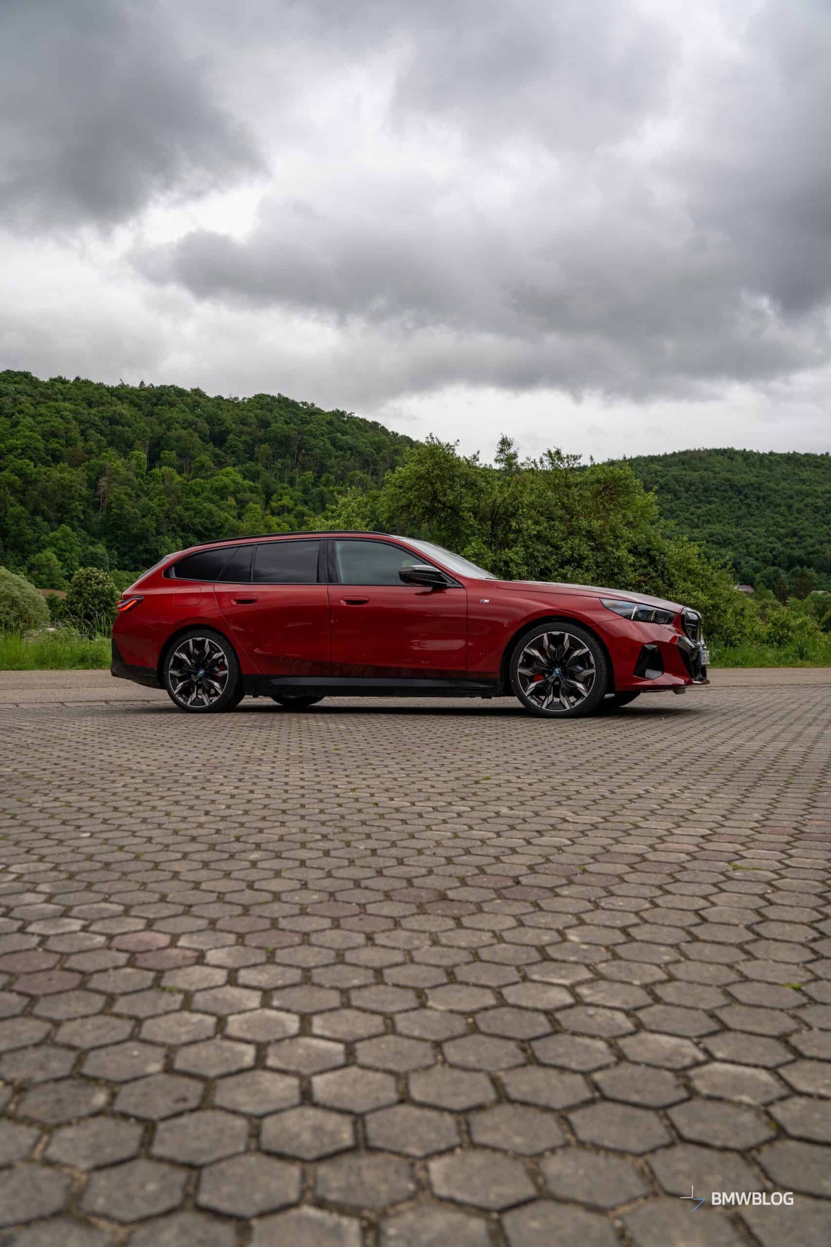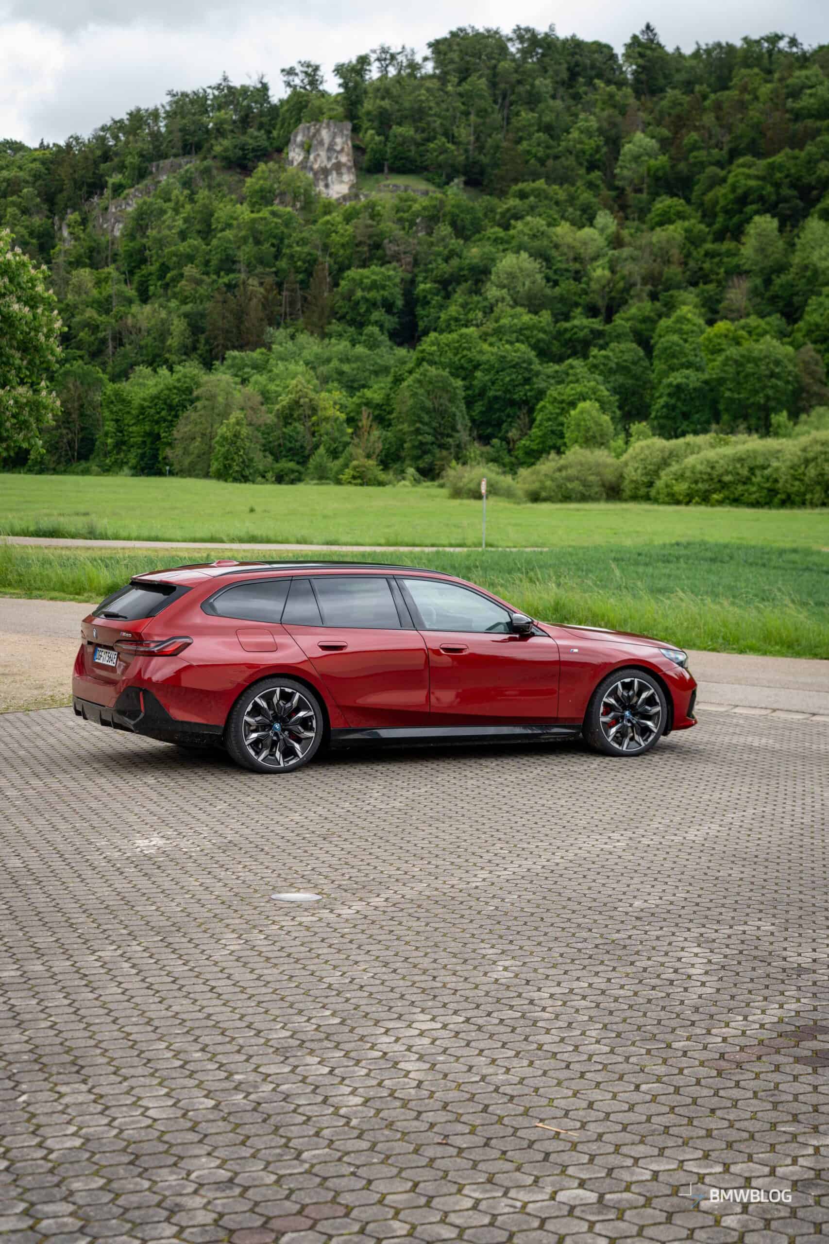 This i5 M60 xDrive Touring is painted in Fire Red, which is identical to the Vegas Red hue offered in the United States where the G61 is sadly not offered. The car we photographed has the largest wheels available for the sixth-generation 5er wagon. It’s a 21-inch aerodynamic set with a two-tone finish and carrying the “954i” codename. While the brake calipers are finished in red, customers can also have them in blue at no extra charge.