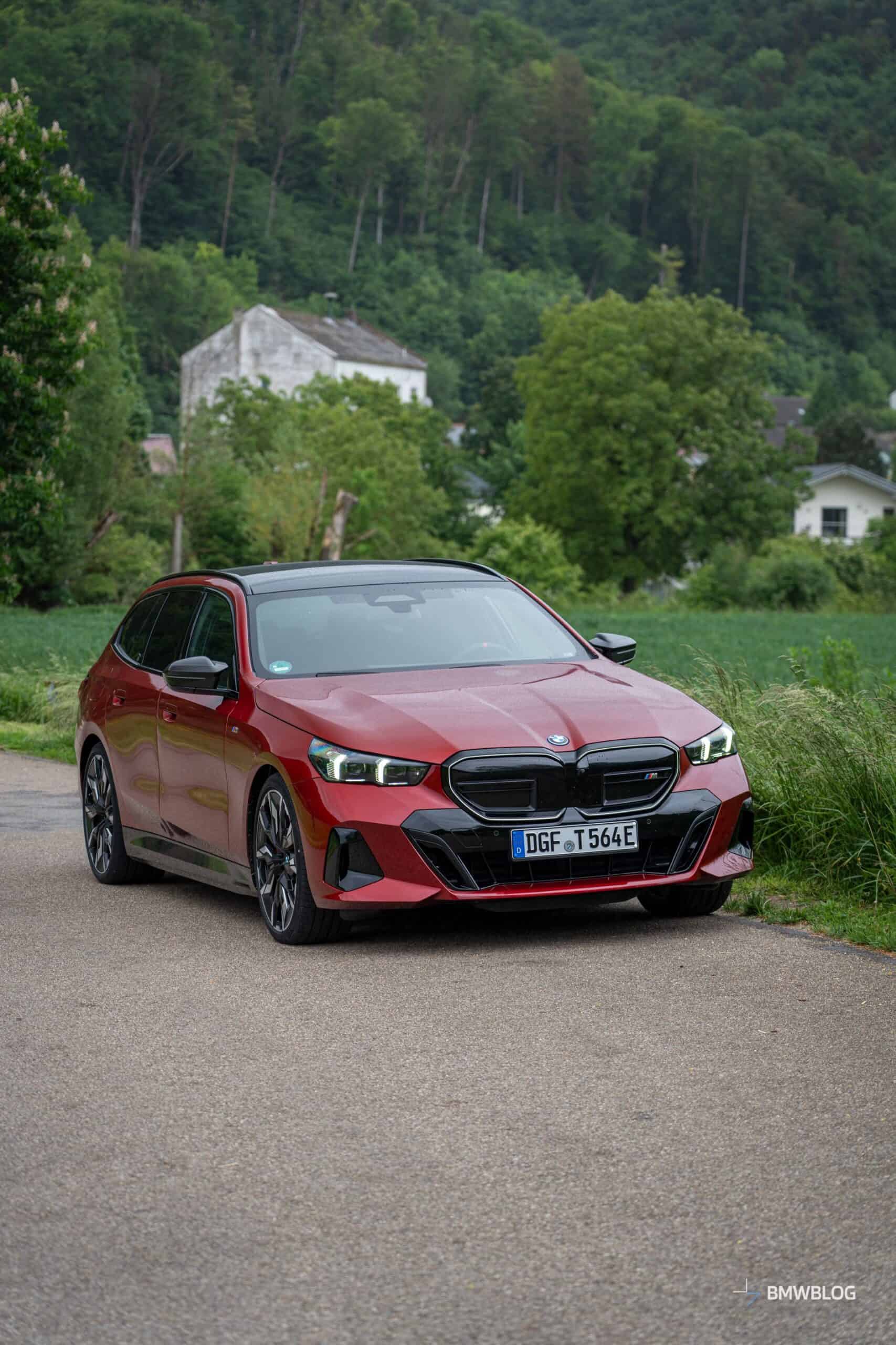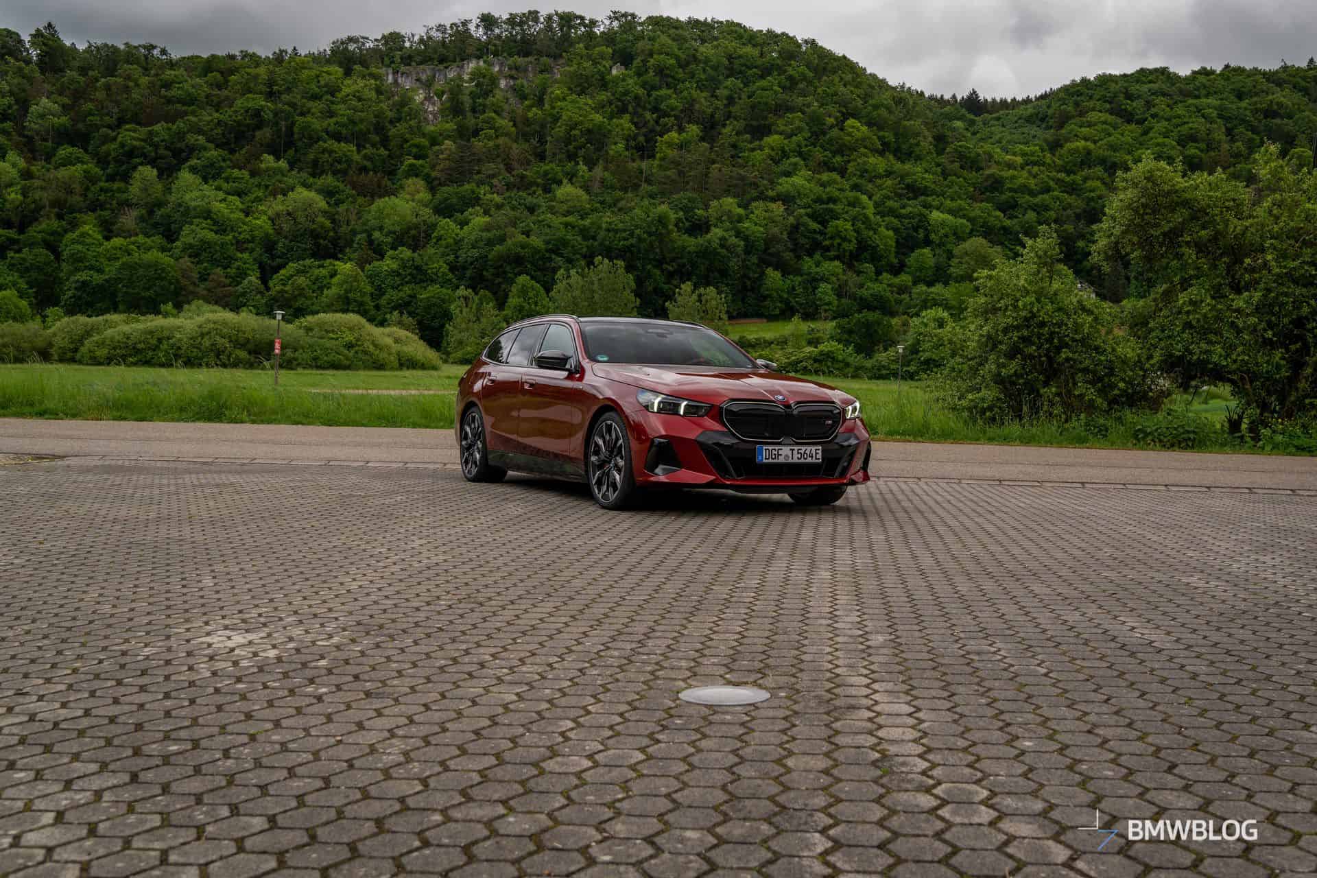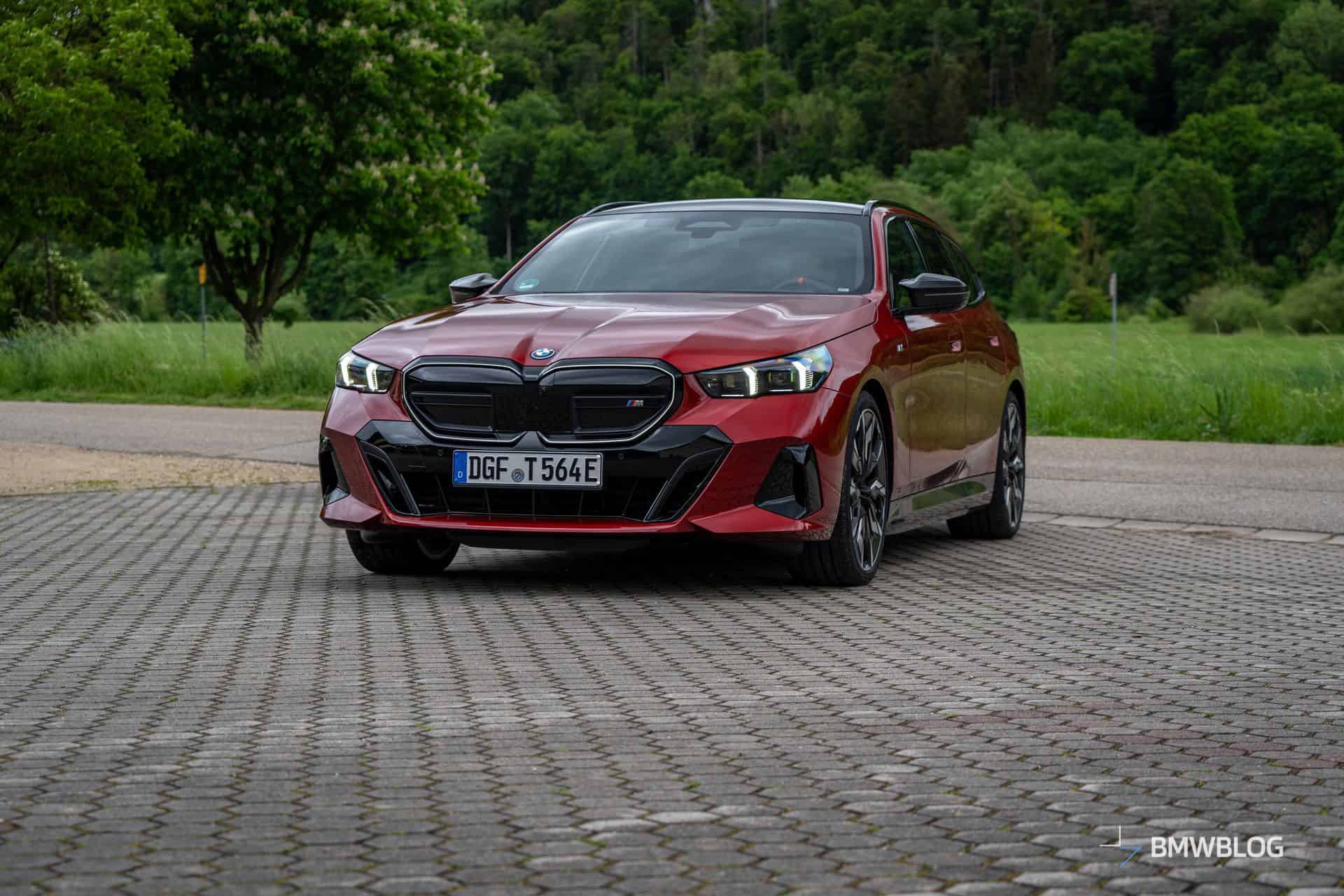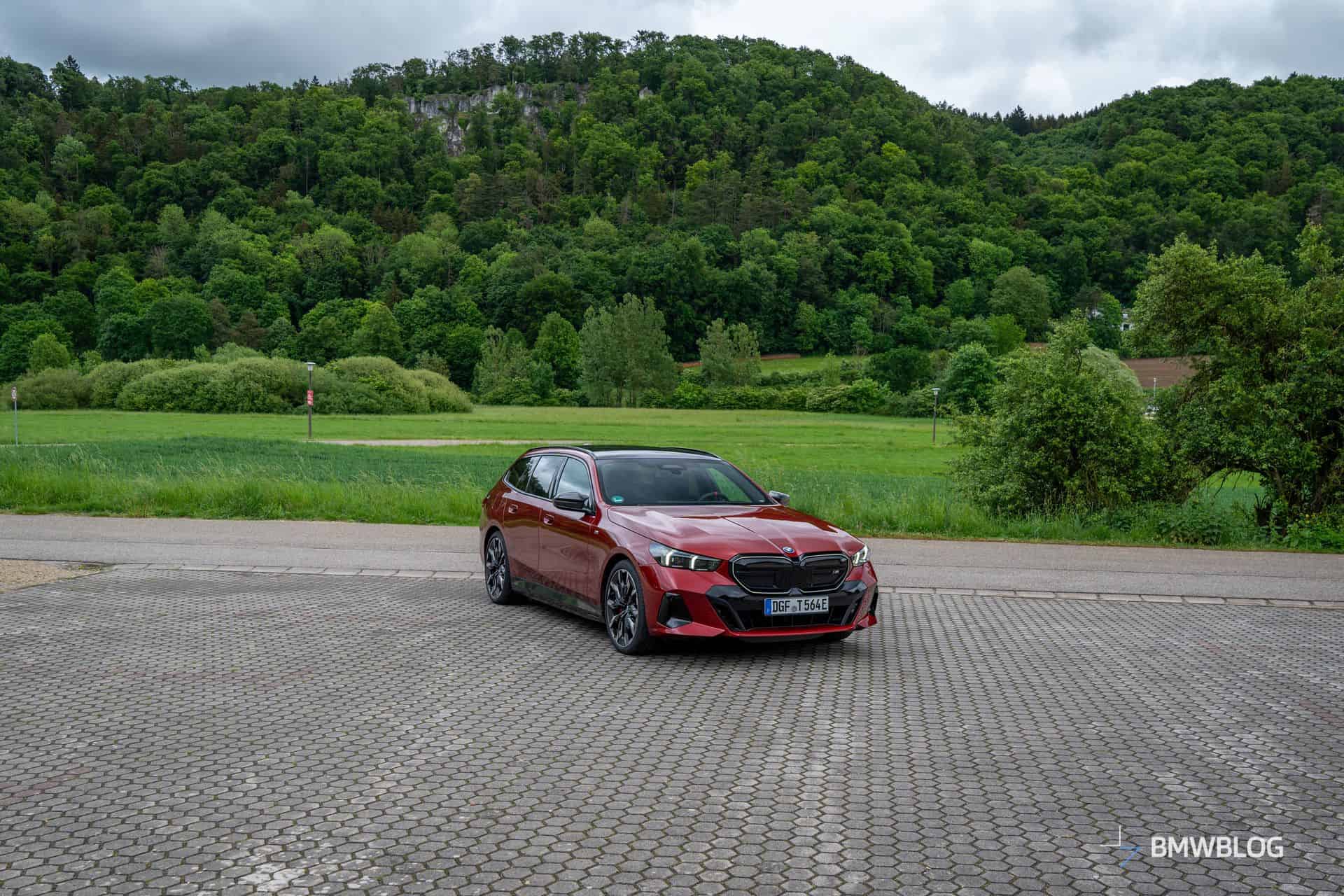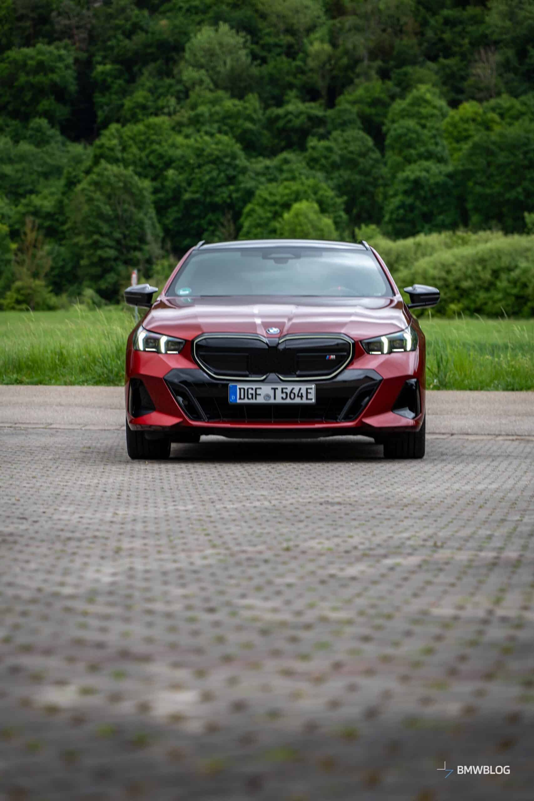 This i5 M60 xDrive Touring is painted in Fire Red, which is identical to the Vegas Red hue offered in the United States where the G61 is sadly not offered. The car we photographed has the largest wheels available for the sixth-generation 5er wagon. It’s a 21-inch aerodynamic set with a two-tone finish and carrying the “954i” codename. While the brake calipers are finished in red, customers can also have them in blue at no extra charge.