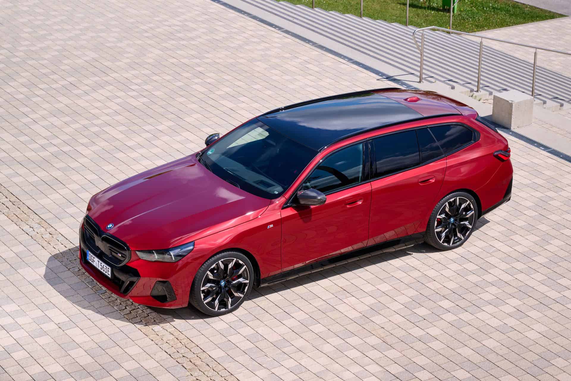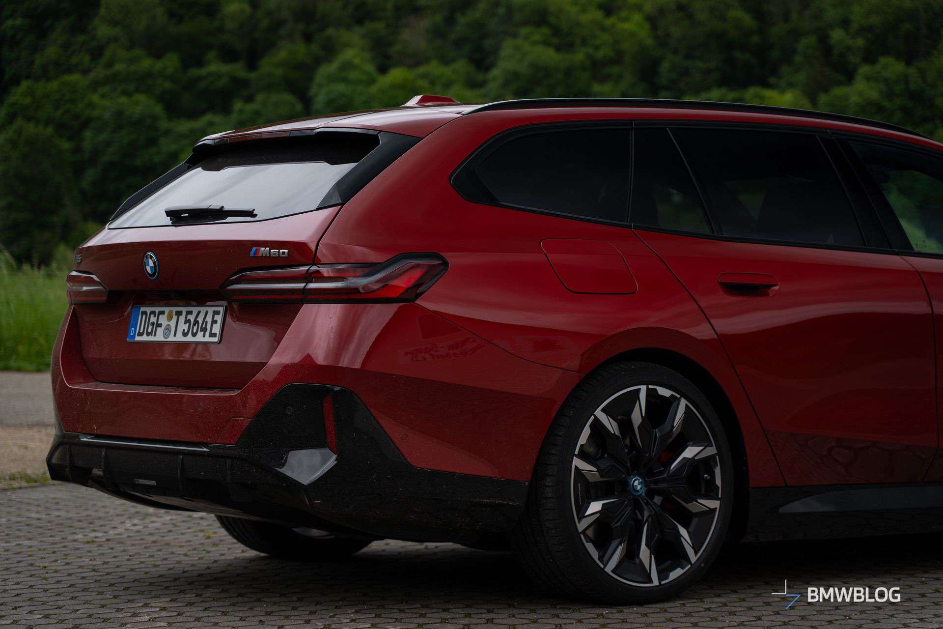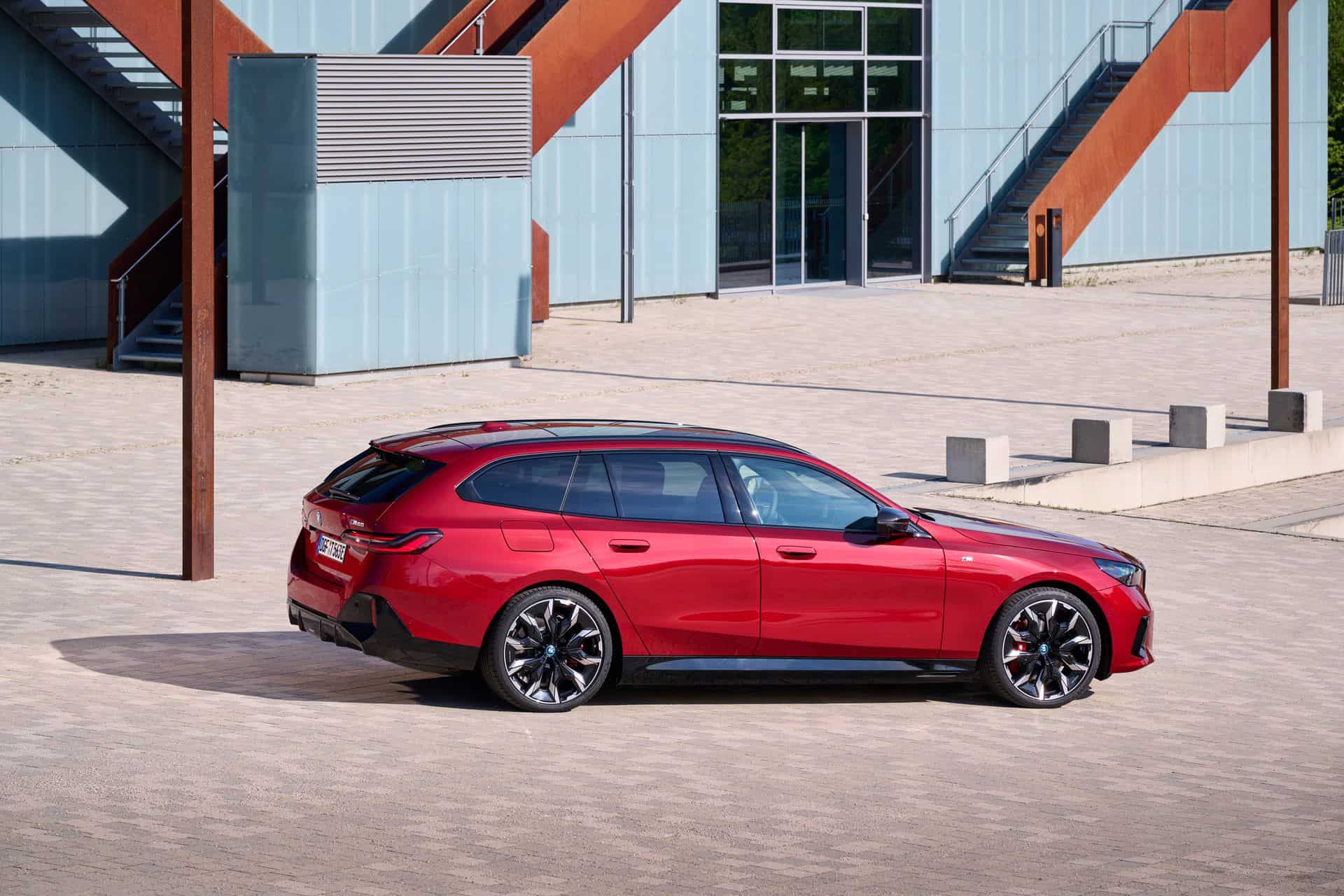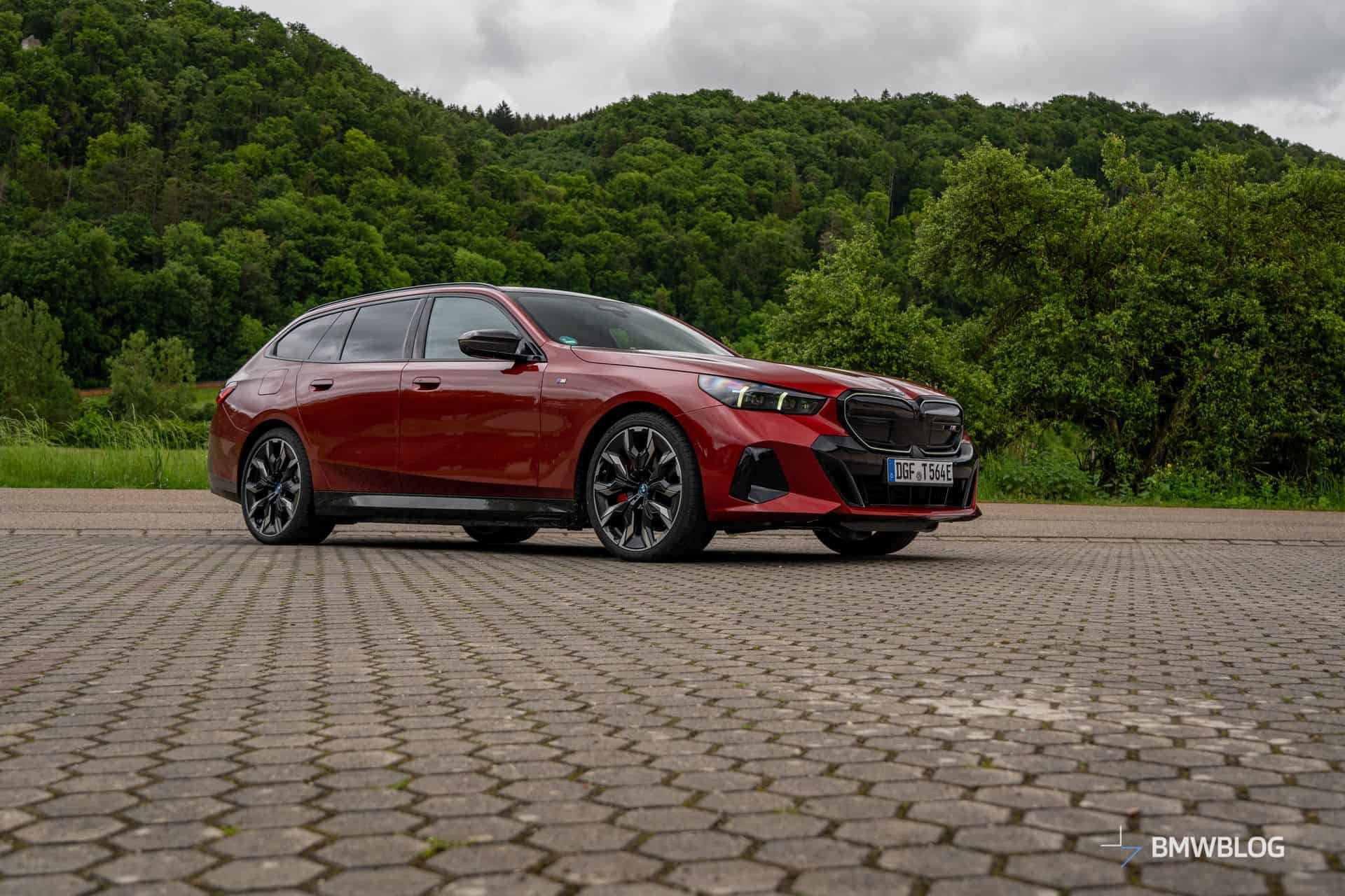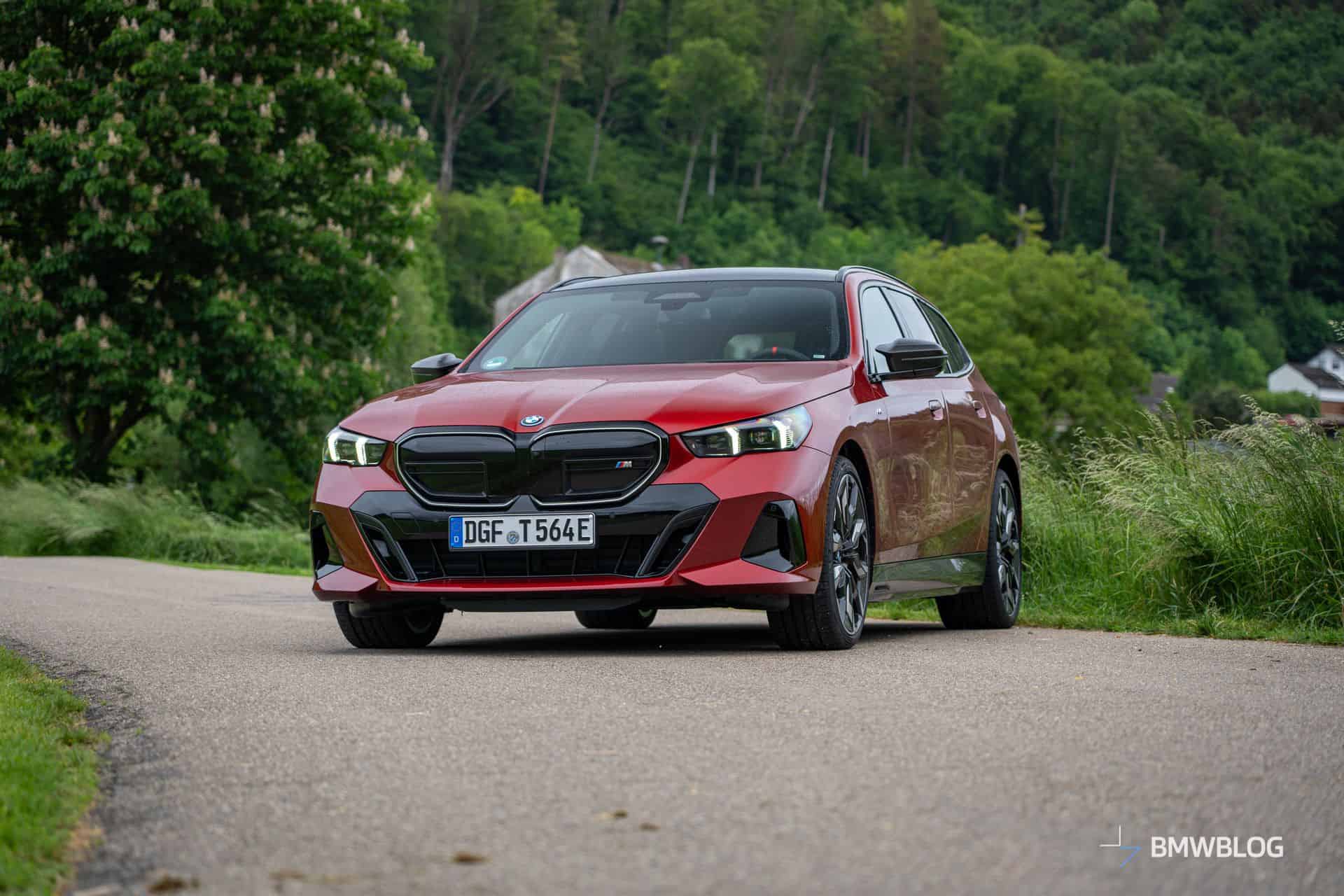 This i5 M60 xDrive Touring is painted in Fire Red, which is identical to the Vegas Red hue offered in the United States where the G61 is sadly not offered. The car we photographed has the largest wheels available for the sixth-generation 5er wagon. It’s a 21-inch aerodynamic set with a two-tone finish and carrying the “954i” codename. While the brake calipers are finished in red, customers can also have them in blue at no extra charge.