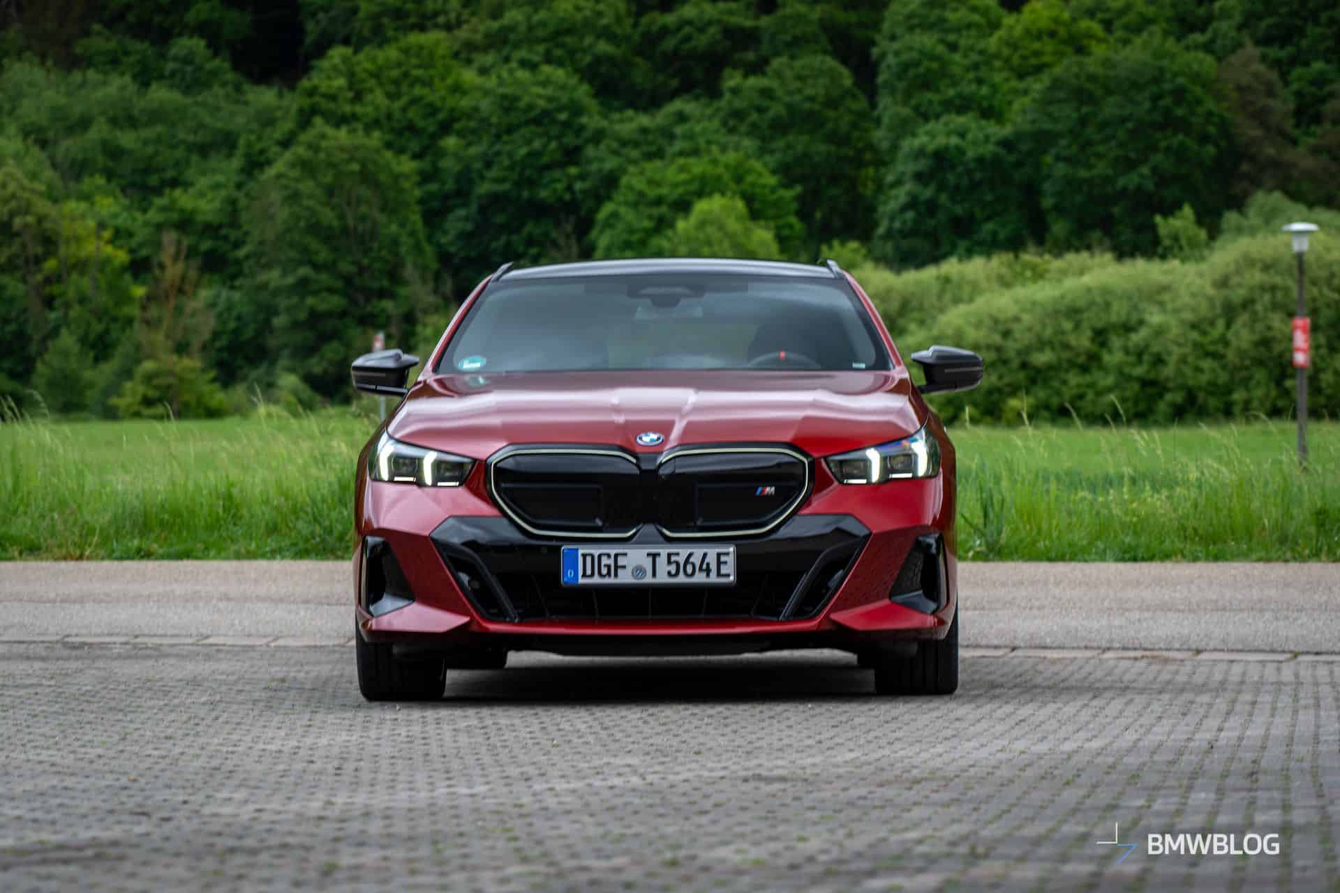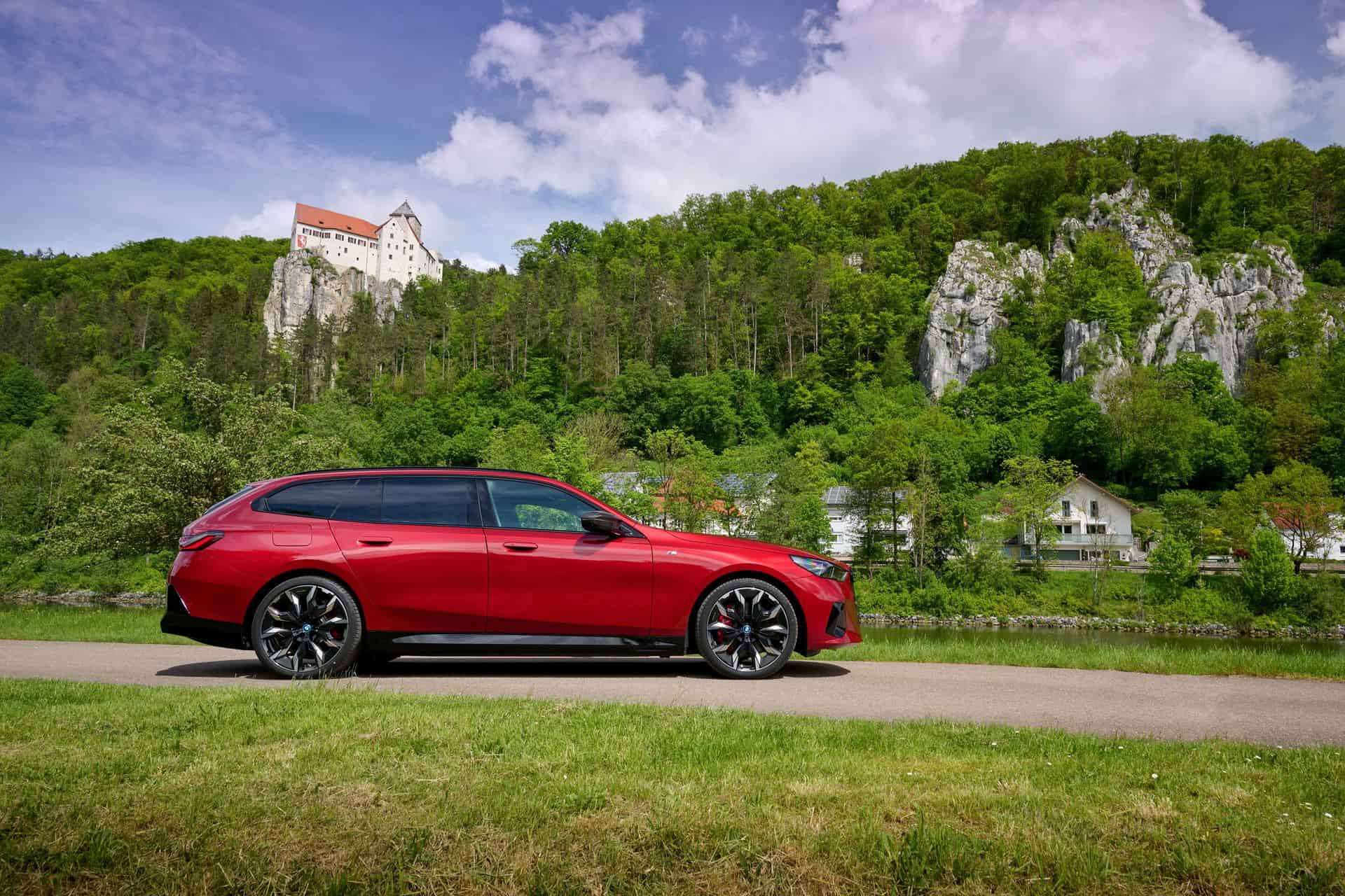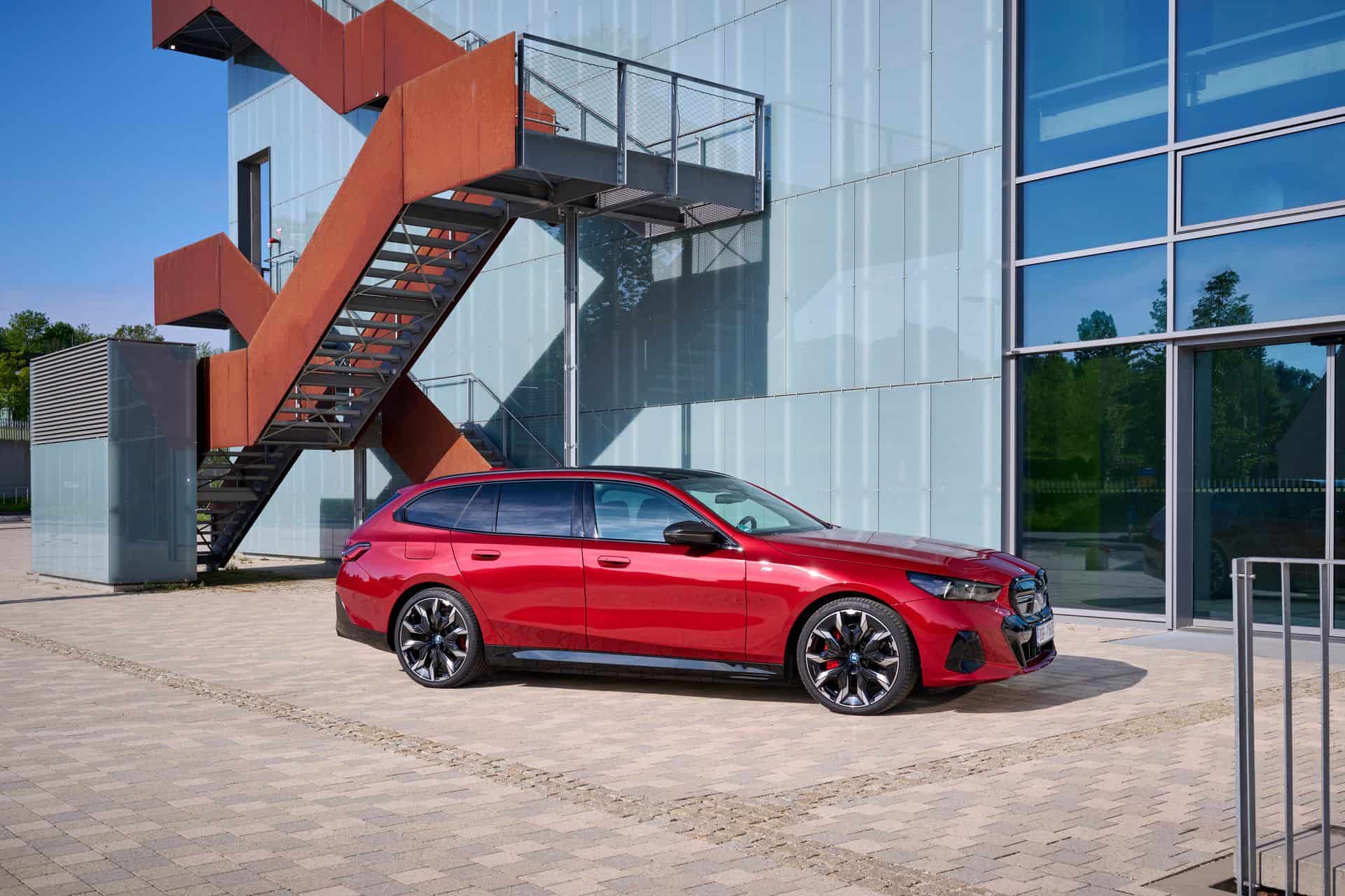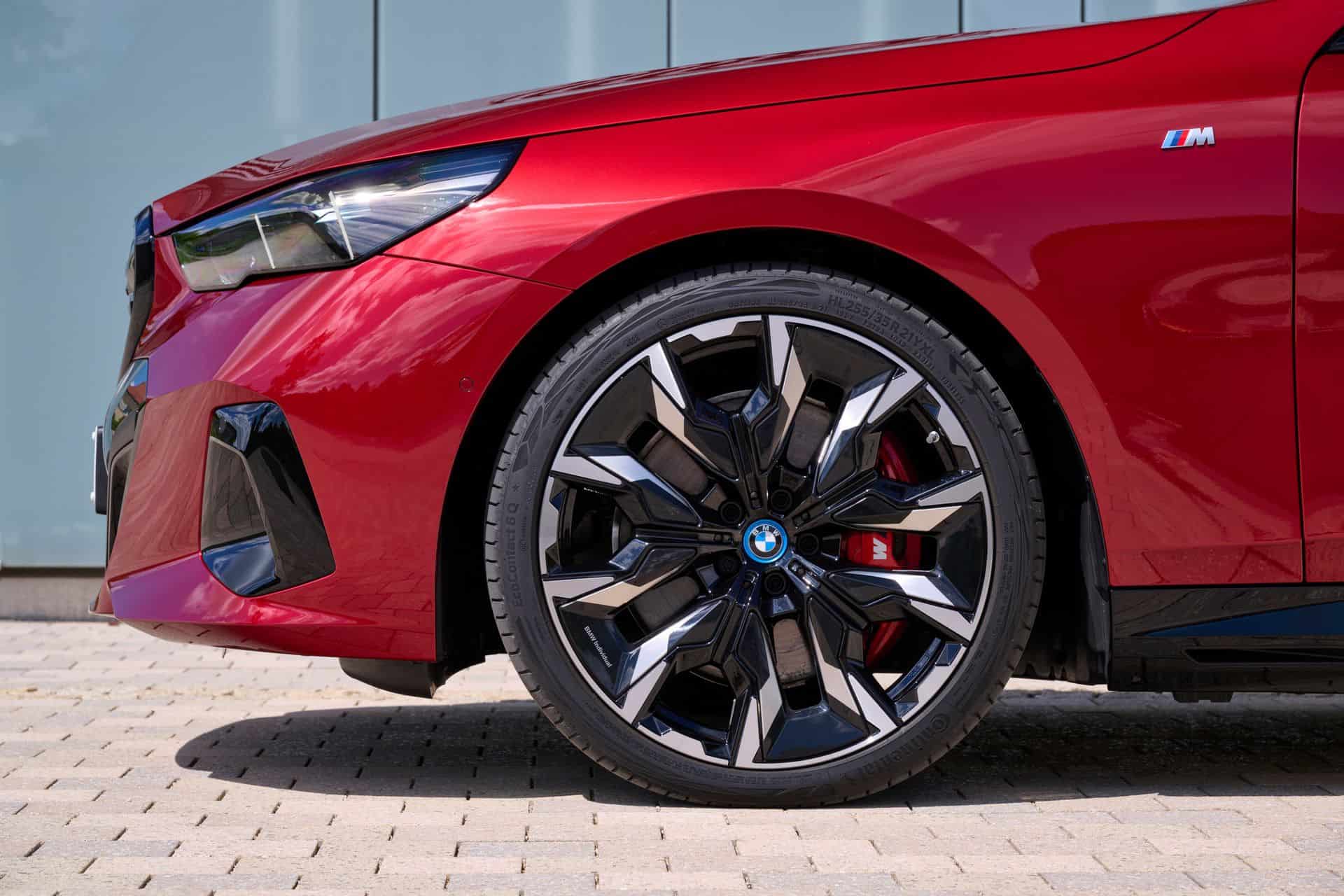 This i5 M60 xDrive Touring is painted in Fire Red, which is identical to the Vegas Red hue offered in the United States where the G61 is sadly not offered. The car we photographed has the largest wheels available for the sixth-generation 5er wagon. It’s a 21-inch aerodynamic set with a two-tone finish and carrying the “954i” codename. While the brake calipers are finished in red, customers can also have them in blue at no extra charge.