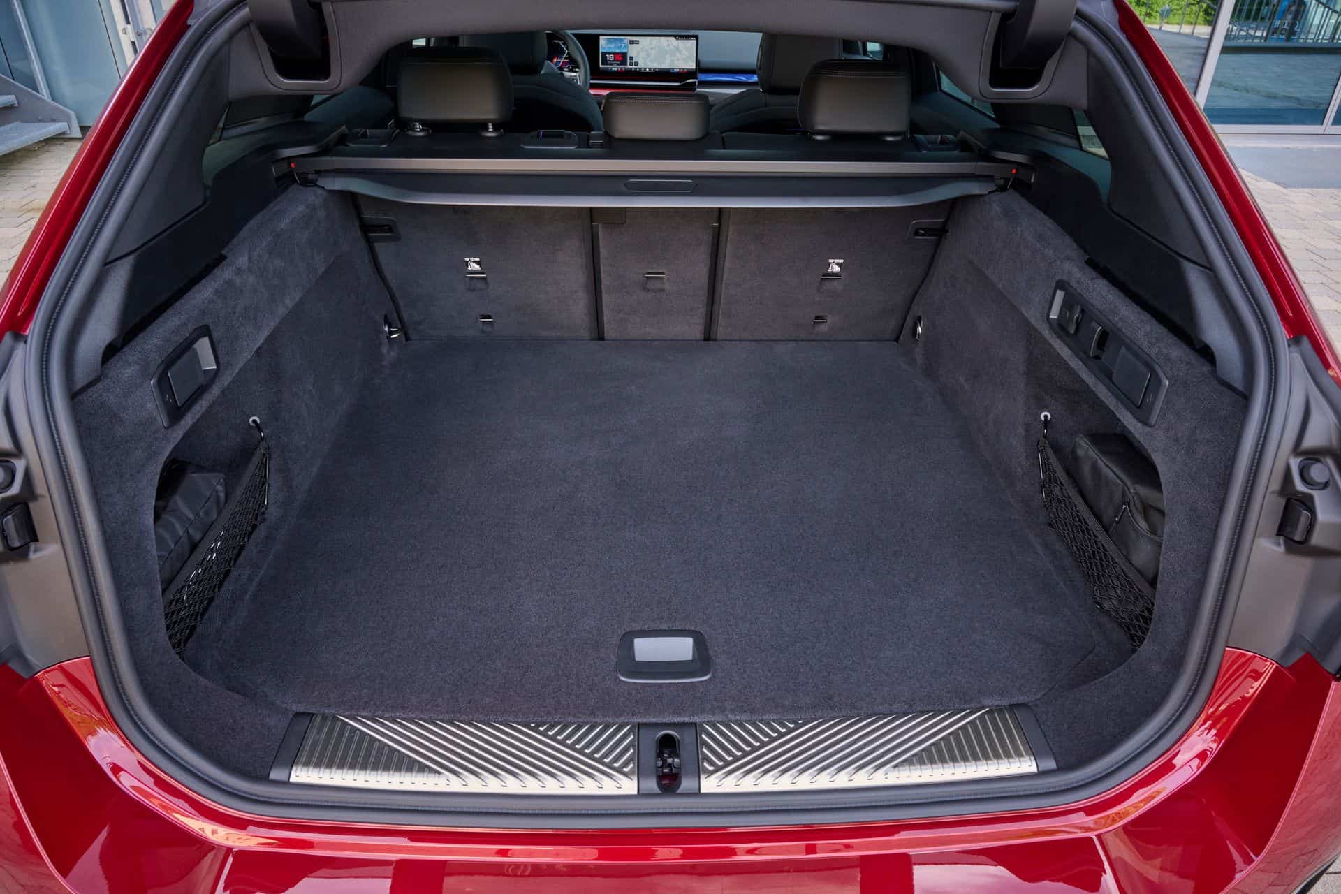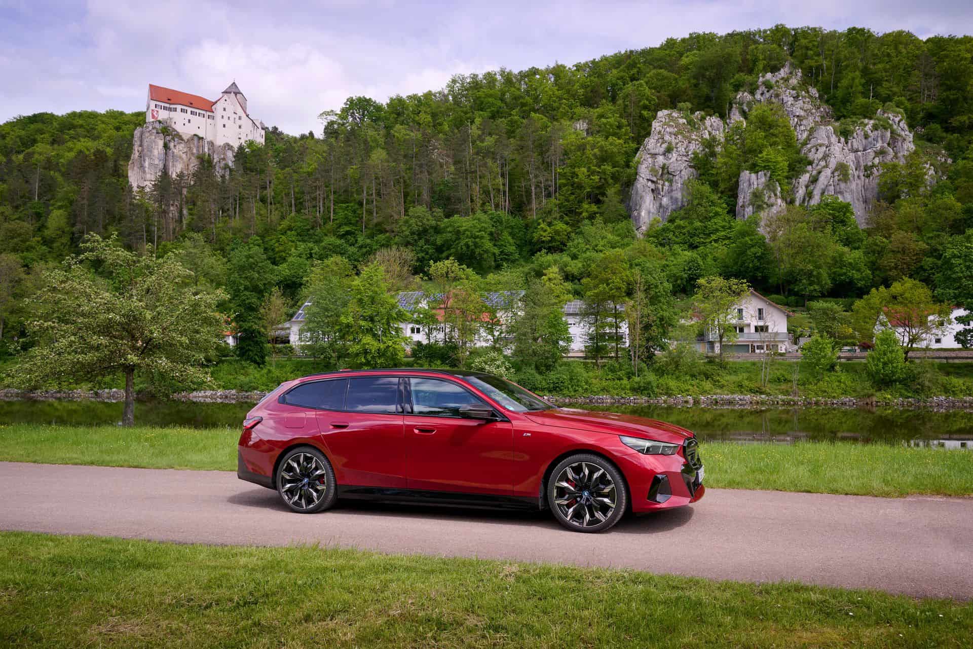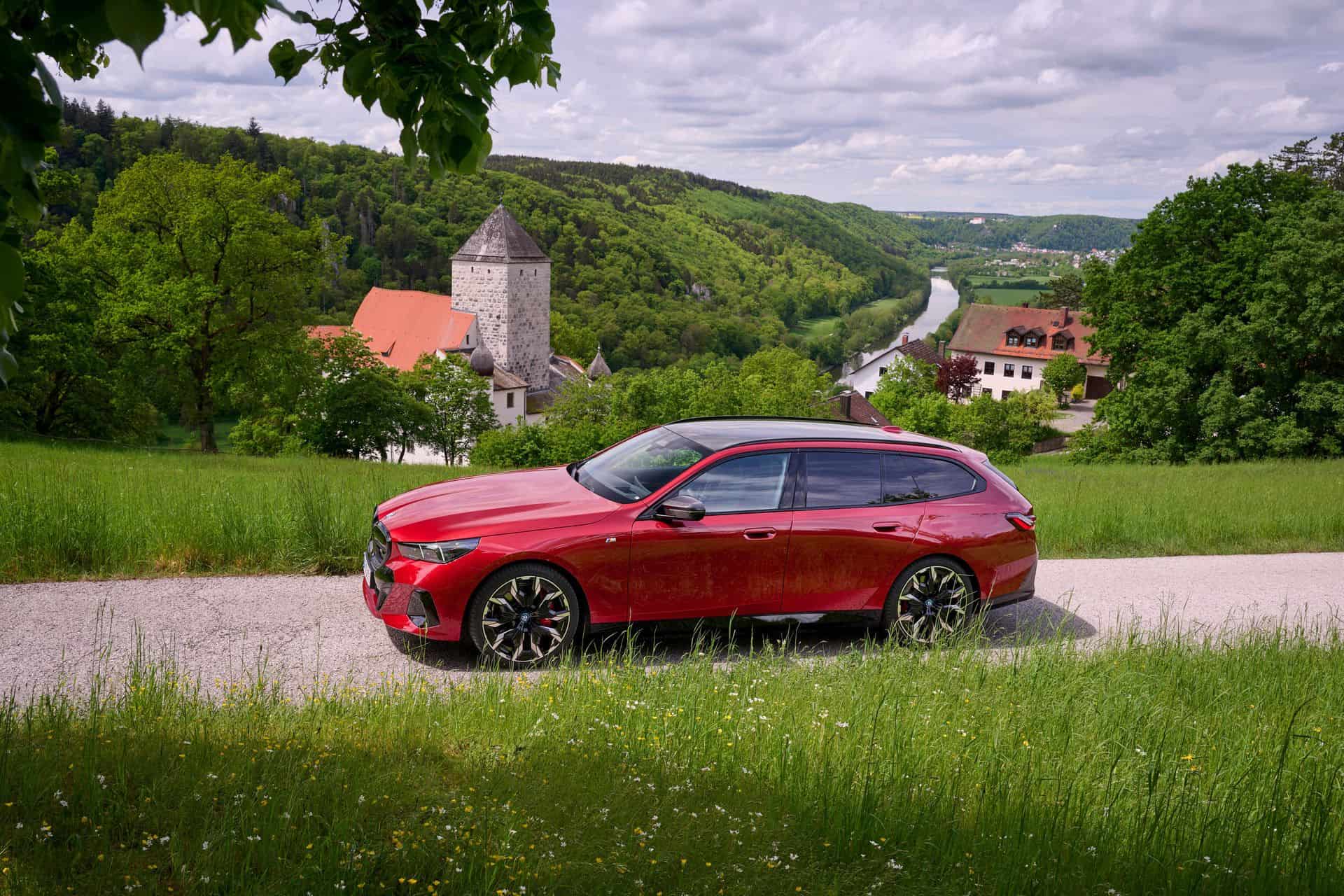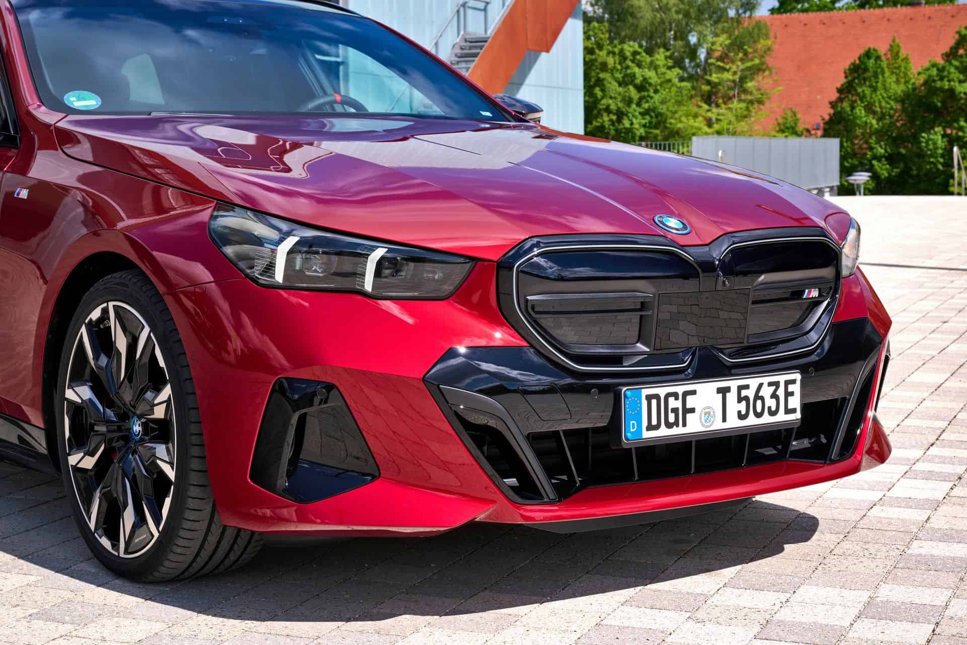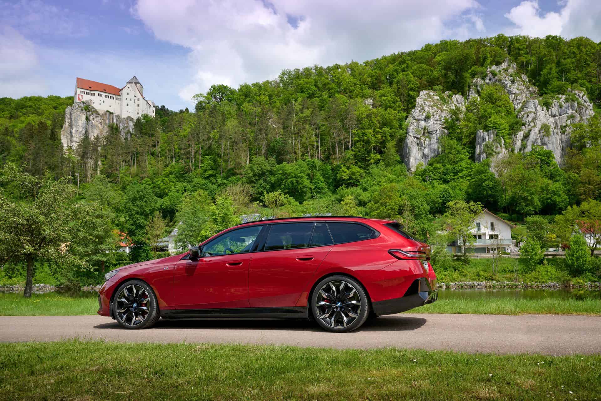 This i5 M60 xDrive Touring is painted in Fire Red, which is identical to the Vegas Red hue offered in the United States where the G61 is sadly not offered. The car we photographed has the largest wheels available for the sixth-generation 5er wagon. It’s a 21-inch aerodynamic set with a two-tone finish and carrying the “954i” codename. While the brake calipers are finished in red, customers can also have them in blue at no extra charge.
